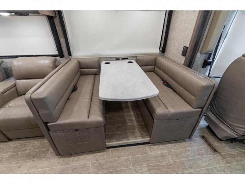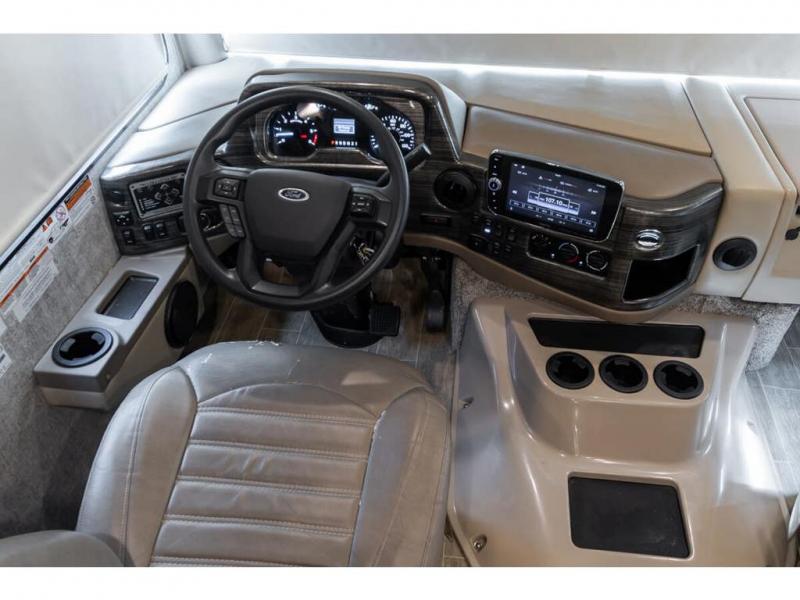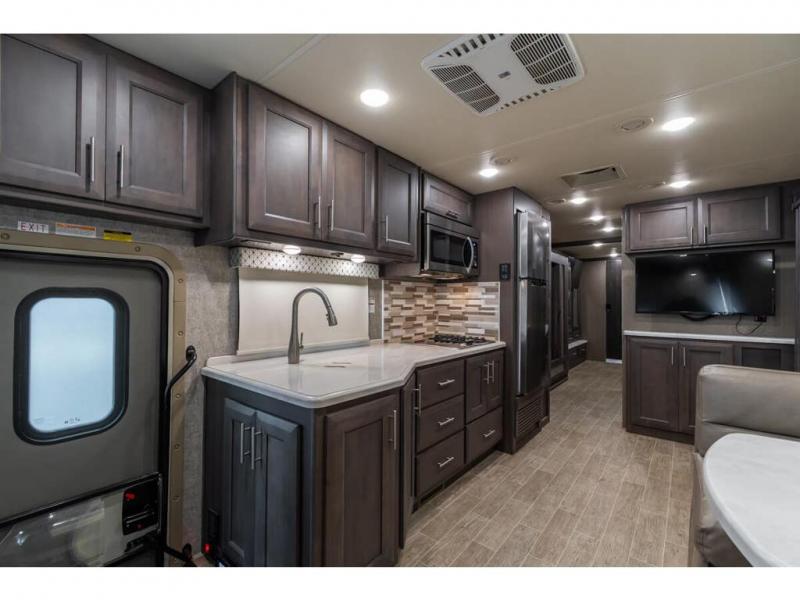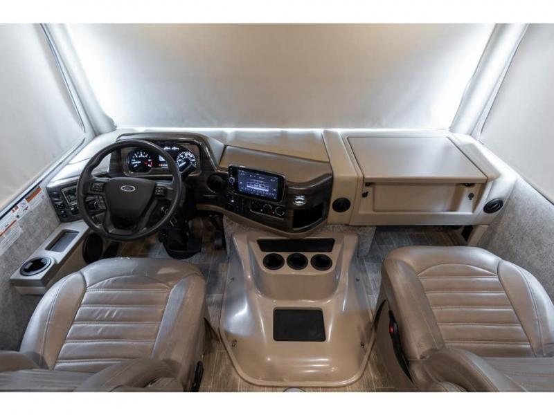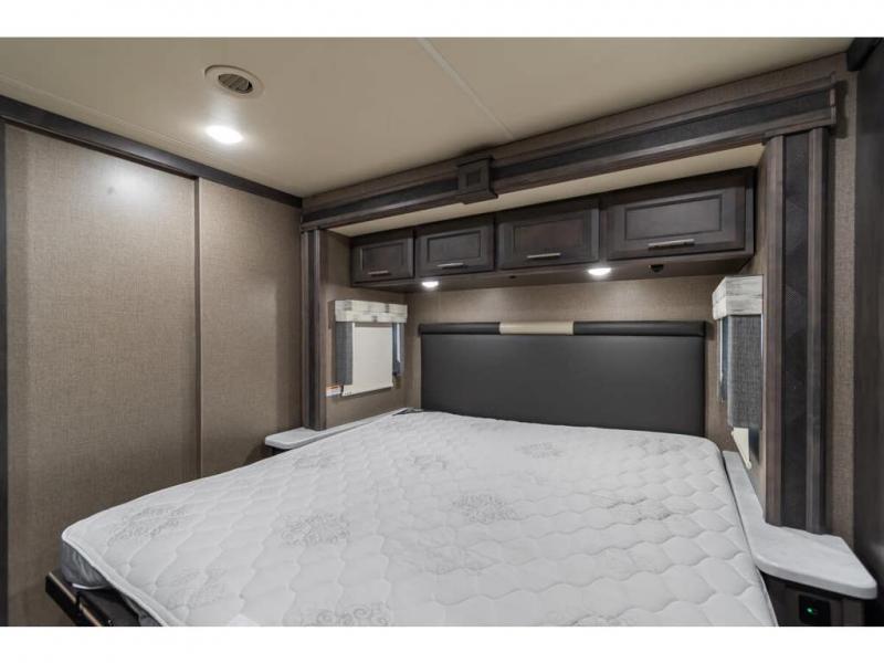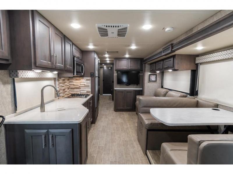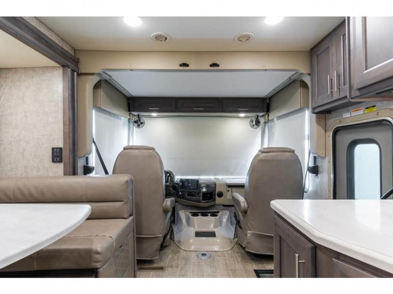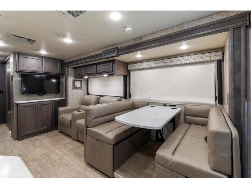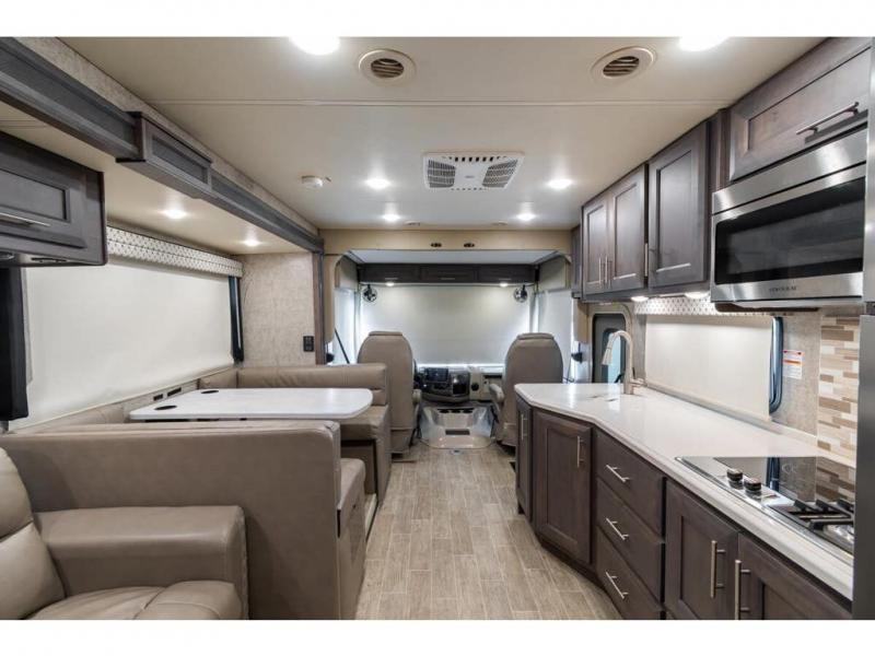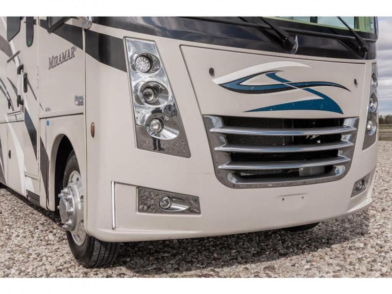 With each Miramar Class A gas motorhome by Thor Motor Coach, there is a welded tubular steel floor with welded tubular aluminum roof and sidewall cage construction, plus a crown roof, and one-piece fiberglass front and rear caps to mention a few features in the construction of each coach. The driver will appreciate the 10.1" touchscreen dash radio with Bluetooth, Axerra navigation and is SiriusXM ready, plus the steering wheel audio control, the back-up monitor, and the heated/swivel leatherette captain's chairs. The interior offers a 7-foot tall ceiling height for spaciousness, residential vinyl flooring for easy care, solid surface kitchen countertops for style, USB charging ports in the bedroom and living area to keep the electronics charged, and RapidCamp+ multiplex wiring control system, plus so much more making traveling and scenic detours that much more fun!