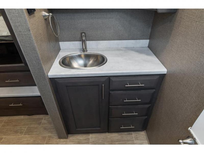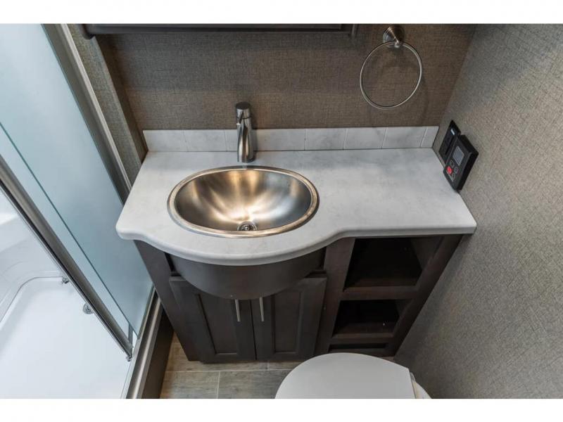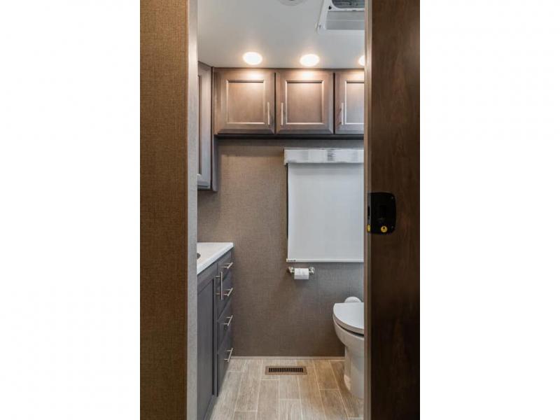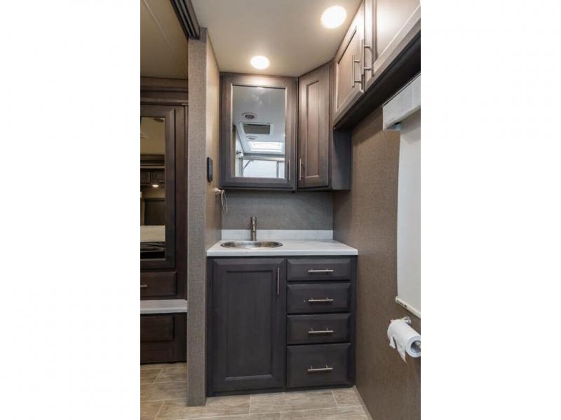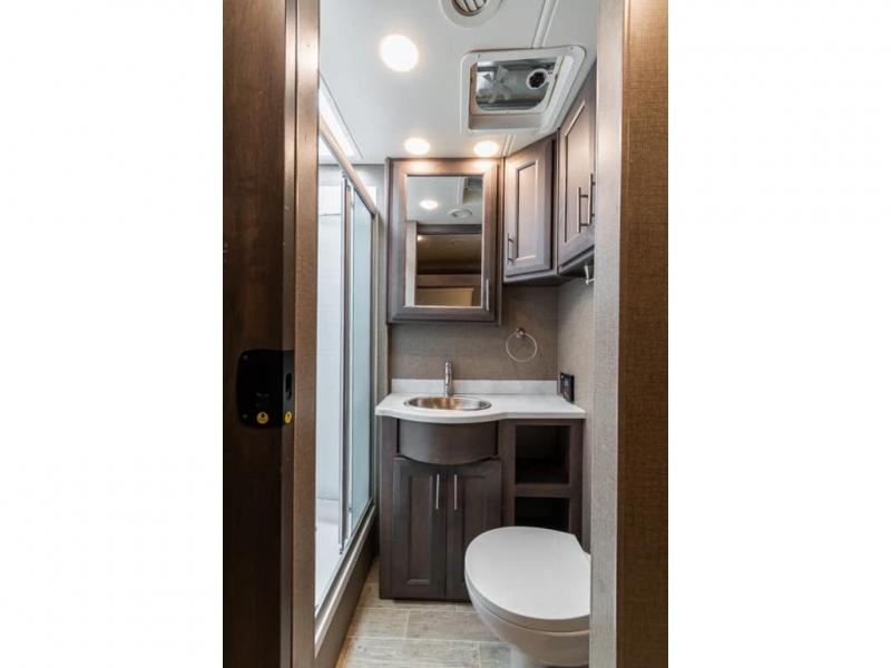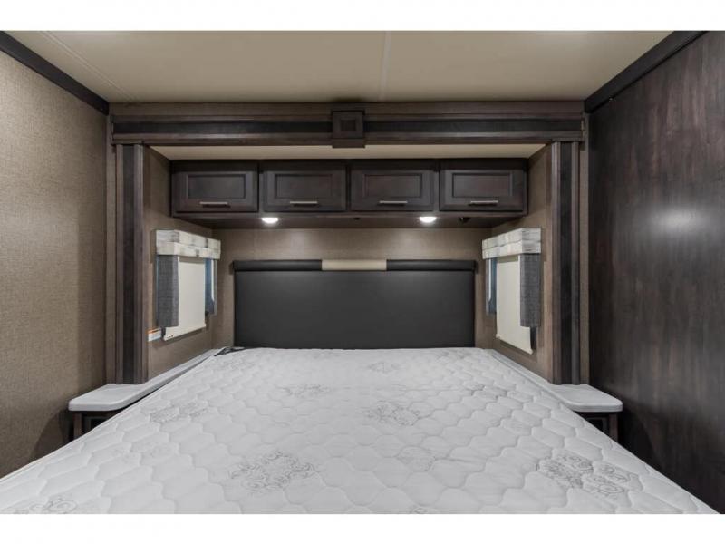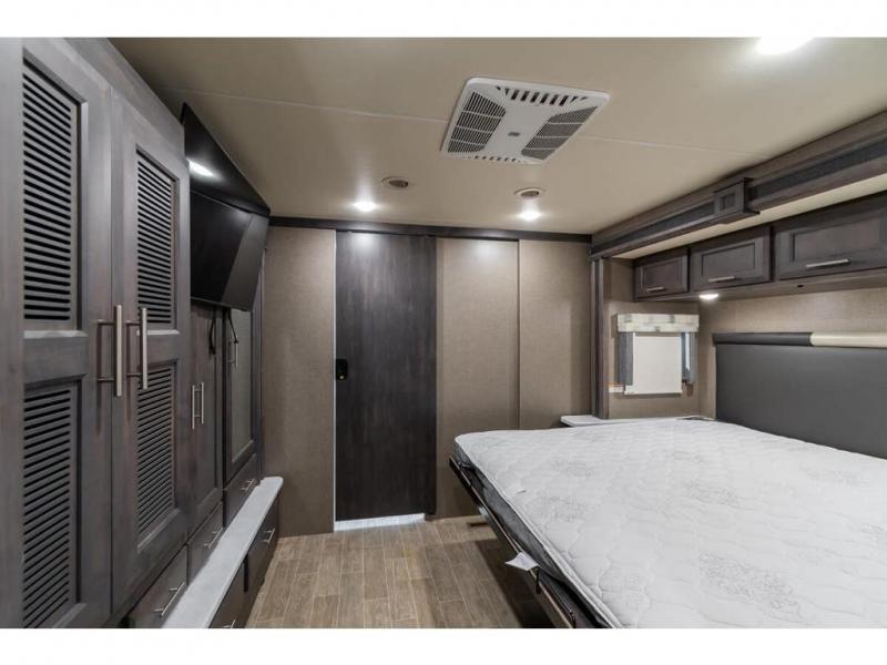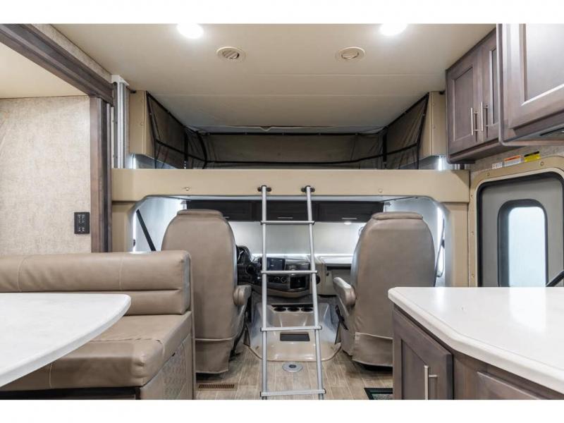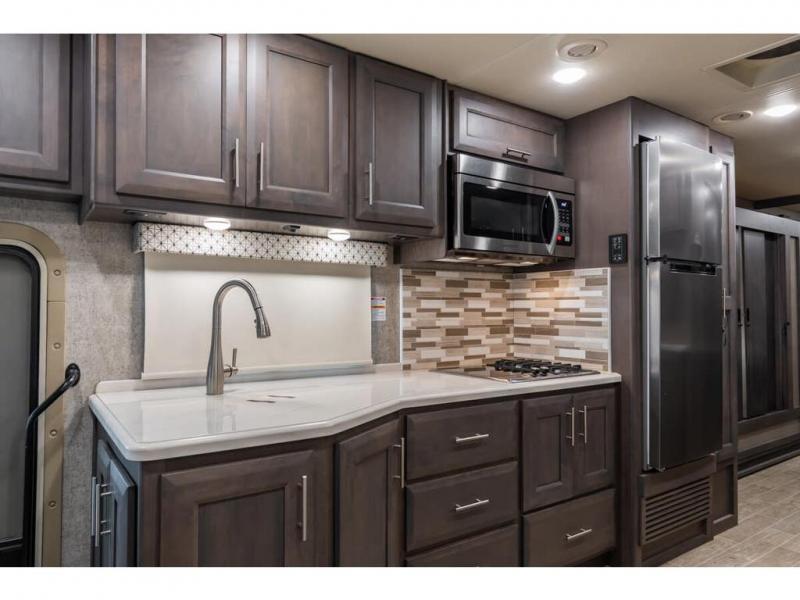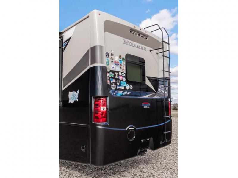 With each Miramar Class A gas motorhome by Thor Motor Coach, there is a welded tubular steel floor with welded tubular aluminum roof and sidewall cage construction, plus a crown roof, and one-piece fiberglass front and rear caps to mention a few features in the construction of each coach. The driver will appreciate the 10.1" touchscreen dash radio with Bluetooth, Axerra navigation and is SiriusXM ready, plus the steering wheel audio control, the back-up monitor, and the heated/swivel leatherette captain's chairs. The interior offers a 7-foot tall ceiling height for spaciousness, residential vinyl flooring for easy care, solid surface kitchen countertops for style, USB charging ports in the bedroom and living area to keep the electronics charged, and RapidCamp+ multiplex wiring control system, plus so much more making traveling and scenic detours that much more fun!
