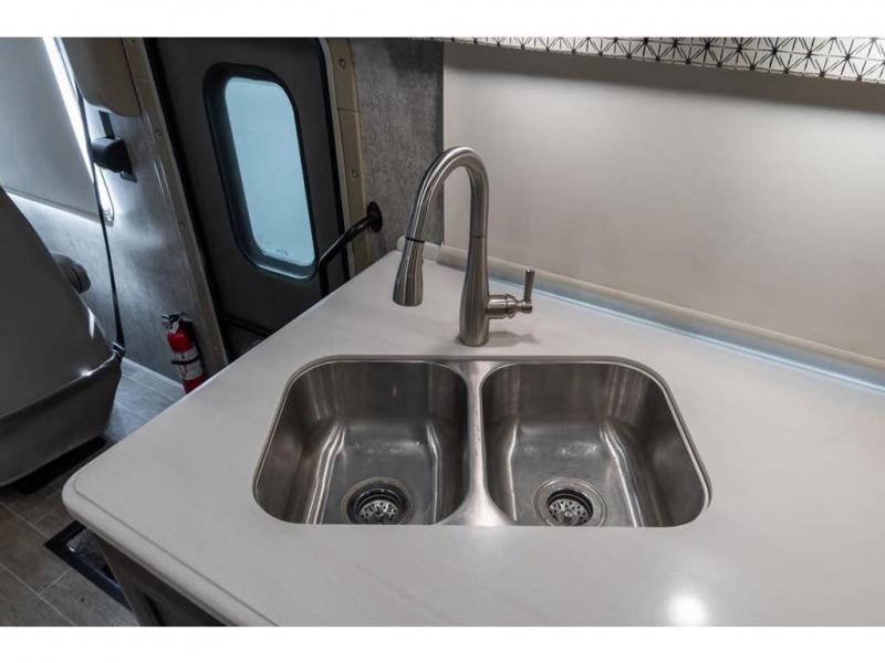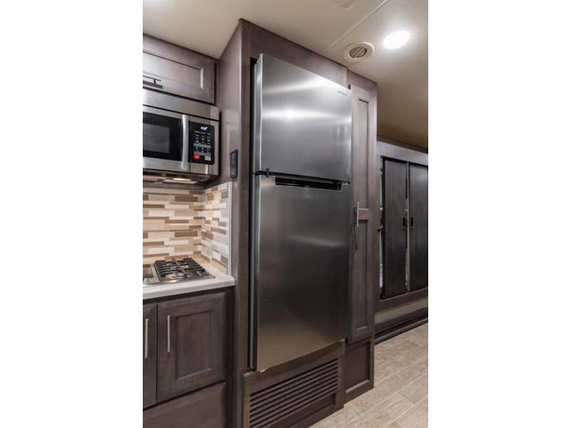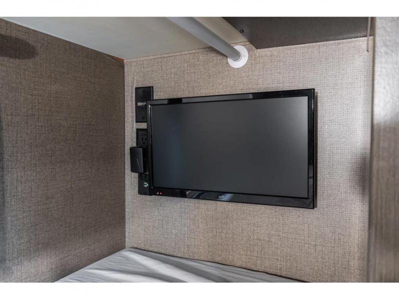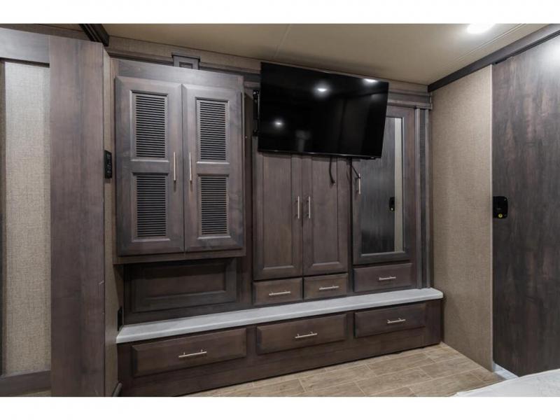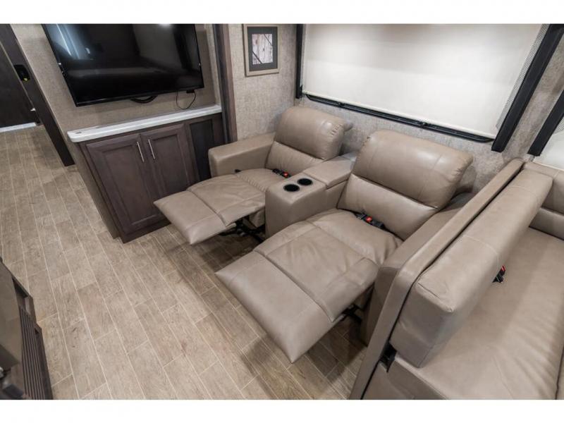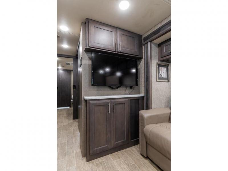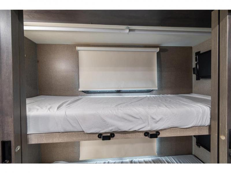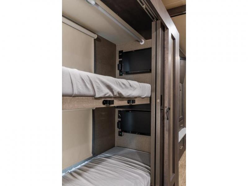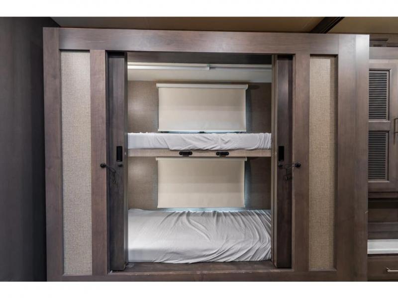 A family of seven to nine can travel and stay in comfort in this three slide out coach! You will find seatbelts on the furniture from the captain's chairs that swivel once at your destination to the sofa bed and dinette, everyone can be secure the whole trip. And convenience is found with two full bathrooms, so getting ready for adventure or bedtime is made more efficient, and the bunk beds as well as the drop-down overhead bunk will be the kids favorite spot! The cook will have full amenities to keep everyone fed from the convection microwave to the residential refrigerator, and the Always-In-View 39" LED TV with fireplace below will be a great escape after a fun day. When you are ready for bed, head back to your master suite with a full bathroom, a Tilt-A-View inclining king bed, a 32" LED TV and more!