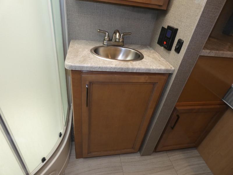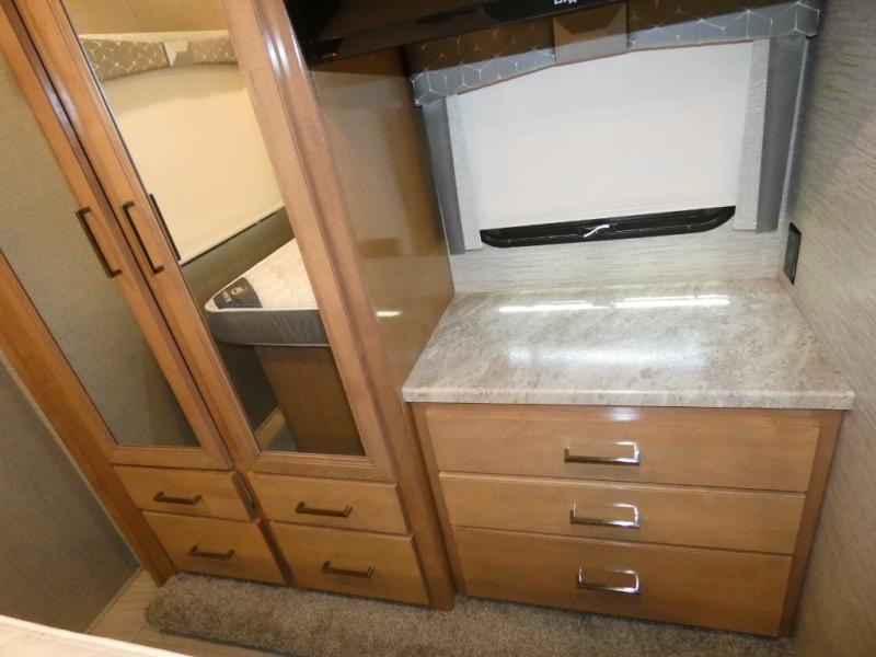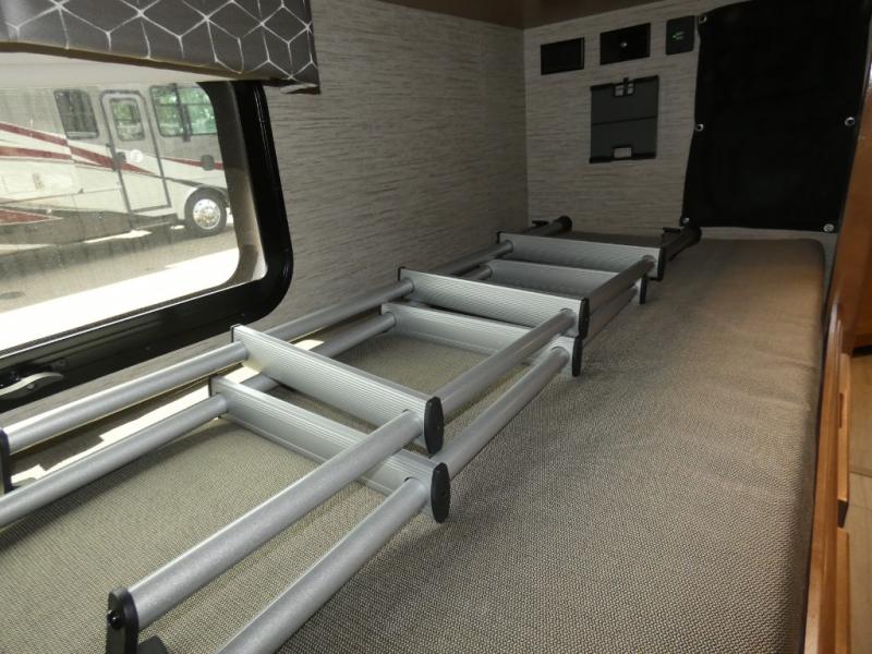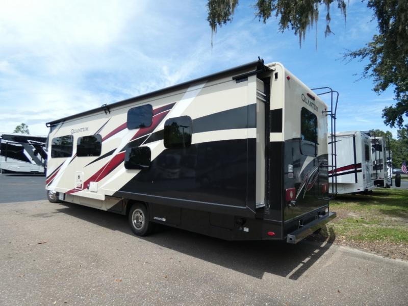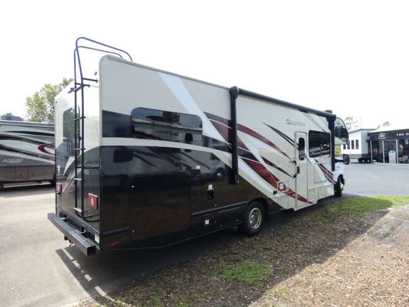 Step inside this Quantum Class C gas motorhome and see just how luxurious of a trip you will have! From the pantry for storing your favorite snacks and the queen bed for a good night's rest to the 39" TV with a swivel and the built-in skylight over the 54" x 96" bunk above the cab, you will be impressed. If you don't feel like watching TV indoors, then head outside and enjoy watching the big game on the exterior 32" TV while you stay protected from the sun with the 16' power awning with LED lighting. The dual-entry bath makes it easy for anyone to access, especially those who get the pleasure of staying in the rear master bedroom!