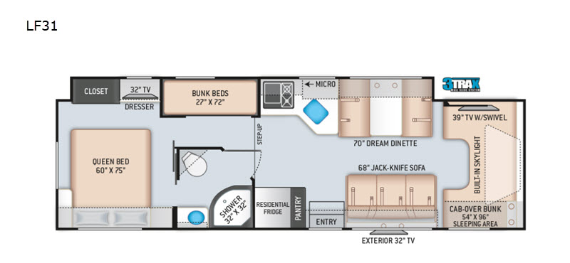 | TV Info | Cab 39" TV, BR 32" TV, Bunk (2) TVs, Ext. 32" TV |