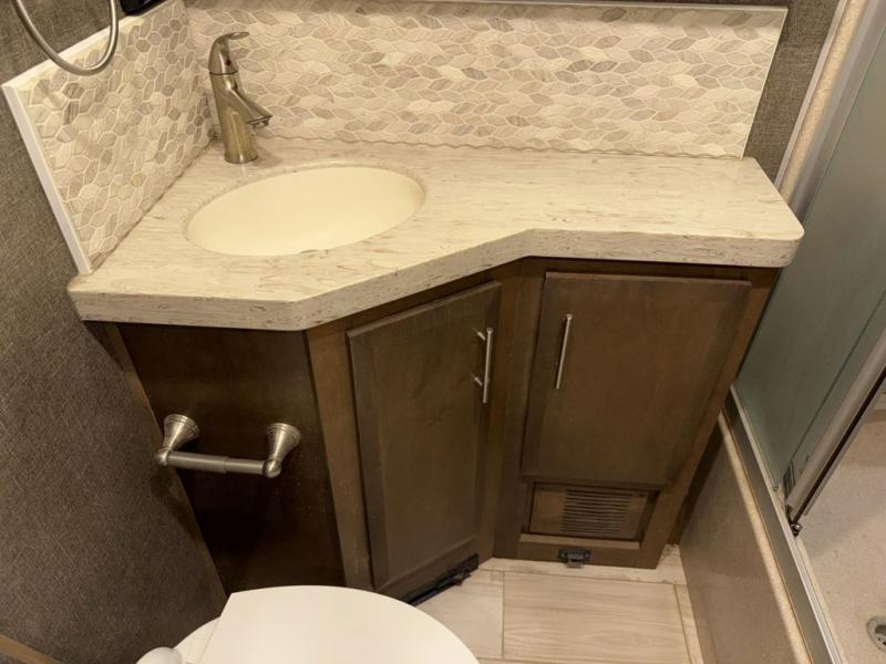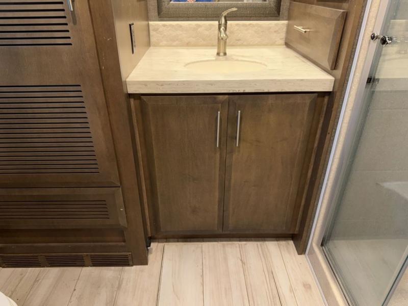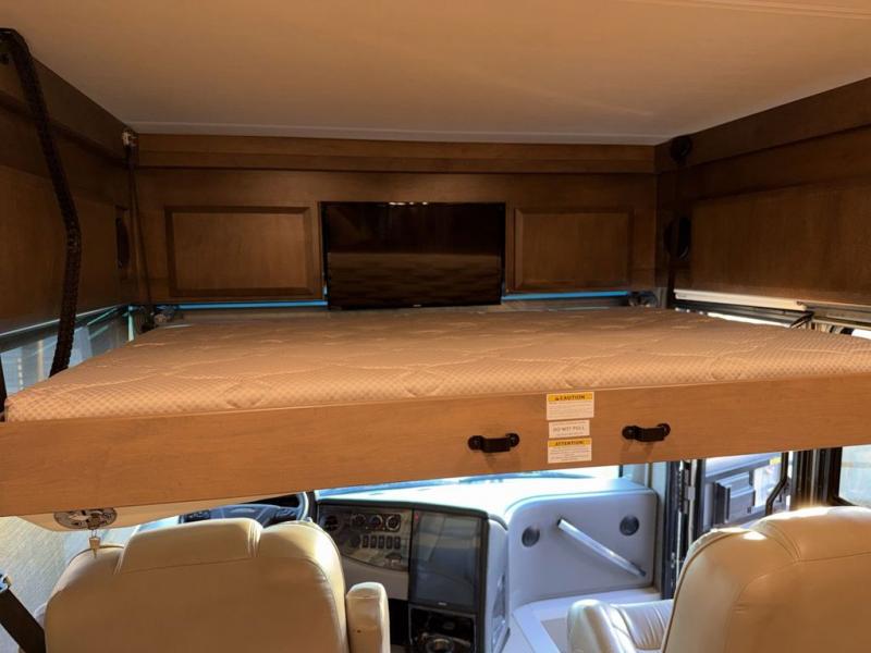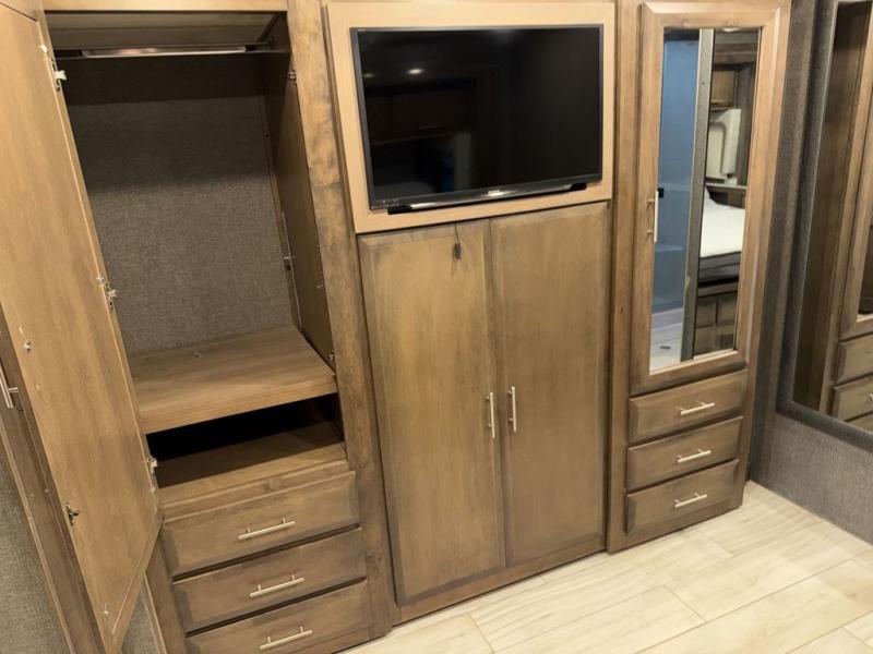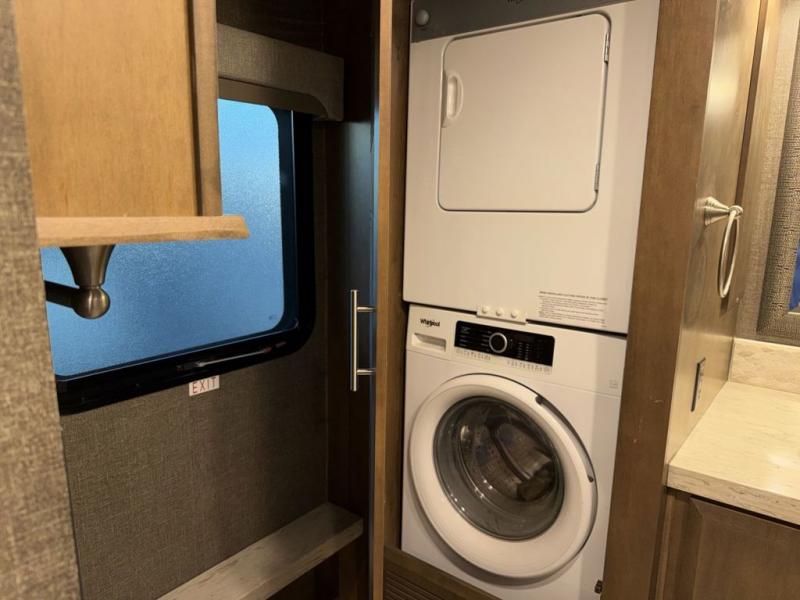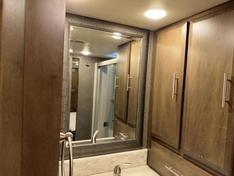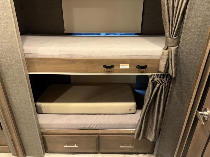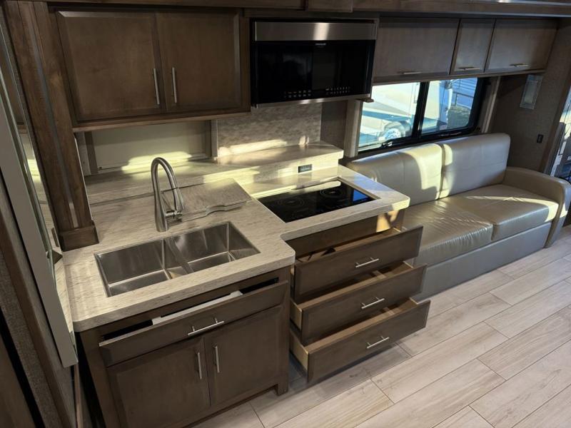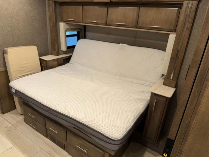 This Venetian Class A diesel motorhome offers you luxury with your own master suite in the back, and your kids will stay busy with the tablet holder and USB port in the bunks if it's raining outside. Just imagine having your own full bathroom while the younger ones have their own full bathroom as well, right across from the bunk beds. The main living area even offers extra sleeping space with a drop-down bunk above the cab, an 80" sofa bed, and a 90" Dream Dinette. You will also love having two pantries and a 21 cu. ft. stainless steel residential refrigerator to stock up on snacks and ingredients to make your famous desserts. This is the one if you enjoy luxury, convenience, and family on the open road!