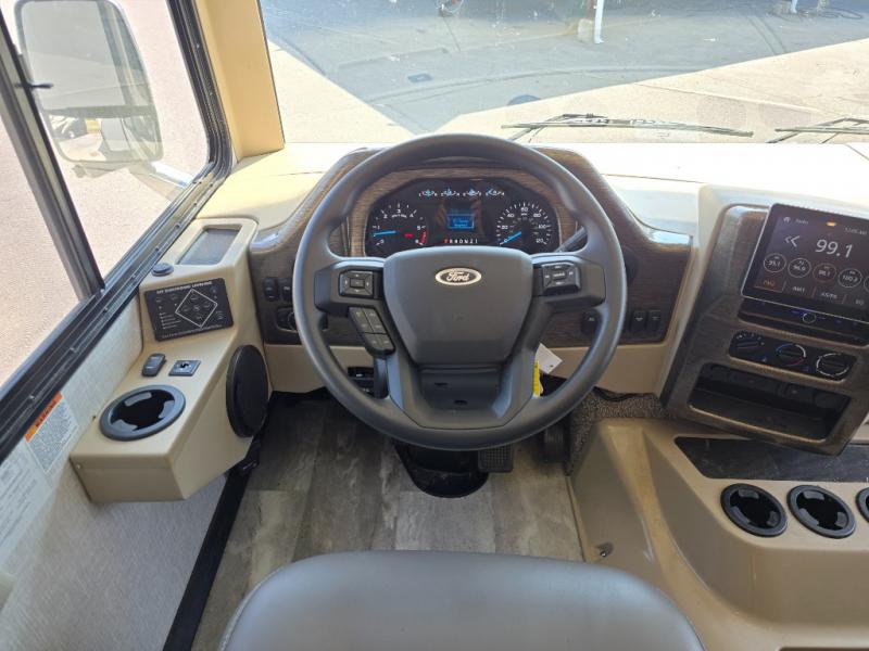 You will find there is much to love about the Thor Motor Coach Windsport Class A gas motorhomes, whether you are out for a long road trip across the country or a weekend reunion with family. All Windsport models feature Leatherette furniture, solid surface kitchen countertops, and flat panel upper cabinet doors with black nickel finish hardware and glass inserts on select doors. With the swivel and reclining captain's chairs featured in these coaches, you can easily bring them into the conversation area in the living space once parked. Each unit includes a dash workstation with 110-volt and 12-volt outlets at the passenger side for those who need to take work with them on the road or for those who just enjoy surfing the internet. On the outside, enjoy Rotocast storage compartments, a Pet-Link multi-purpose tie down, and a legless lateral power awning with integrated LED lighting.