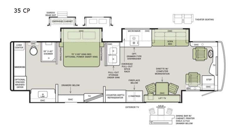| TV Info | Cab Flat Panel TV, LR Lift TV, BR TV, Ext Flat Panel TV |