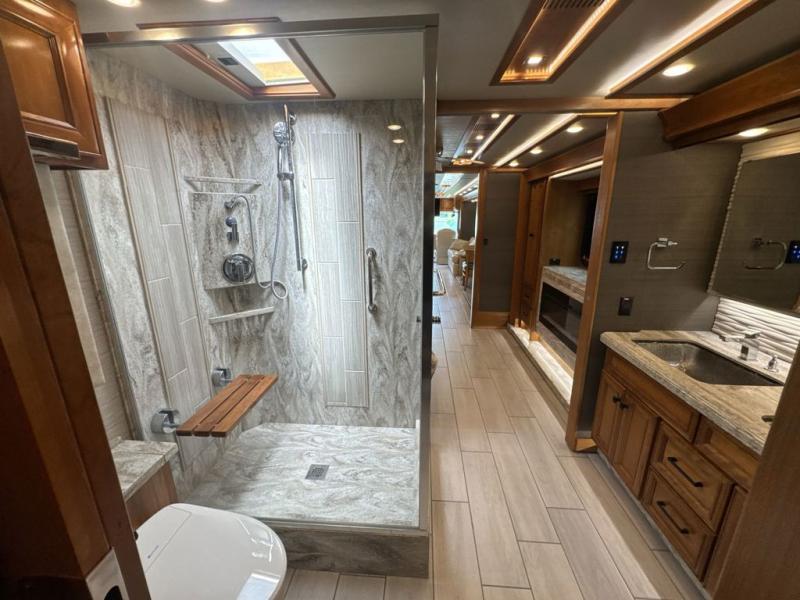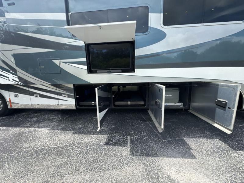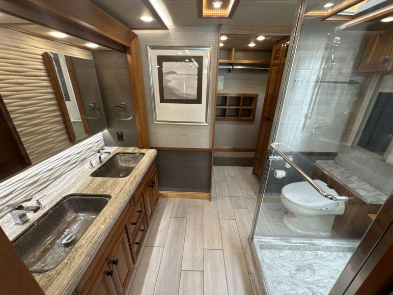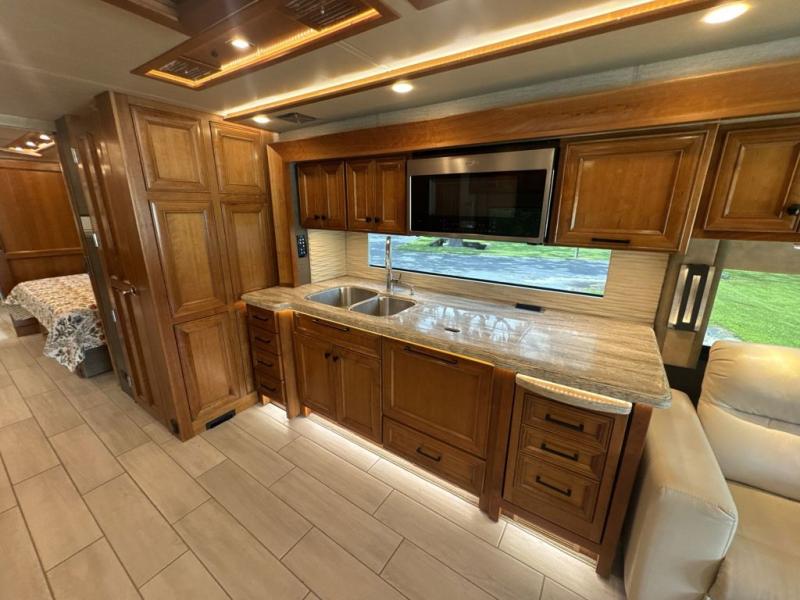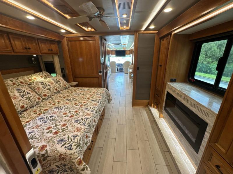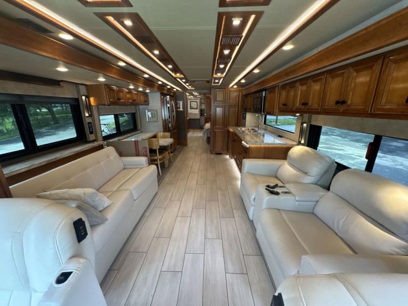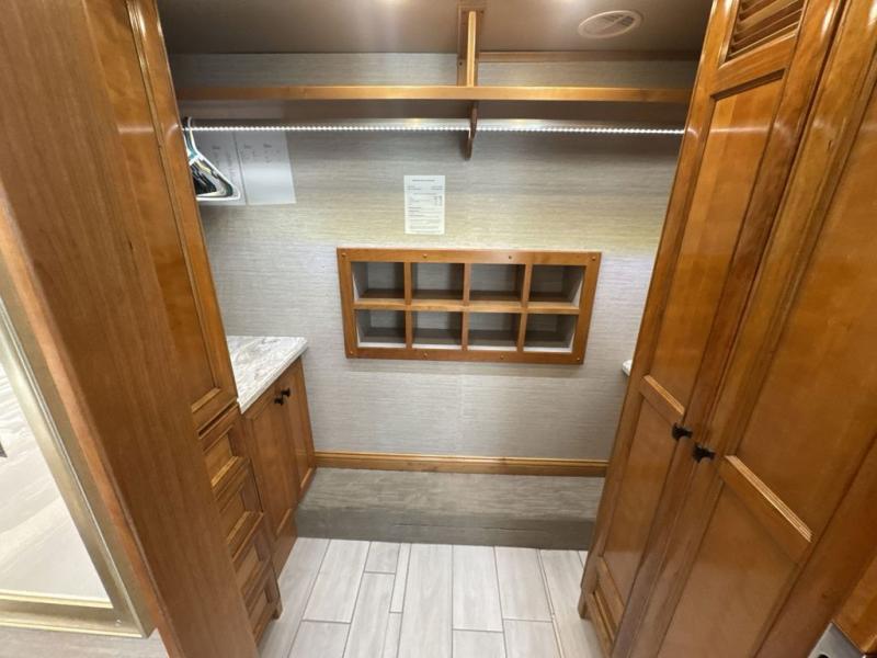 With four slides, two sofa beds, a dinette/computer station with chairs and captain's chairs, your family will have plenty of walking around space and seating. There is an ottoman as well. You and your spouse will love the master suite that includes a king bed with nightstands, a TV, dual bath sinks in the full bath, and a floor-to-ceiling closet that allows you to bring all of your belongings along. You might even like to add a washer/dryer option to the prepped space. The chef of the family will love cooking in this kitchen that features a two-burner induction cooktop, an expand-an-island for more counter space, a residential refrigerator, and two pantries for all the dry goods. You might even like to add a few options such as a U-shaped booth dinette, two leather recliners with a small table, and/or an outdoor grill center, and more. You can also choose the 605 HP option with a Cummins X15 and 605 HP!