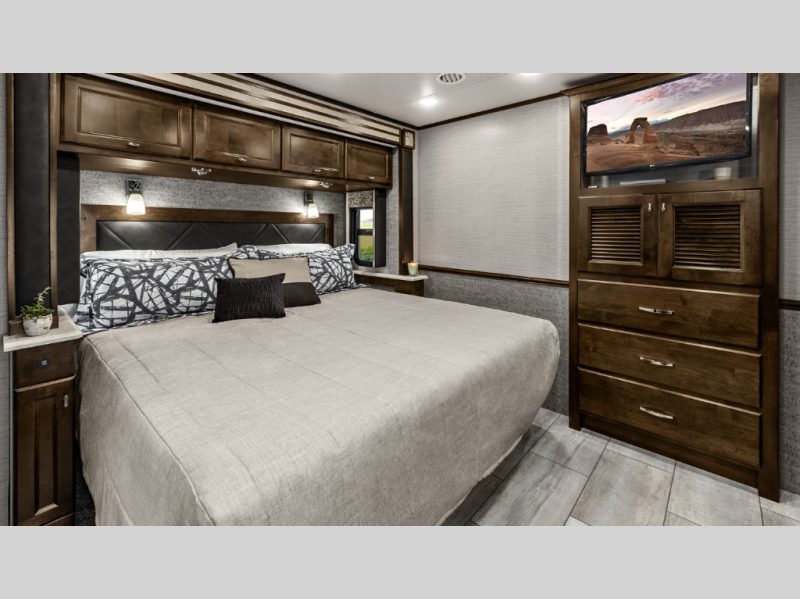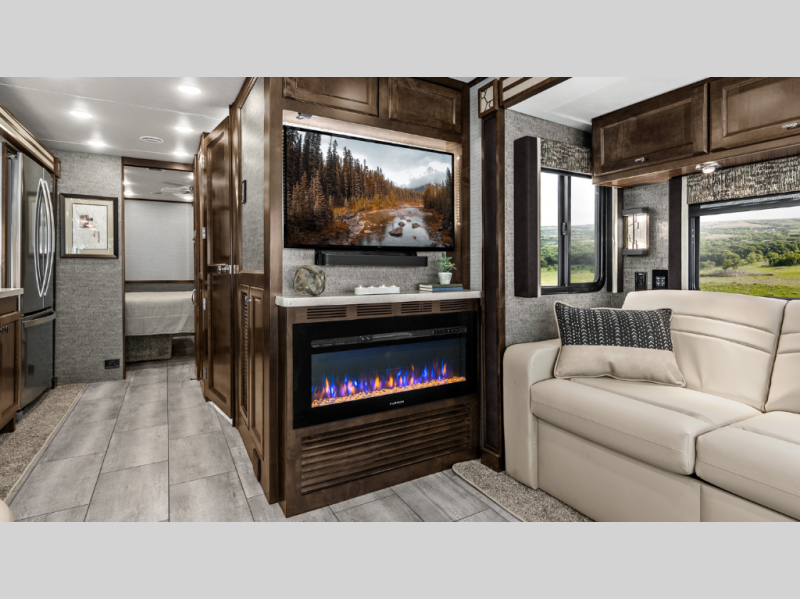 Stay entertained with the midsection flat panel TV, Blu Ray player, and premium sound system. When youre outside, the exterior flat panel TV adds even more enjoyment to game days, movie nights, or campground lounging. Lighted basement storage ensures your gear stays easy to access even after dark.