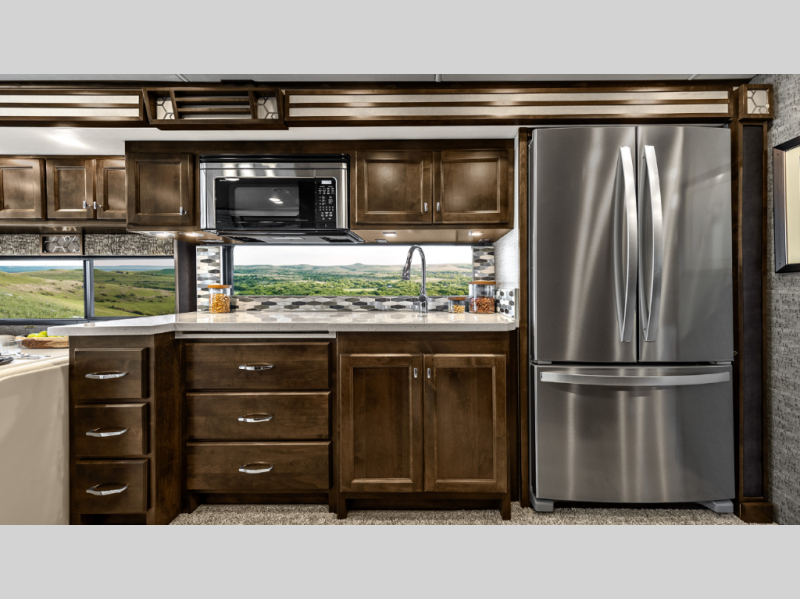 The chef will appreciate the three burner cooktop, two door refrigerator, pantry storage, and spray rinser faucet for quick cleanups. A panoramic galley window brings in natural light and scenic views to make cooking more enjoyable.