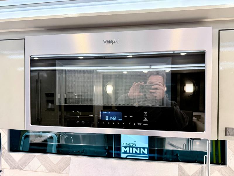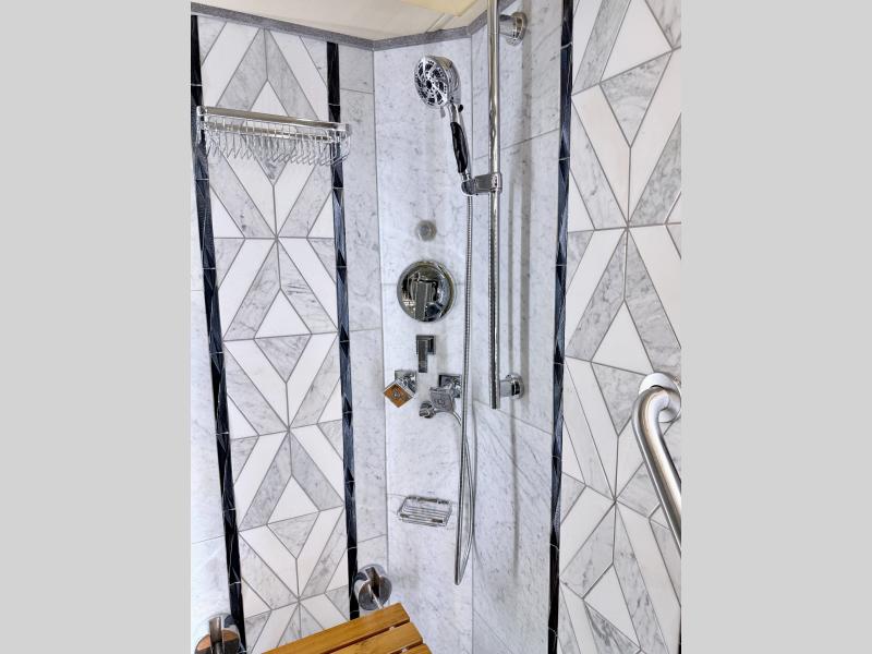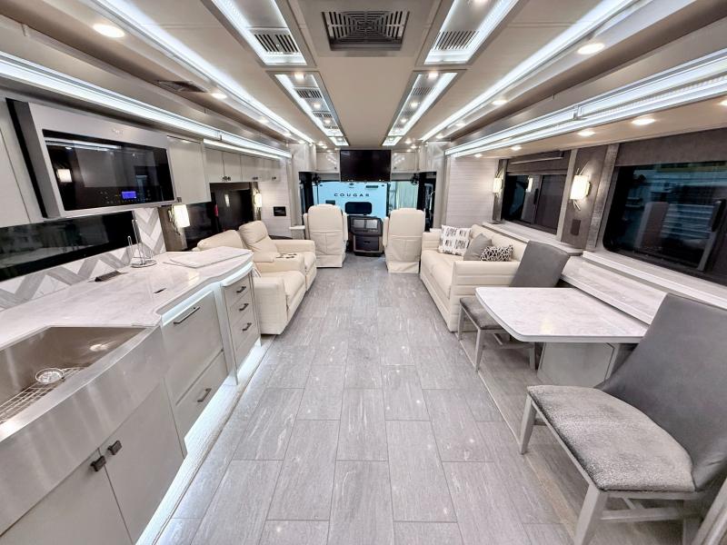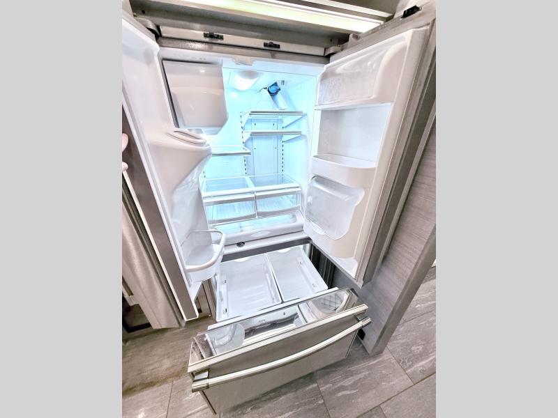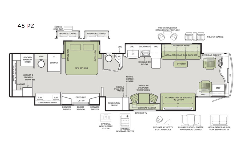Luxury abounds in this spacious motorhome that will sleep five to six each night. Once you arrive at your destination, you can relax on the Ultraleather sofa beds, or get some work done at the dinette with a computer workstation. There is a Keurig coffee center so you can bring along your favorite grounds for a hot cup of Joe. The chef of your group will love the double pull-out pantry and a residential refrigerator to store food, plus there is a dishwasher for easy clean-up. You and your spouse will be in the lap of luxury in the master bedroom that includes a memory foam king bed, a vanity with built-in drawers, and a fireplace with a TV lift which will make rainy days cozier than ever. The full rear bath is packed with convenient features, such as dual bath sinks, a skylight and LED light in the shower, and a stacked washer and dryer in the walk-in closet.