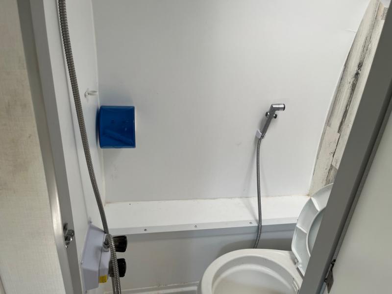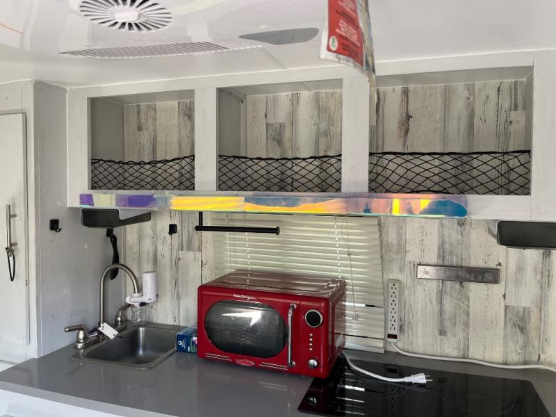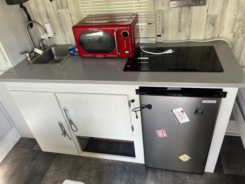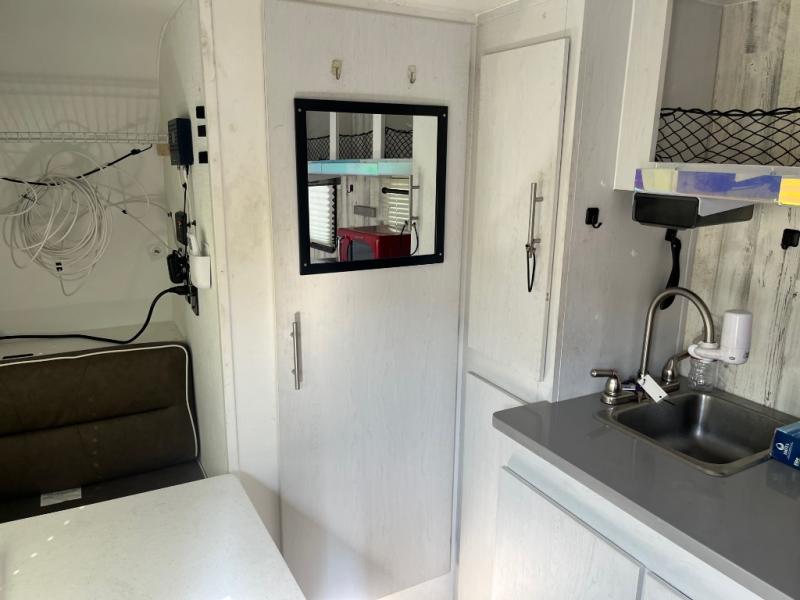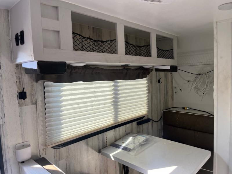 Inside, you’ll find a bright, modern interior featuring a front dinette that converts into a comfortable sleeping space, a well-equipped kitchenette with a sink, two-burner cooktop, microwave, and refrigerator, plus a rear wet bath for added convenience. Ample storage throughout ensures you can bring along all your essentials.