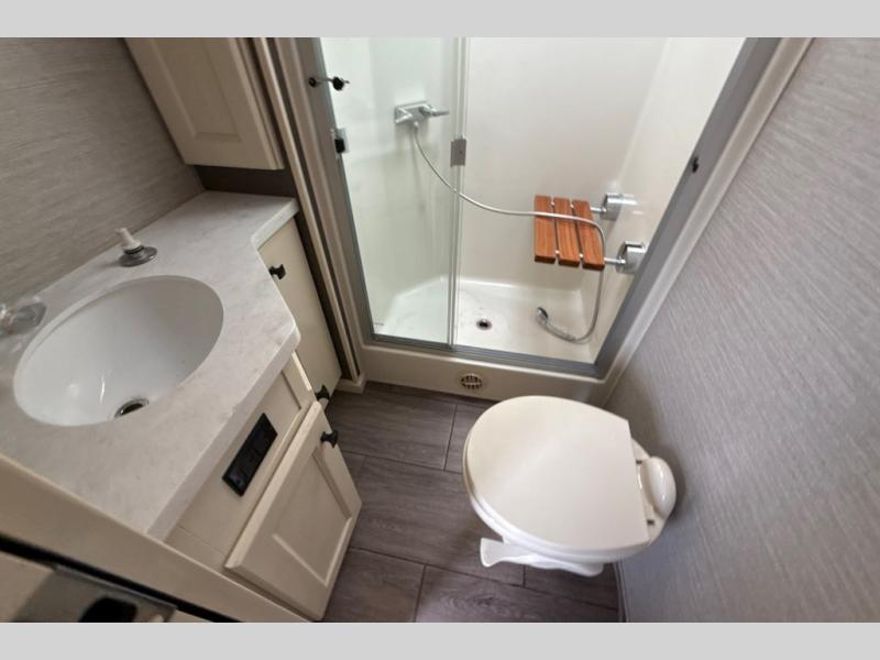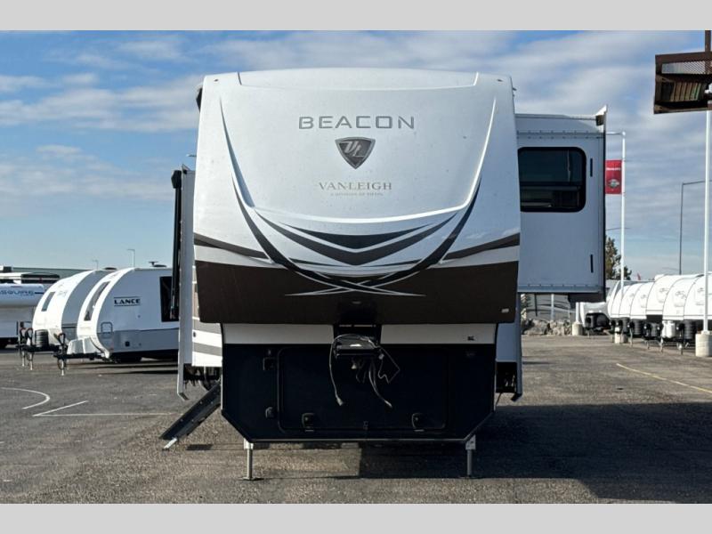 Each Beacon fifth wheel by VanLeigh RV is made with your comfort in mind. From the high-quality Franklin furniture, made in the U.S.A, to the Cool Gel Memory Foam mattress, it's easy to find luxury features at every turn. There is a galley window in each model so you will have a view of the great outdoors as you clean up, and each kitchen includes a stainless steel farm sink, a hand-built pantry to store all your items, plus an LG residential refrigerator with ice and water in the door. You will love the sleek look of the full overlay hardwood cabinetry and faceferames, the hand laid vinyl tile flooring throughout, and the hardwood ceiling decor with recessed LED lighting. Plan to travel year around with the Whisper Quiet A/C system, the 42,000 BTU furnace, and the 7,200 BTU electric fireplace, plus each model is constructed with a fully enclosed and heated underbelly with heat return. The outside of the Beacon features two patio awnings on slide boxes, an LED lighting system, plus dual exterior speakers to keep the party going day or night!