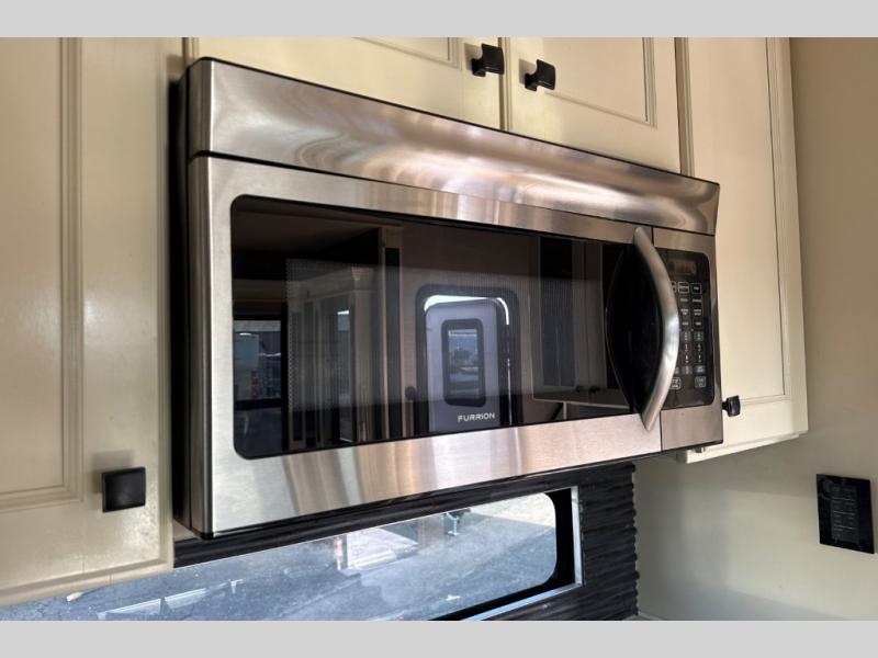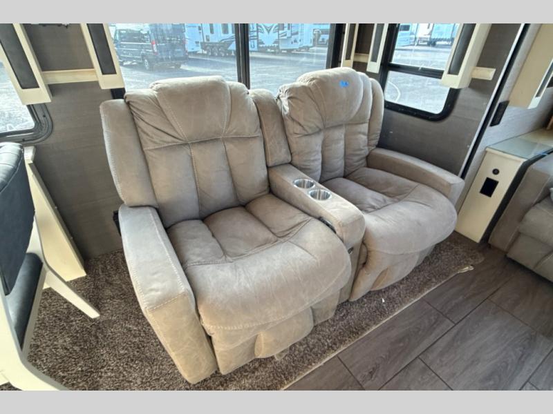 Enjoy time away from the hustle and bustle of the city life in this comfortable fifth wheel. Once you arrive at your destination, set up the two patio awnings, then stretch your legs around the campground. The chef of the family can prepare lunch on the kitchen island, and you can dine at the dinette with chairs. There is also a theater sofa and an 80" sofa bed for additional seating space, and the 40" fireplace with a TV above will feel just like home. If you've spent the day outdoors you can freshen up in the full bath that includes a shower with a seat, plus a medicine cabinet for your necessities. The front private bedroom includes everything you would expect to find at home, including a king bed, a Hi-Boy dresser with a TV, plus a large front closet with a sliding door!