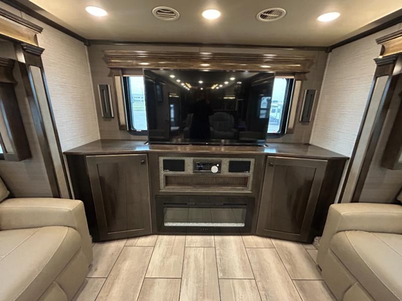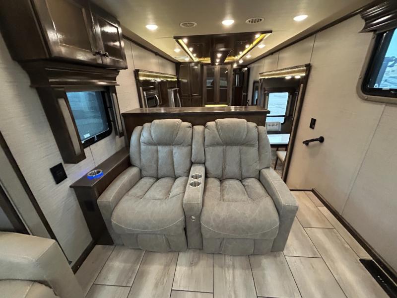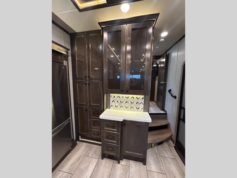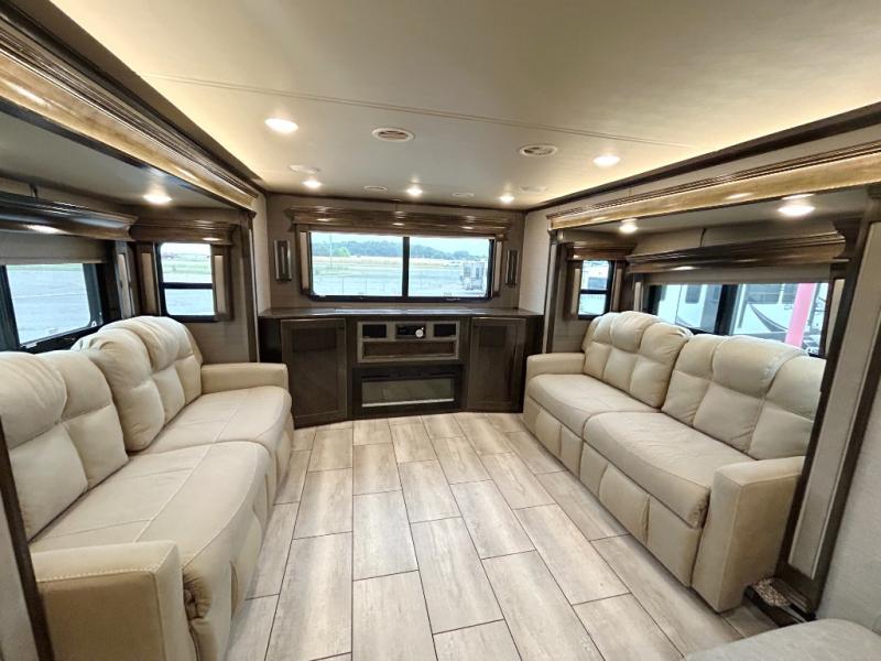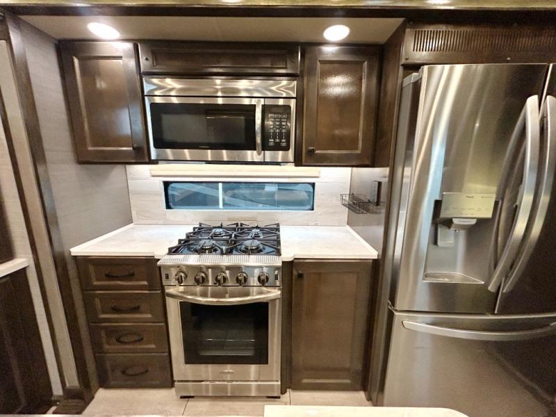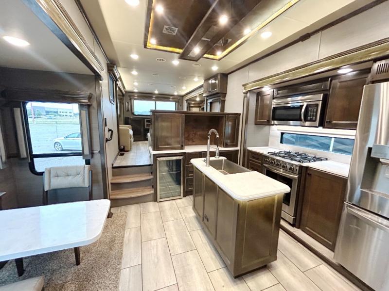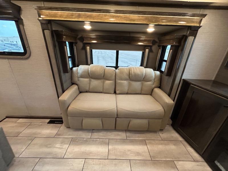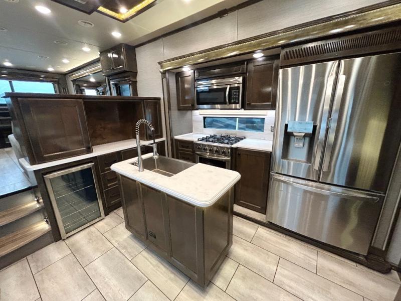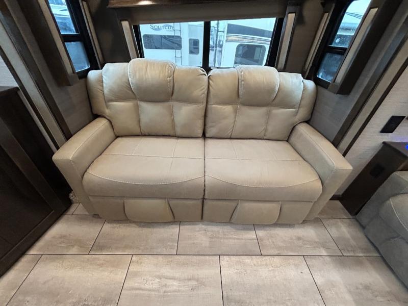This fifth wheel is perfect for your weekend excursions or full-time living. Make yourselves comfortable in the rear living area that includes two tri-fold sofas, a theater sofa, plus an entertainment center with a 55" TV and 40" fireplace. This area can double as your guests bedroom at night, and you and your spouse will enjoy the front private bedroom all to yourselves. The slide out king bed will provide a great night's rest, and you can neatly hang your clothes in the large front closet. Preparing meals each day will be a breeze in this Beacon kitchen that includes a Chef Collection oven and cooktop, a kitchen island with overhead lighting, plus two hutch's with upper and lower cabinets for dishes. There is also a hand-built pantry to store all your dry goods, and a wine fridge to entertain guests!