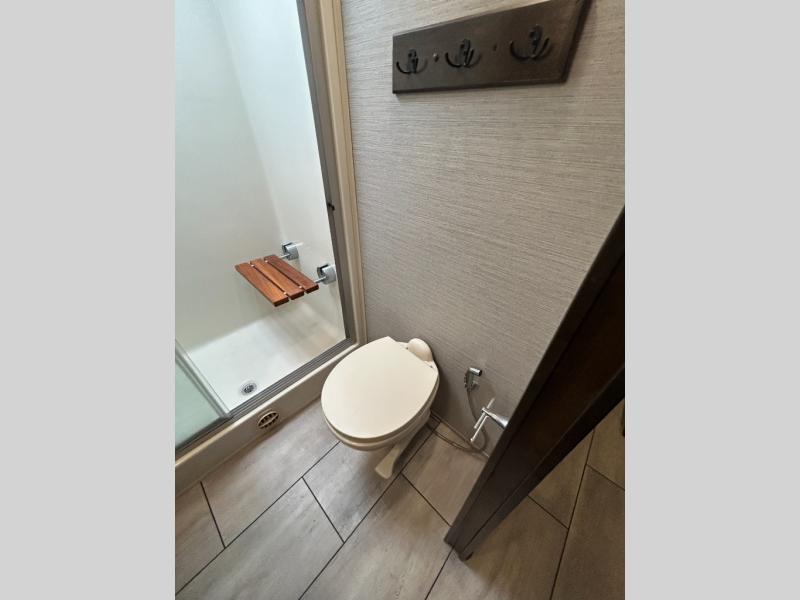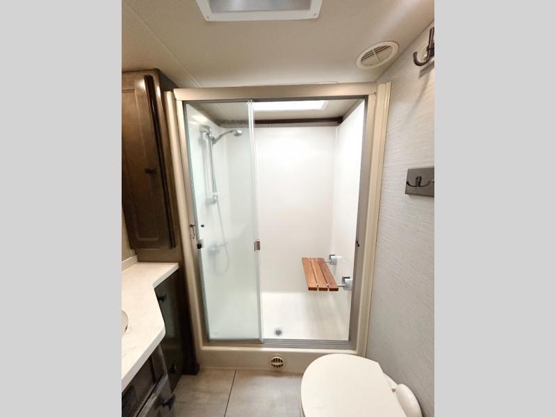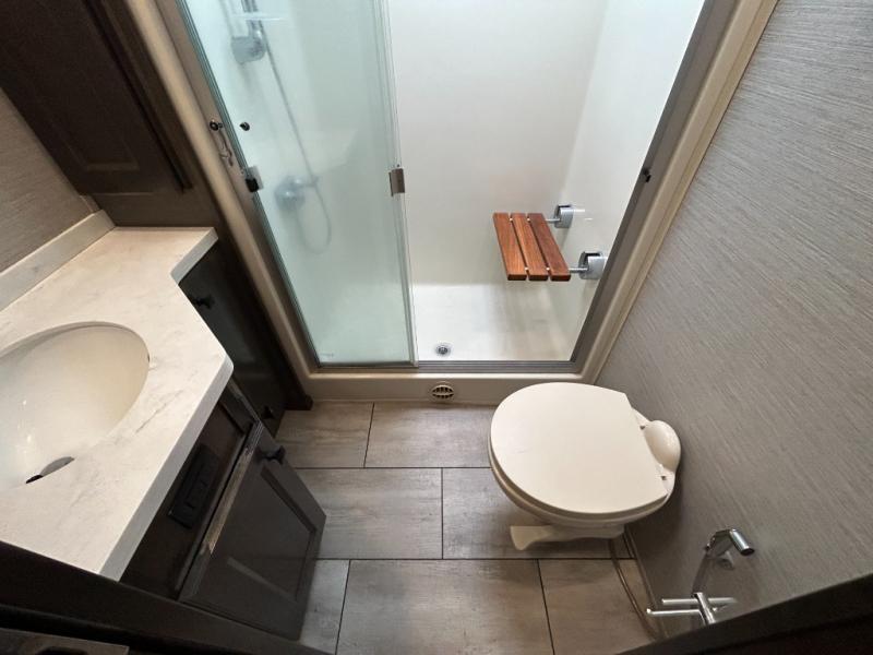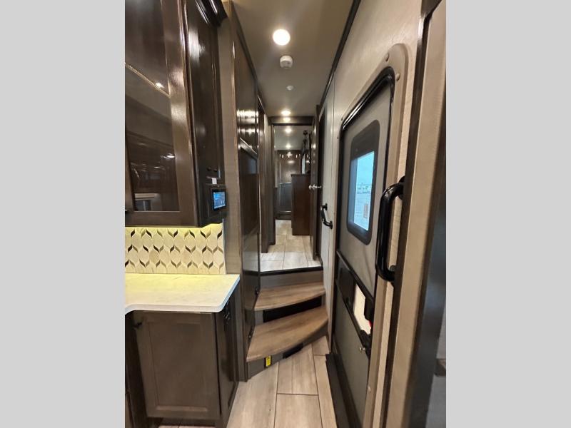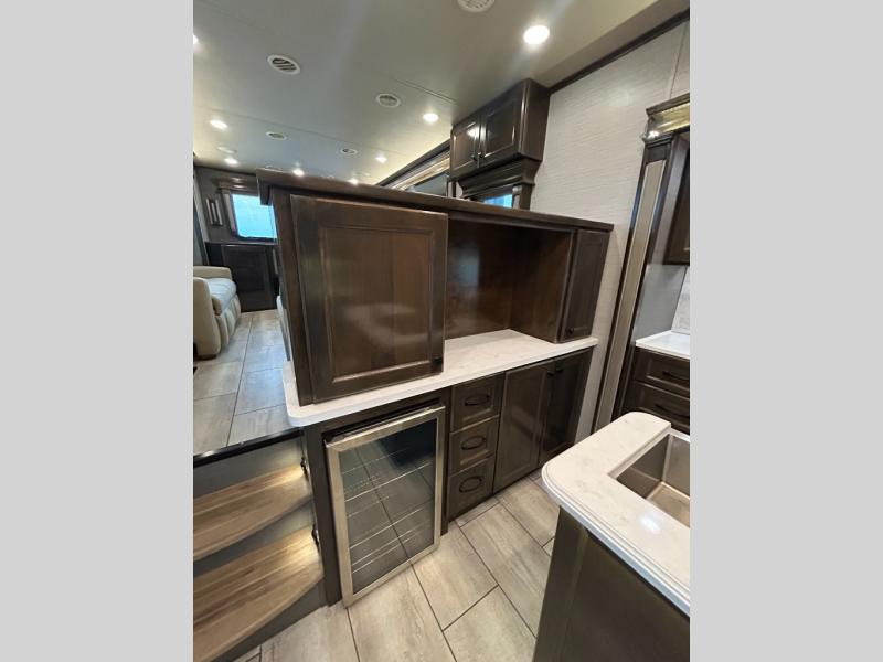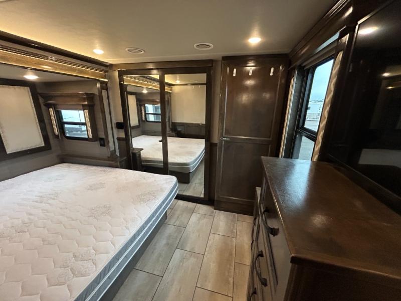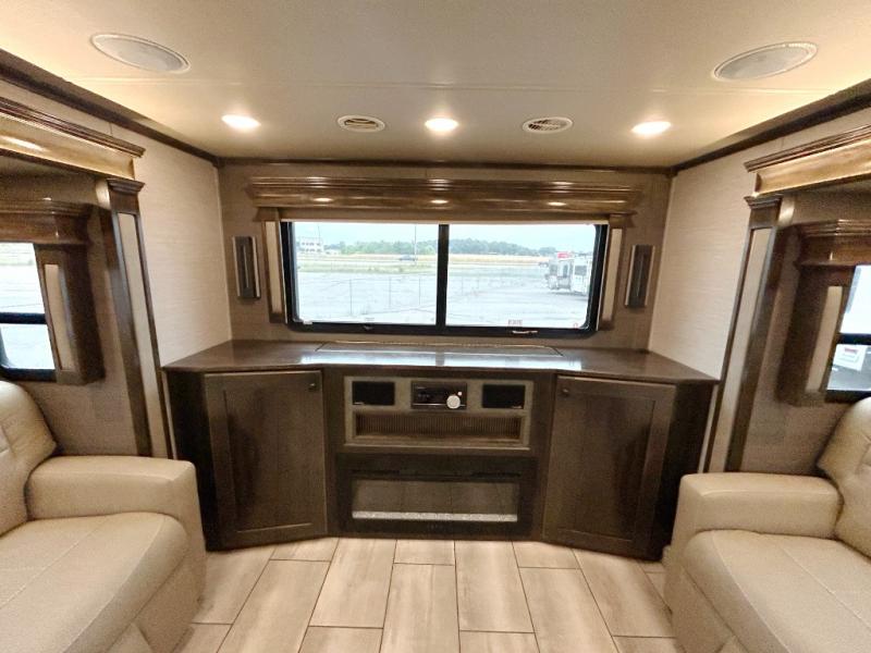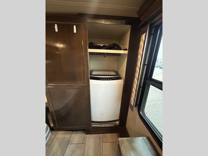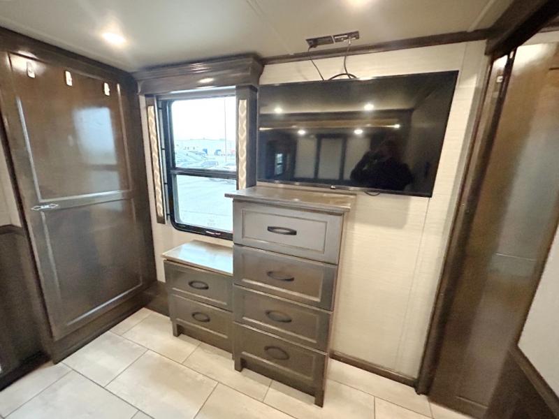 This fifth wheel is perfect for your weekend excursions or full-time living. Make yourselves comfortable in the rear living area that includes two tri-fold sofas, a theater sofa, plus an entertainment center with a 55" TV and 40" fireplace. This area can double as your guests bedroom at night, and you and your spouse will enjoy the front private bedroom all to yourselves. The slide out king bed will provide a great night's rest, and you can neatly hang your clothes in the large front closet. Preparing meals each day will be a breeze in this Beacon kitchen that includes a Chef Collection oven and cooktop, a kitchen island with overhead lighting, plus two hutch's with upper and lower cabinets for dishes. There is also a hand-built pantry to store all your dry goods, and a wine fridge to entertain guests!