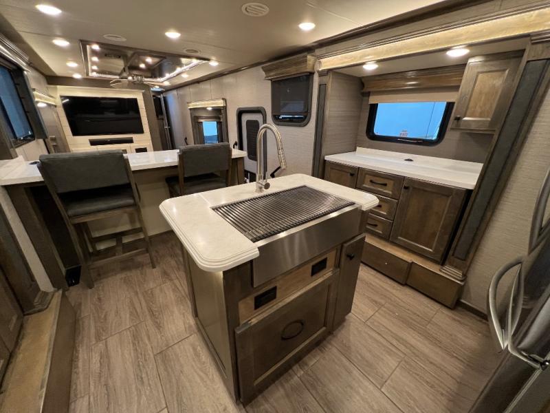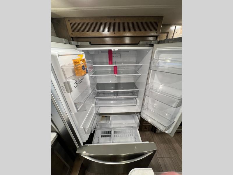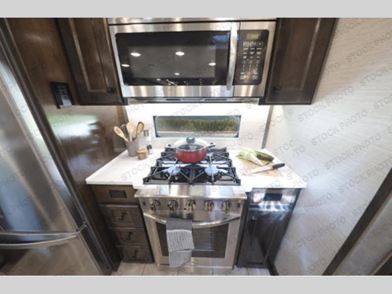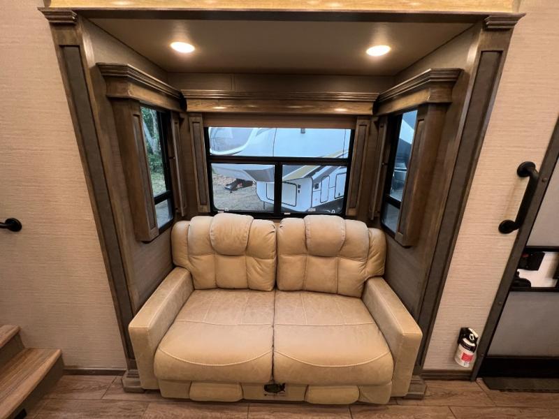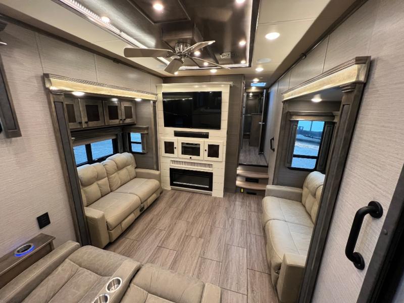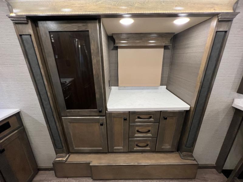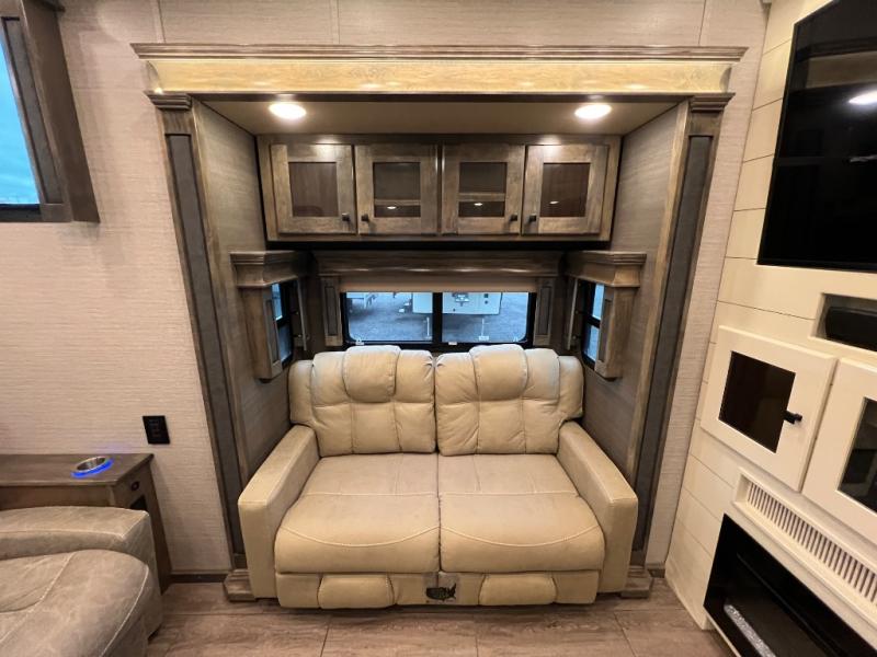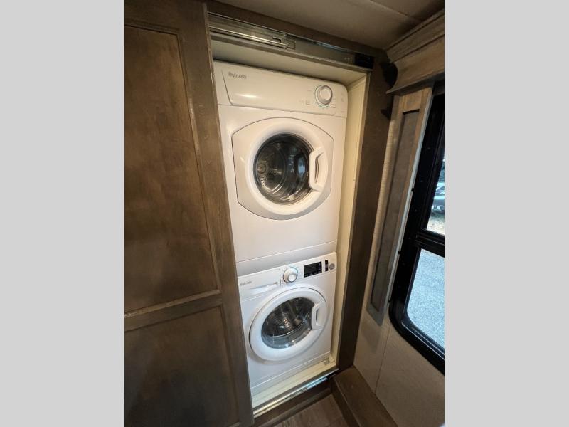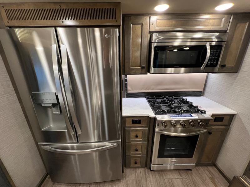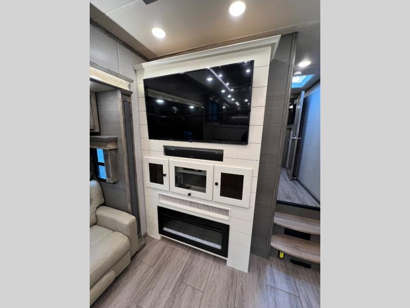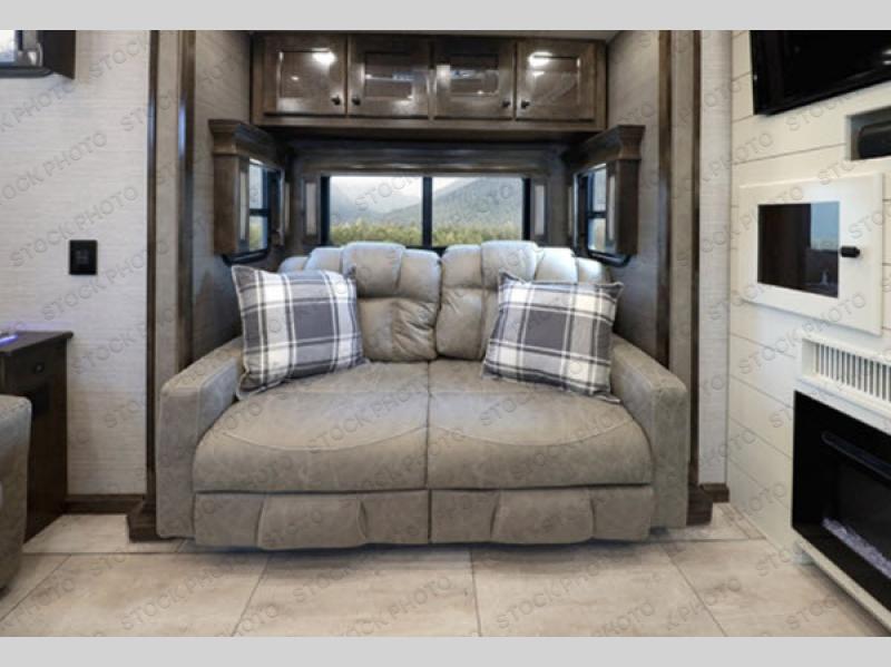 You will thoroughly enjoy every minute spent in this luxurious fifth wheel. Each room is packed with high-end features, such as a Chef Collection oven and cooktop, a residential refrigerator, a 40" fireplace, and a spacious 48" x 30" shower with a seat. While the chef of the family is preparing dinner, the kids can color at the bar style dining table that has a great view of the 55" TV. Within the main living area you will find dual tri-fold sofas within the dual opposing slides, plus a 60" theater sofa for complete comfort. Everyone can easily clean up in the spacious full bath that includes dual bath sinks and a medicine cabinet for your necessities, plus there is a hall closet conveniently located just outside the door to grab a clean towel on your way to shower. You and your spouse will fall in love with the front bedroom that includes a slide out king bed, a Hi-Boy dresser with a TV above, a window seat cabinet, and a large front closet with sliding doors to store your clothes. There is even a space to add an optional washer and dryer for your convenience.