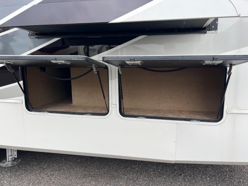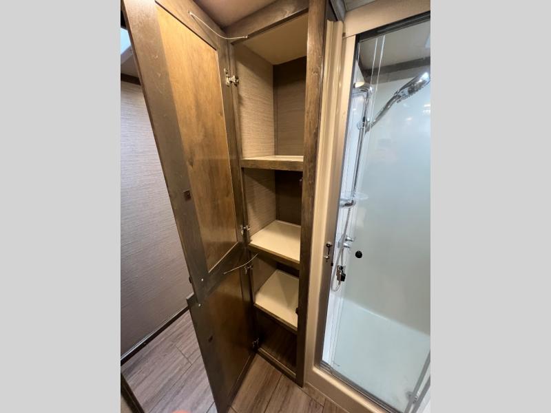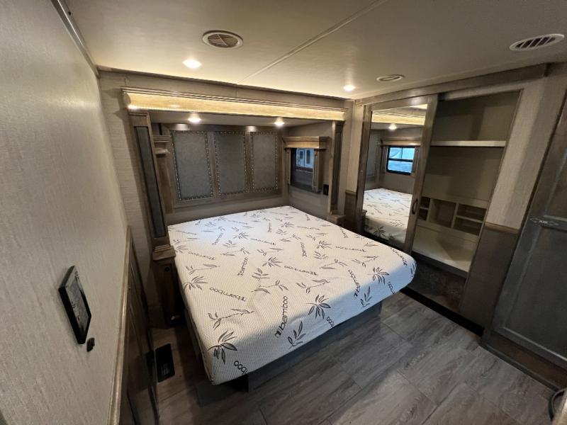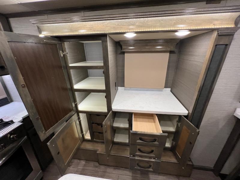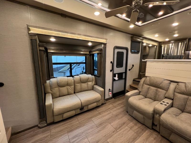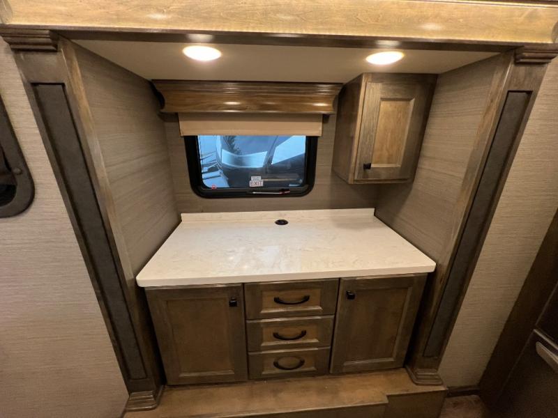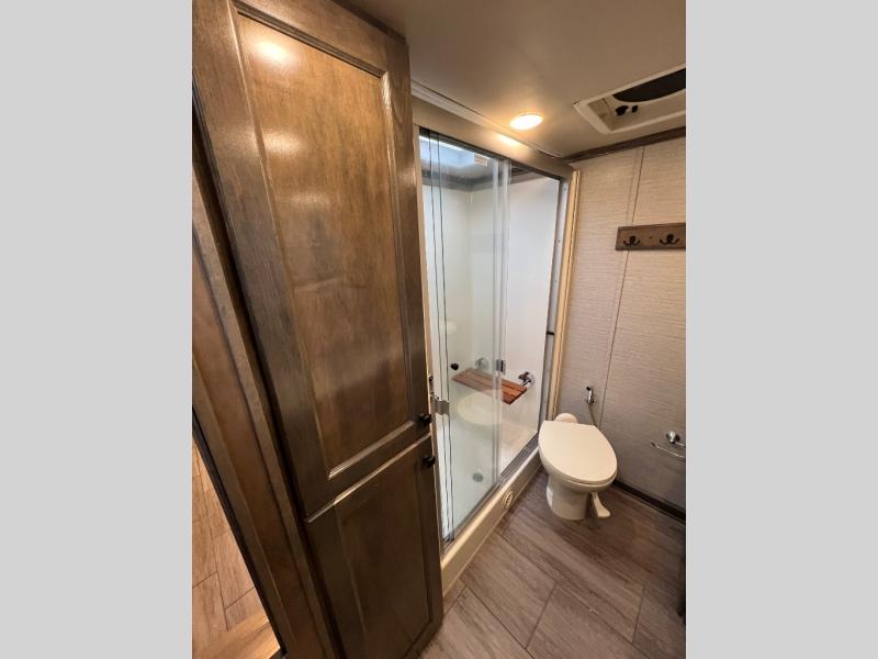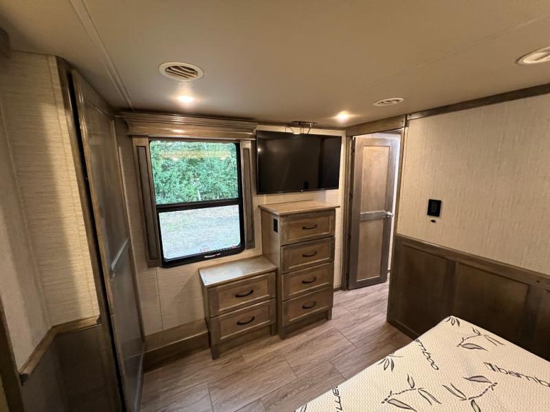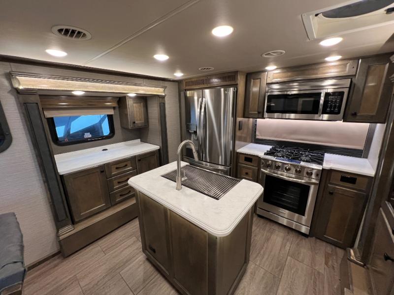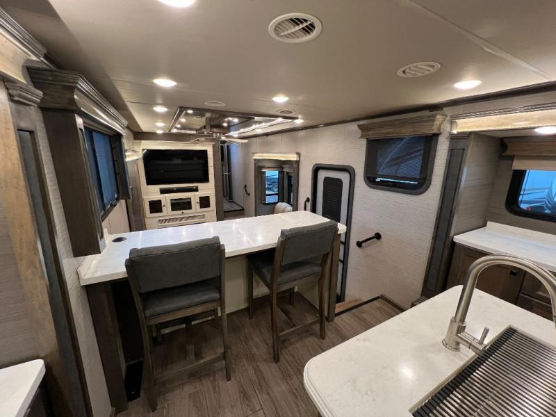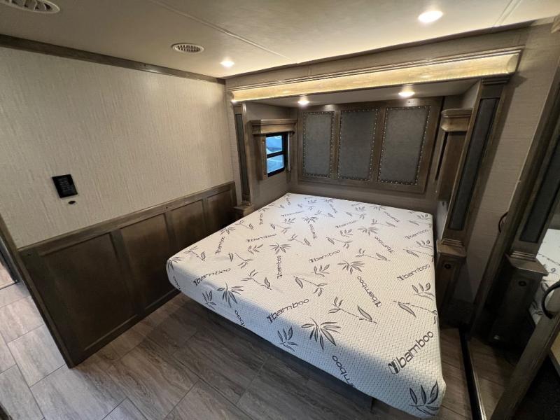 You will thoroughly enjoy every minute spent in this luxurious fifth wheel. Each room is packed with high-end features, such as a Chef Collection oven and cooktop, a residential refrigerator, a 40" fireplace, and a spacious 48" x 30" shower with a seat. While the chef of the family is preparing dinner, the kids can color at the bar style dining table that has a great view of the 55" TV. Within the main living area you will find dual tri-fold sofas within the dual opposing slides, plus a 60" theater sofa for complete comfort. Everyone can easily clean up in the spacious full bath that includes dual bath sinks and a medicine cabinet for your necessities, plus there is a hall closet conveniently located just outside the door to grab a clean towel on your way to shower. You and your spouse will fall in love with the front bedroom that includes a slide out king bed, a Hi-Boy dresser with a TV above, a window seat cabinet, and a large front closet with sliding doors to store your clothes. There is even a space to add an optional washer and dryer for your convenience.