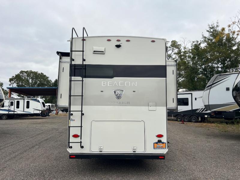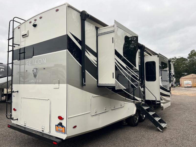 Each Beacon fifth wheel by VanLeigh RV is made with your comfort in mind. From the high-quality Franklin furniture, made in the U.S.A, to the Cool Gel Memory Foam mattress, it's easy to find luxury features at every turn. There is a galley window in each model so you will have a view of the great outdoors as you clean up, and each kitchen includes a stainless steel farm sink, a hand-built pantry to store all your items, plus an LG residential refrigerator with ice and water in the door. You will love the sleek look of the full overlay hardwood cabinetry and faceferames, the hand laid vinyl tile flooring throughout, and the hardwood ceiling decor with recessed LED lighting. Plan to travel year around with the Whisper Quiet A/C system, the 42,000 BTU furnace, and the 7,200 BTU electric fireplace, plus each model is constructed with a fully enclosed and heated underbelly with heat return. The outside of the Beacon features two patio awnings on slide boxes, an LED lighting system, plus dual exterior speakers to keep the party going day or night!
