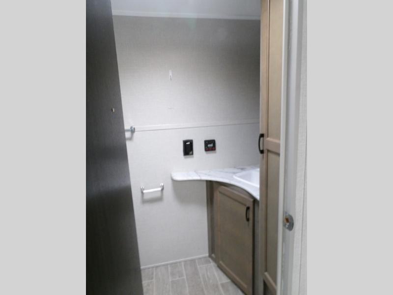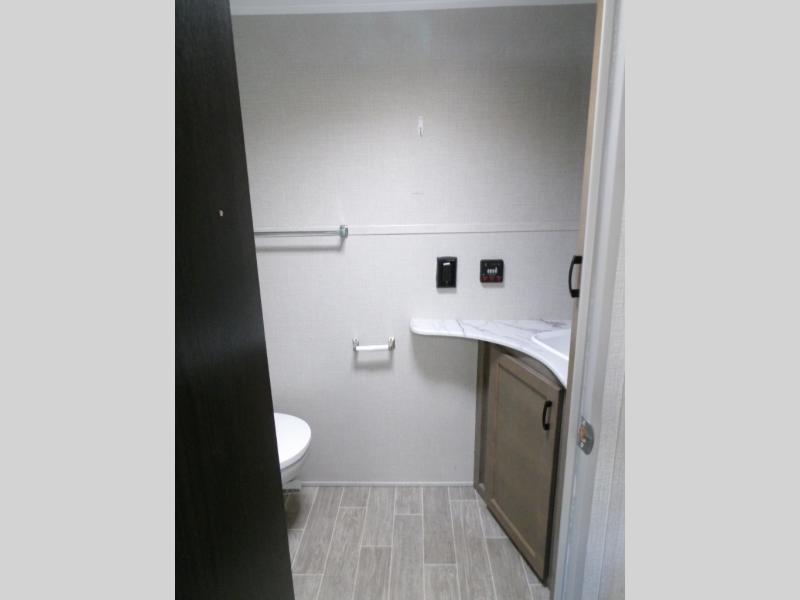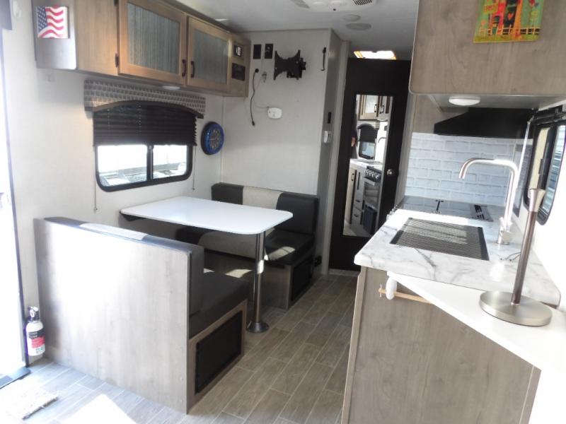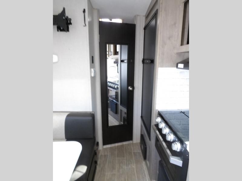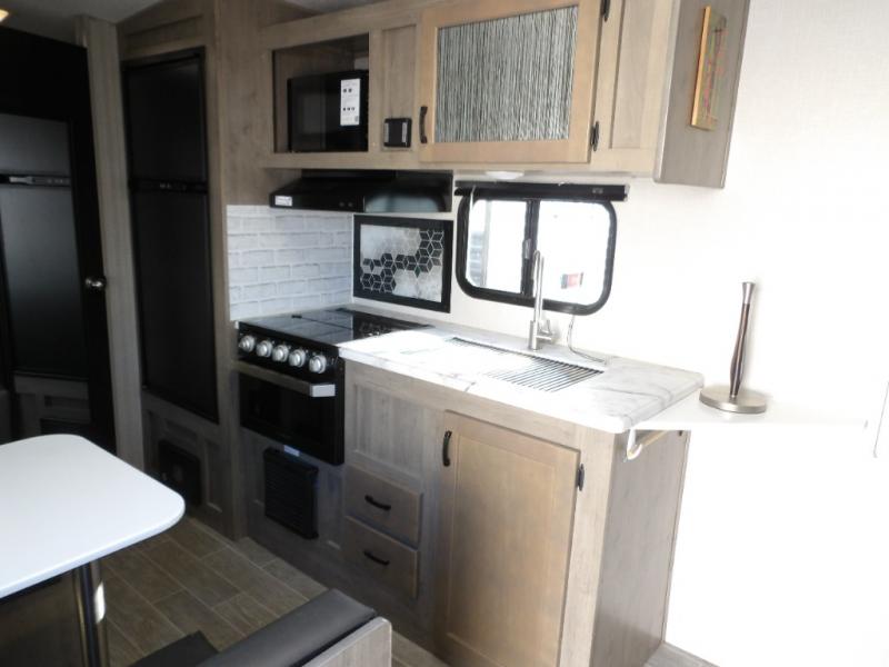 You and your spouse will love this Sonic travel trailer that has a front Murphy bed with wardrobes, StorMore bedside nightstands with a 110V outlet and USB charging, and a rear full bathroom with linen storage, a radius shower, and medicine cabinet. You can prepare a meal in the galley kitchen and dine at the booth dinette, or you can go outside under the 13' power awning. And the motion-activated light in the exterior pass-through storage will help you when locating your camping chairs, outdoor games, and such.