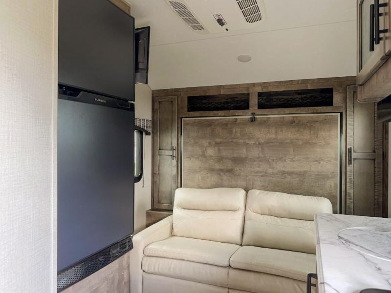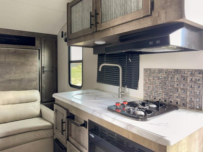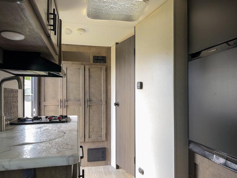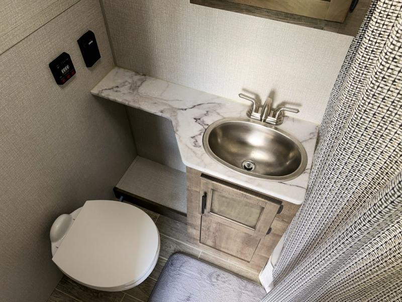 Whether you are a couple or single person that enjoys camping with friends, this compact trailer offers all the amenities you need, plus some! The front Murphy RV queen bed promotes versatile living by giving you a sofa to relax on during the day and a bed to sleep on at night. The removable table is handy for dining when you are inside, plus you might decide to take it outside to relax under the 11' power awning. The full bathroom in the back is equipped with everything you will need to get squeaky clean each day. Just outside of the bathroom is a pantry/closet for you to use however you please. There are plenty of overhead cabinets throughout the inside, but if you need more storage space, then you can use the exterior pass-through storage area which includes a motion activated light!