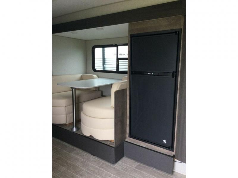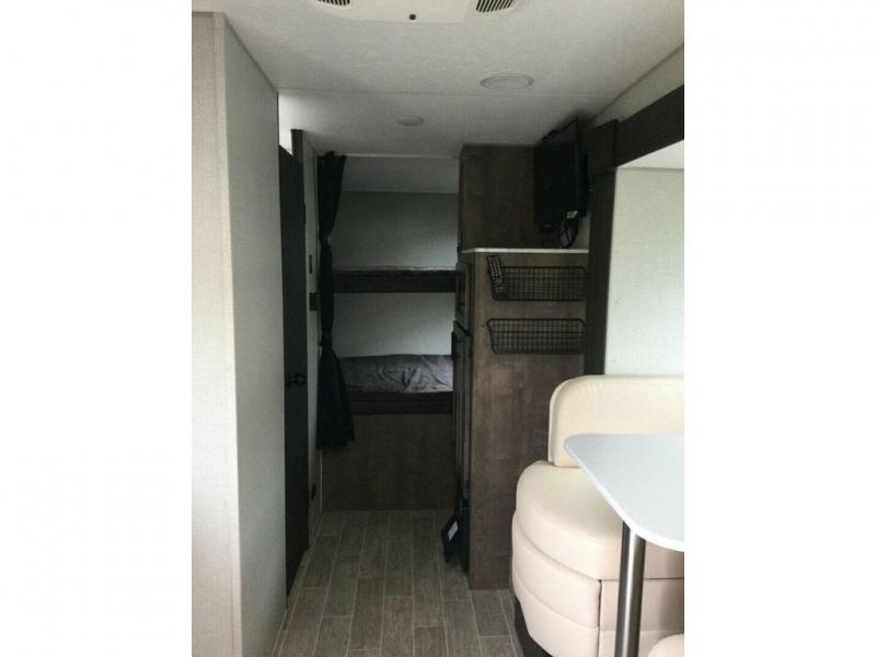 Traveling to see new places just got a lot easier with this single-slide Sonic travel trailer. Your kids or friends will love the bunk beds in the rear, and they will also love to have their own wardrobe while you sleep on the Murphy bed up front. You will appreciate the StorMore bedside nightstands with a 110V outlet and USB charging to keep your phone ready for whatever is next, and the sofa offers a living area up front once the bed is put up into the wall. You can make warm meals in the kitchen or outside on the campfire café, and then choose to dine inside at the booth dinette or outside under the 14' power awning after grabbing your camping chairs from the exterior pass-through storage with motion-activated light.