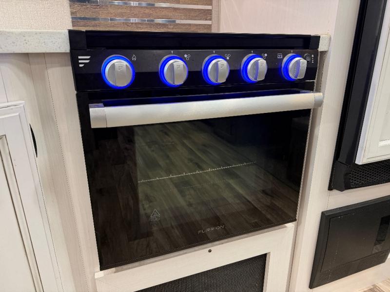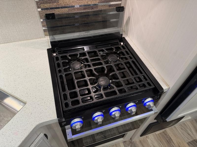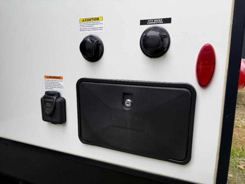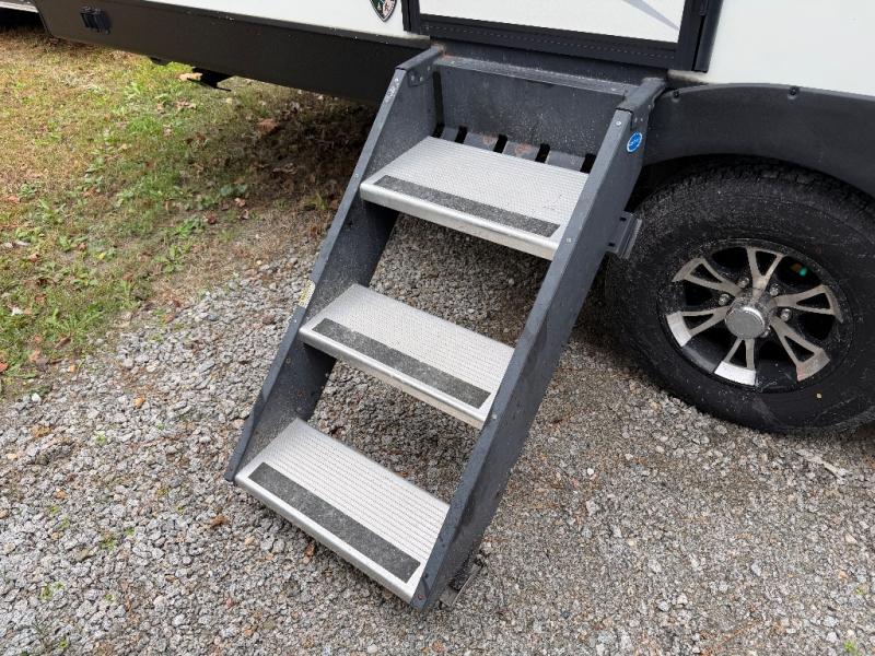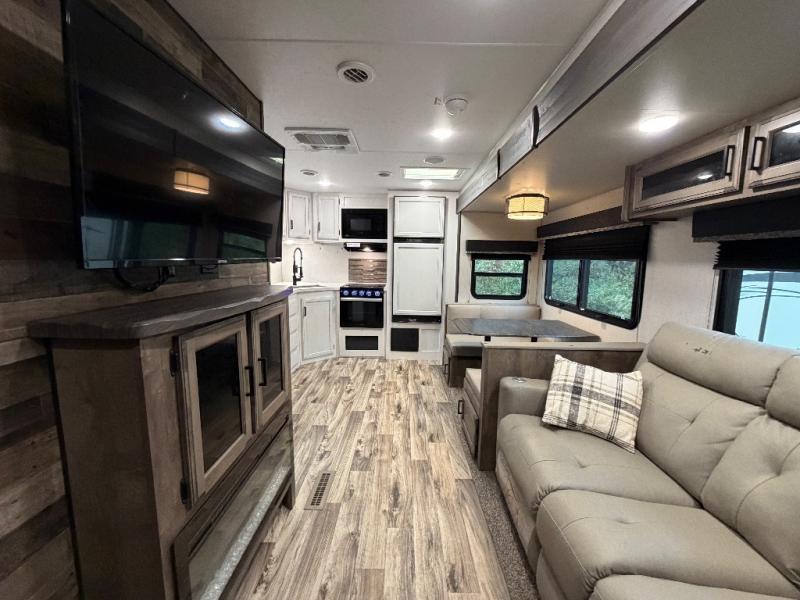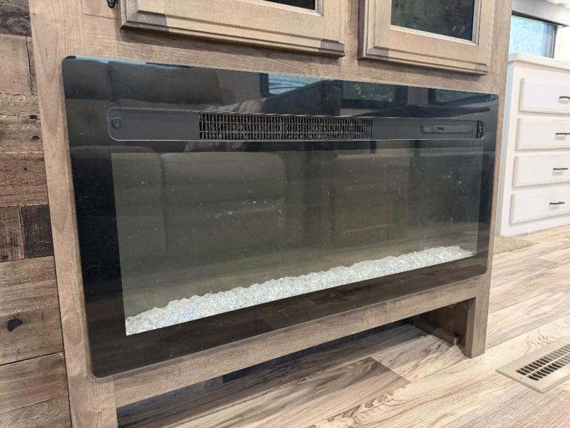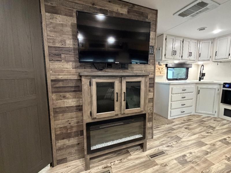 One step inside this travel trailer and you will want to go camping every weekend! You will love the front private bedroom with a front window seat, a slide out king bed, and your own fireplace for a cozy evening. The kids can convert the tri-fold sofa bed or the 42" grand dinette at night for a comfortable sleeping space. Prepare a big breakfast on the three burner cooktop, then take your plate to sit under the 16' power awning outside. After you've filled your day with hiking, you can freshen up in the full bath that includes a 30" x 36" shower. This model also includes plenty of storage, including a walk-in pantry just inside the entry door for convenience!