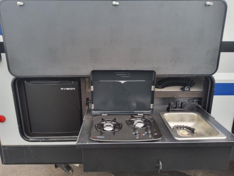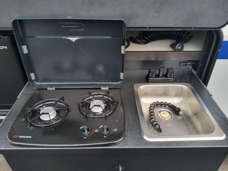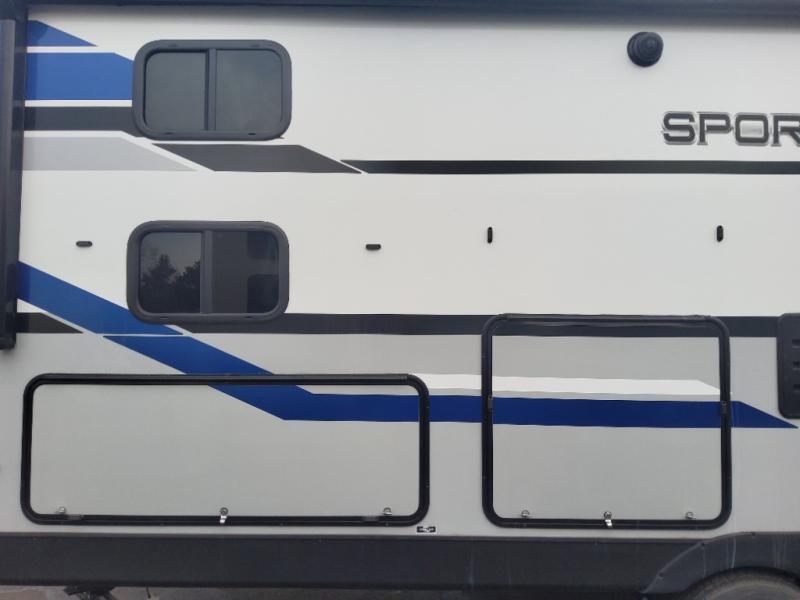This SportTrek travel trailer has excellent storage capacity with its exterior trunk door, pass-through storage, and interior hidden pantry! You will also find that this trailer has many kitchen amenities with the microwave, Furrion oven, 10-cubic foot refrigerator, and large undermount stainless steel sink on the interior, as well as the additional tools at the outdoor kitchen. The front private bedroom has sliding doors to close it off from the rest of the trailer, and you will find a walk-around queen bed with bedside closets within the bedroom. Out in the main living area, you can put your feet up on the 70" sofa, or you can use the 42" dinette to sit down with an afternoon snack.