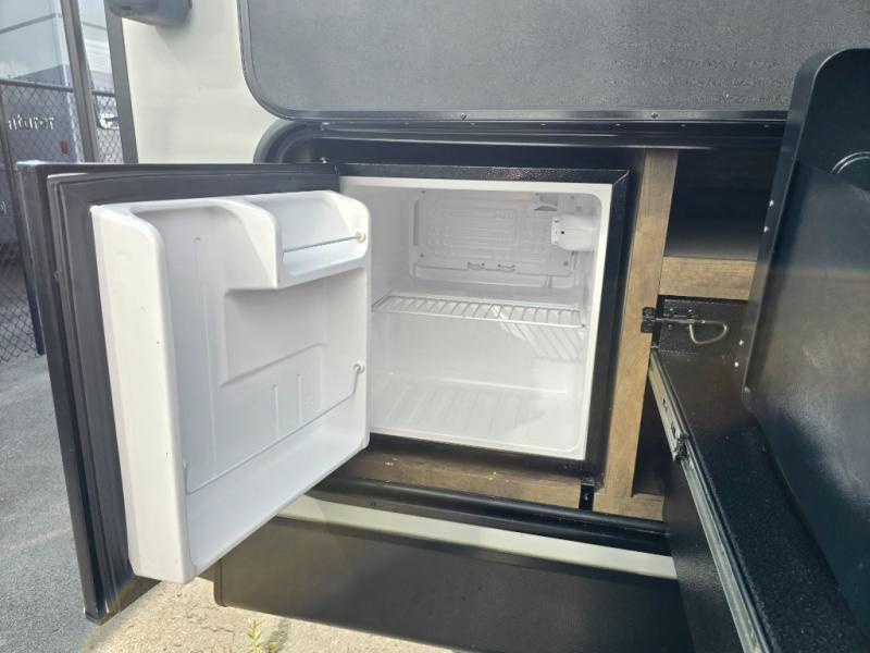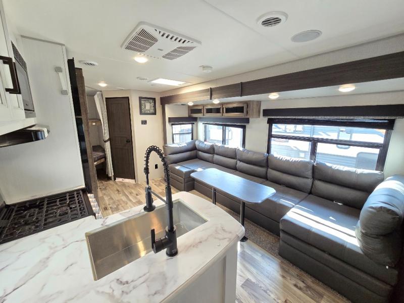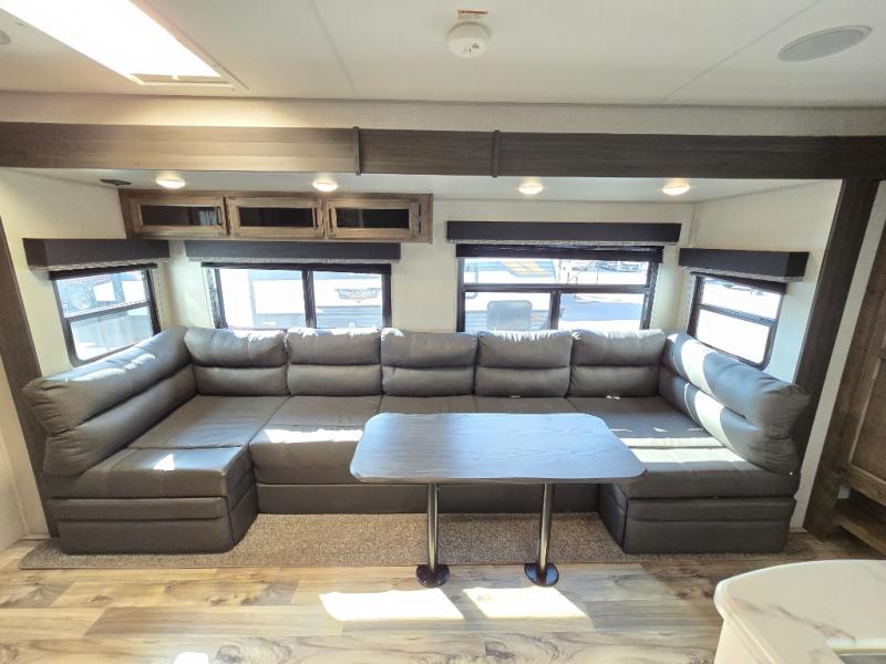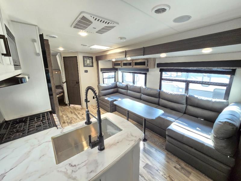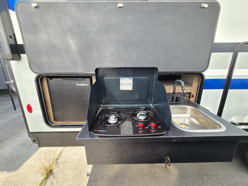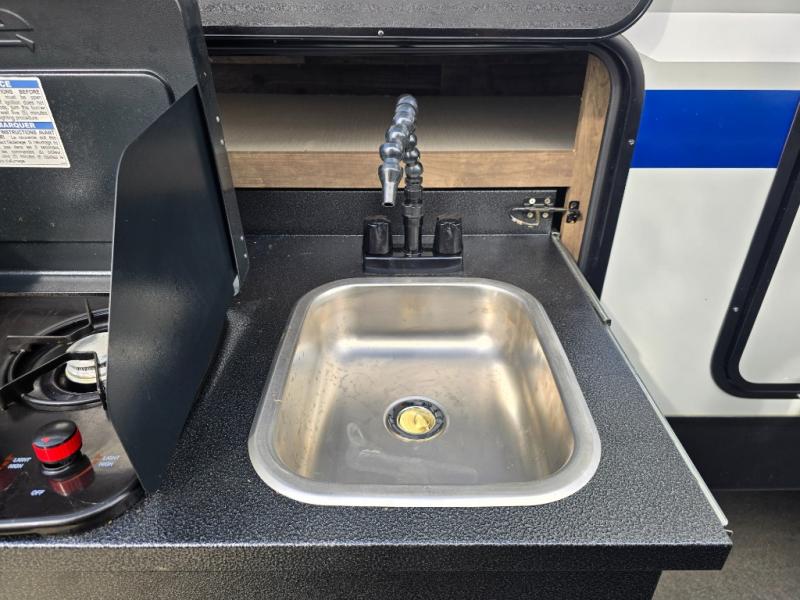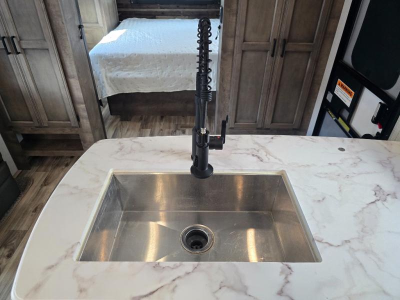 This SportTrek travel trailer has excellent storage capacity with its exterior trunk door, pass-through storage, and interior hidden pantry! You will also find that this trailer has many kitchen amenities with the microwave, Furrion oven, 10-cubic foot refrigerator, and large undermount stainless steel sink on the interior, as well as the additional tools at the outdoor kitchen. The front private bedroom has sliding doors to close it off from the rest of the trailer, and you will find a walk-around queen bed with bedside closets within the bedroom. Out in the main living area, you can put your feet up on the 70" sofa, or you can use the 42" dinette to sit down with an afternoon snack.