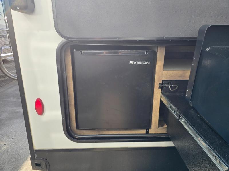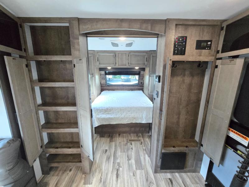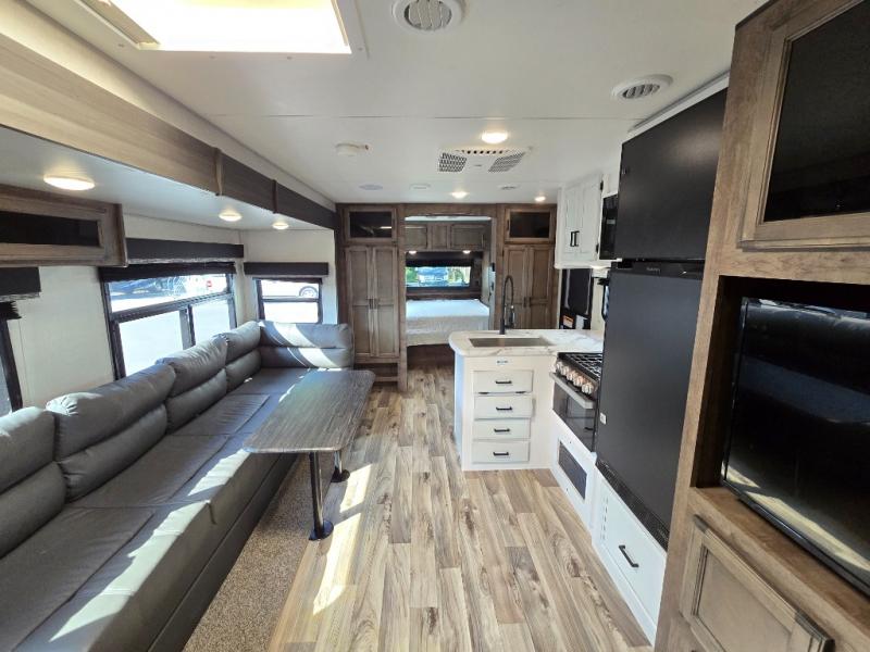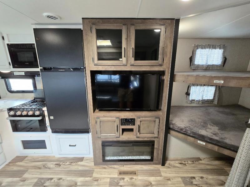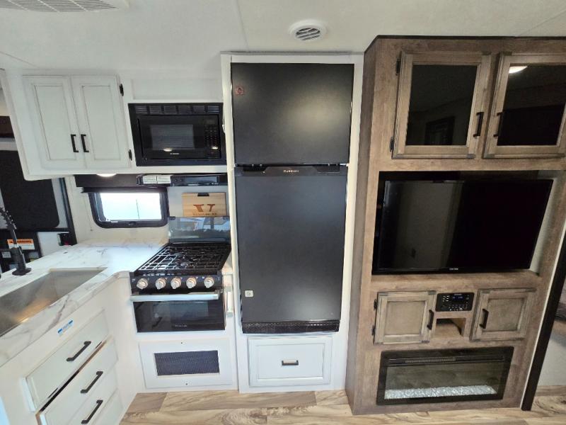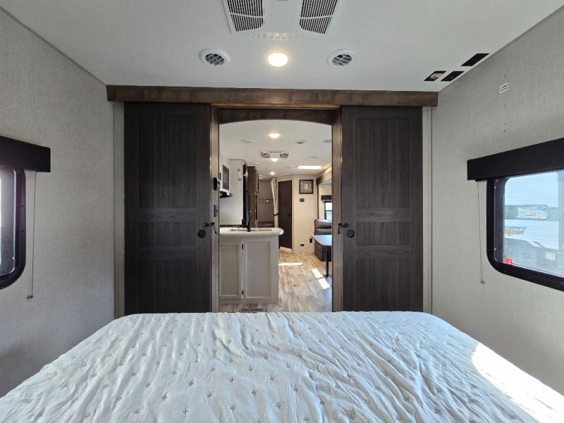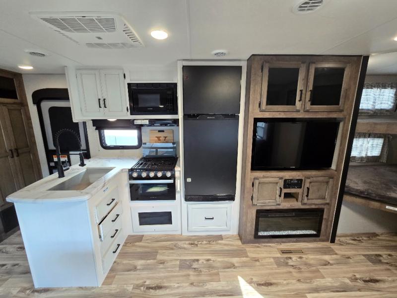 This SportTrek travel trailer has excellent storage capacity with its exterior trunk door, pass-through storage, and interior hidden pantry! You will also find that this trailer has many kitchen amenities with the microwave, Furrion oven, 10-cubic foot refrigerator, and large undermount stainless steel sink on the interior, as well as the additional tools at the outdoor kitchen. The front private bedroom has sliding doors to close it off from the rest of the trailer, and you will find a walk-around queen bed with bedside closets within the bedroom. Out in the main living area, you can put your feet up on the 70" sofa, or you can use the 42" dinette to sit down with an afternoon snack.