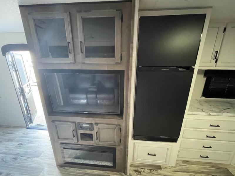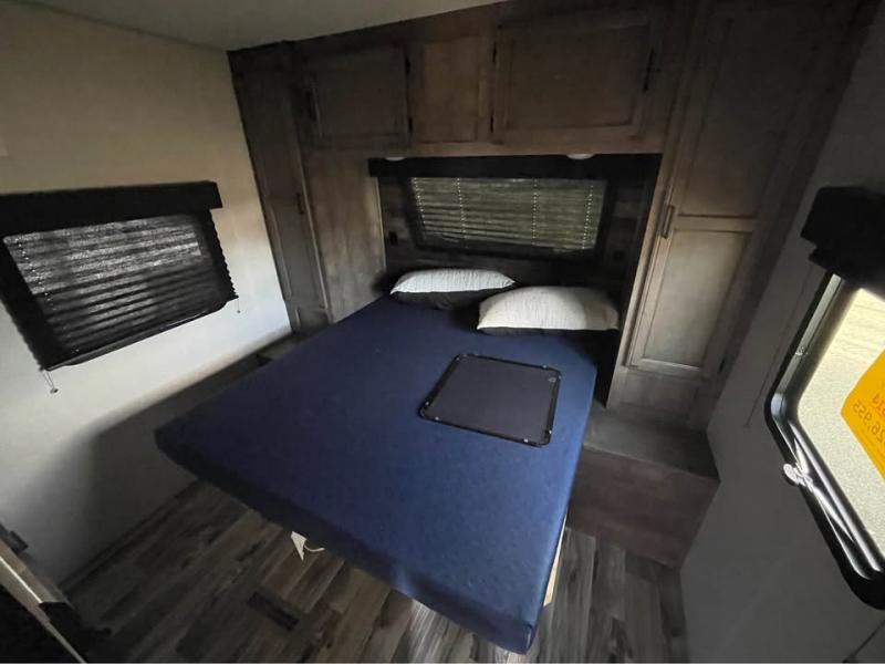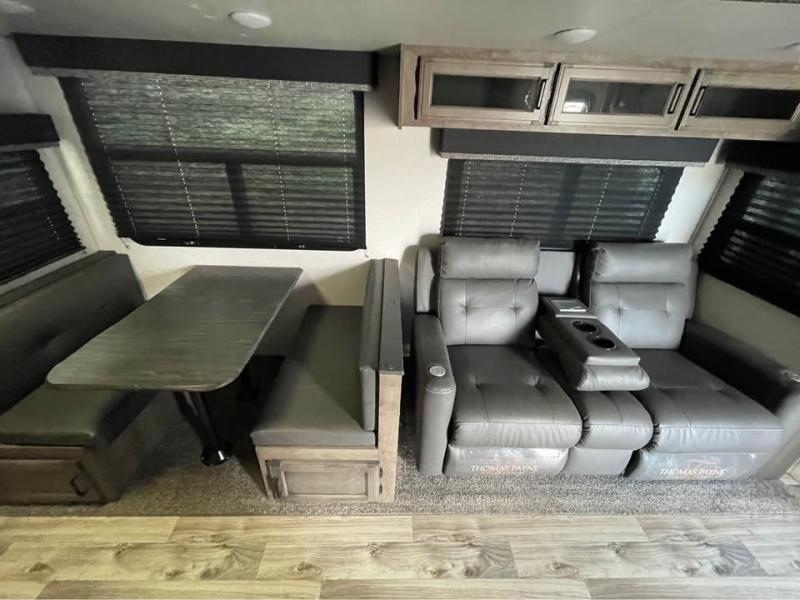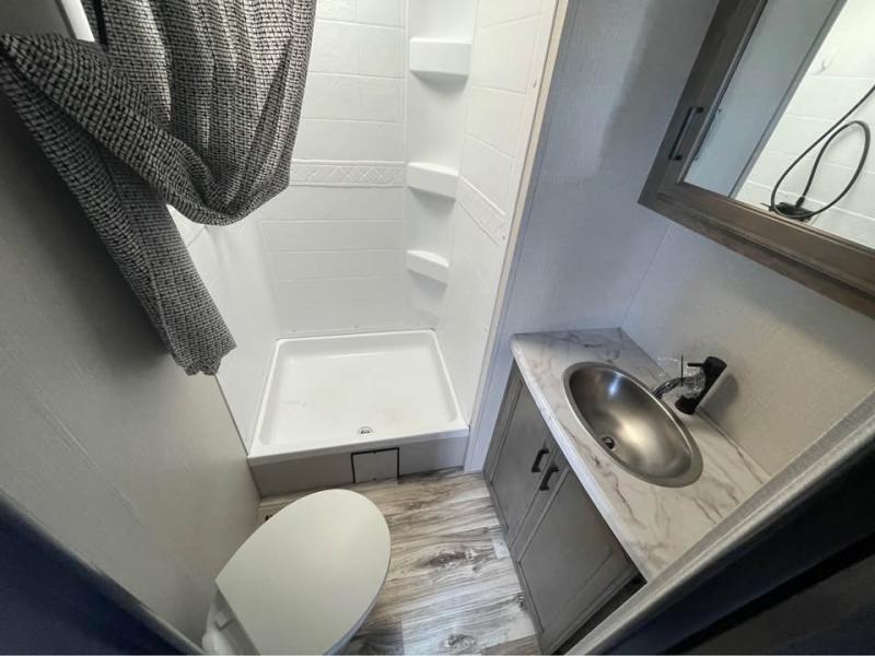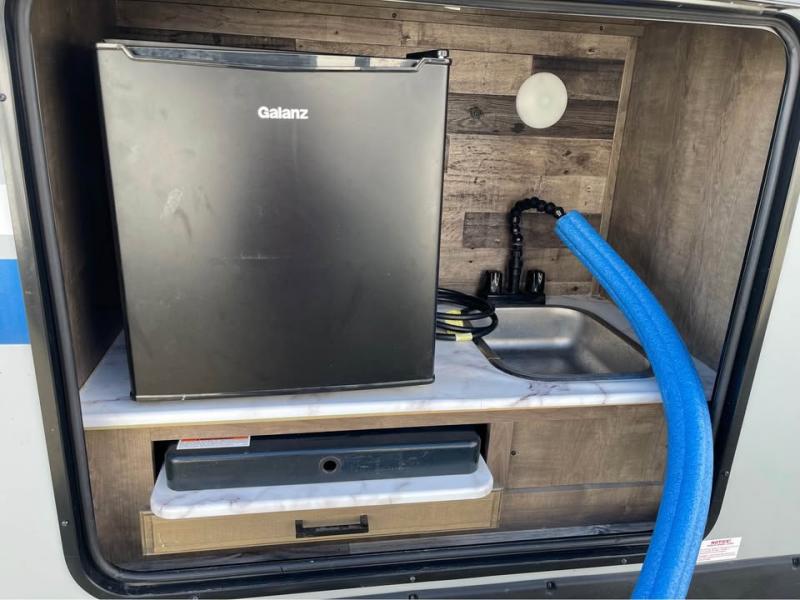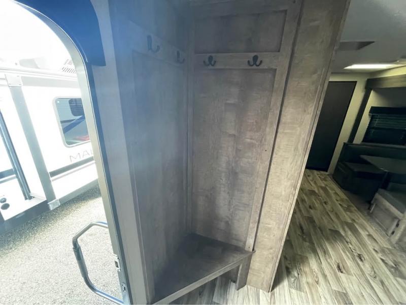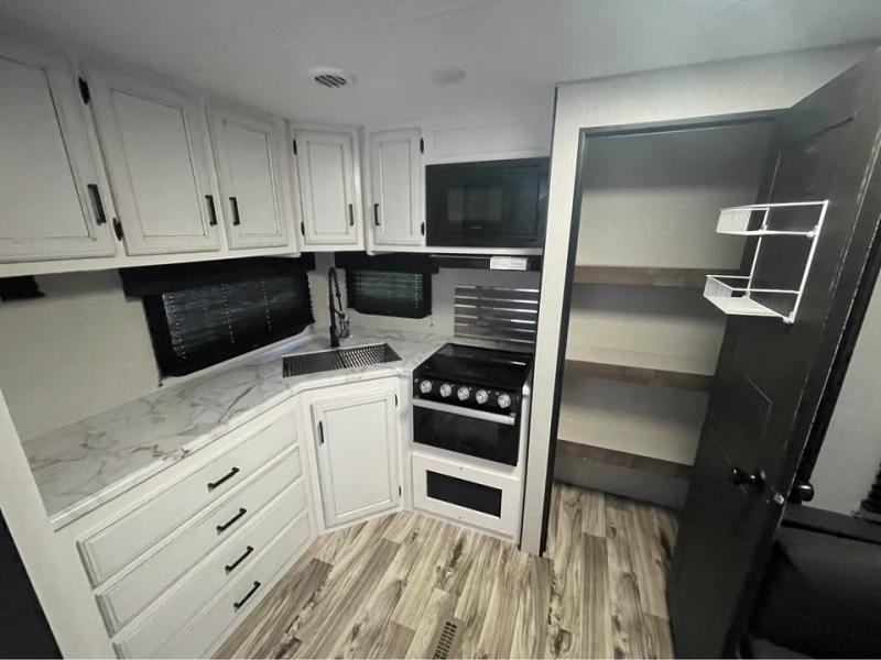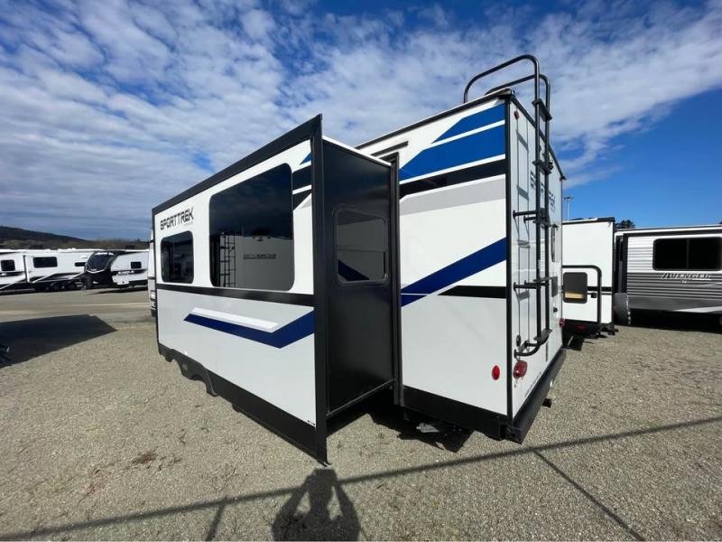 If you want modern features and accommodating amenities, check out this SportTrek travel trailer! This model has an excellent rear kitchen with a walk-in pantry, a 10-cubic foot refrigerator, a hutch, a large undermount stainless steel sink, and a sink cover for dish drying, but this model also has an outdoor café for even more kitchen tools. When you enter this model, you will find that there is a bench seat with coat hooks immediately to your left so that you can sit down and take off your shoes before walking anywhere else. The large slide is also going to come in handy because it will add extra interior living space, and the front private bedroom will provide you with a place to escape all of the activity going on in the rest of the trailer.