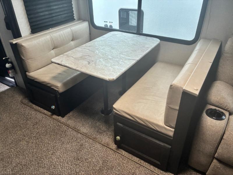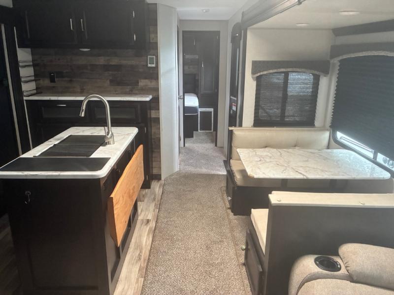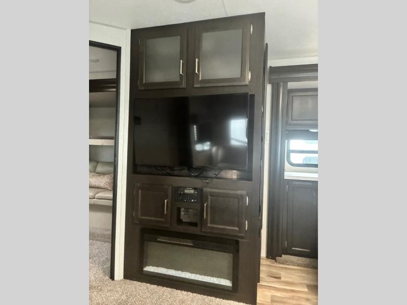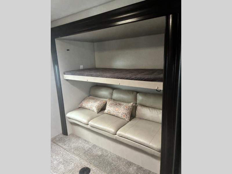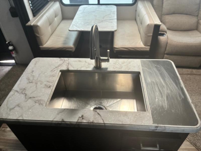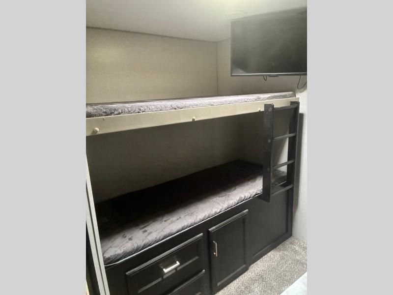 It will be amazingly easy to take the family out with this SportTrek travel trailer! There is a rear bunkhouse with a flip-up bunk, a 70" sofa with table, and a set of bunks, and there is even a closet so that your kids can store their clothes away. If you like watching movies, then you will definitely be impressed by the interior 40" TV with swing arm and the exterior 38" TV. The exterior TV is made even more special since there is also an outdoor café, so now you can make movie night a truly spectacular event. Back on the interior, the kitchen island is going to provide you with extra prep space in the kitchen, and at the front of this trailer is a master suite for you and your spouse.