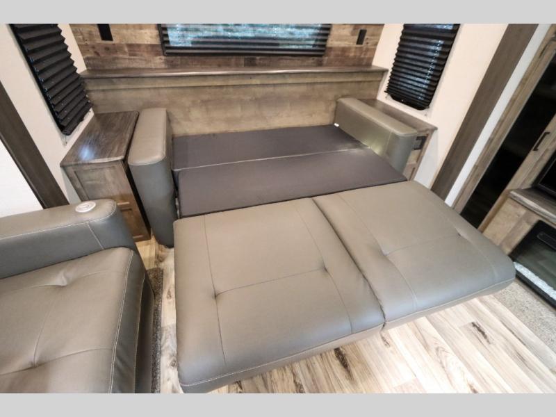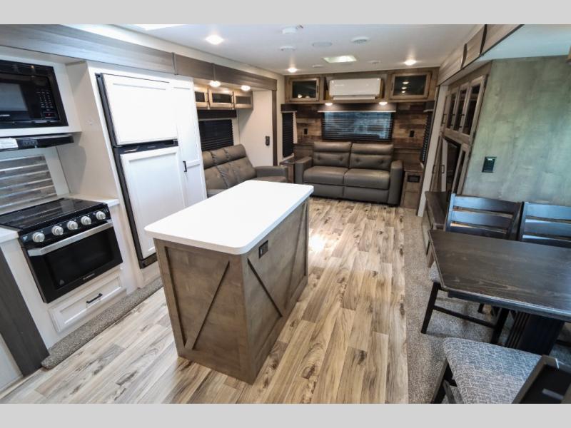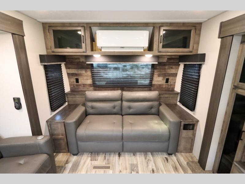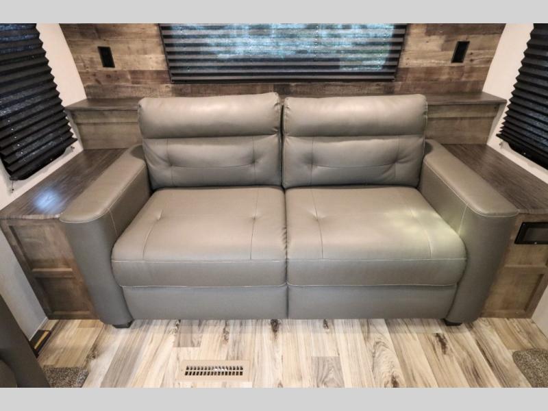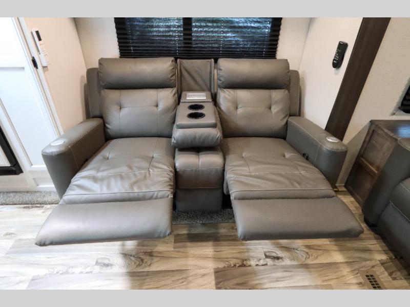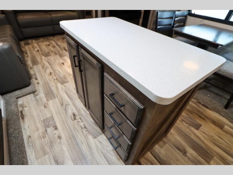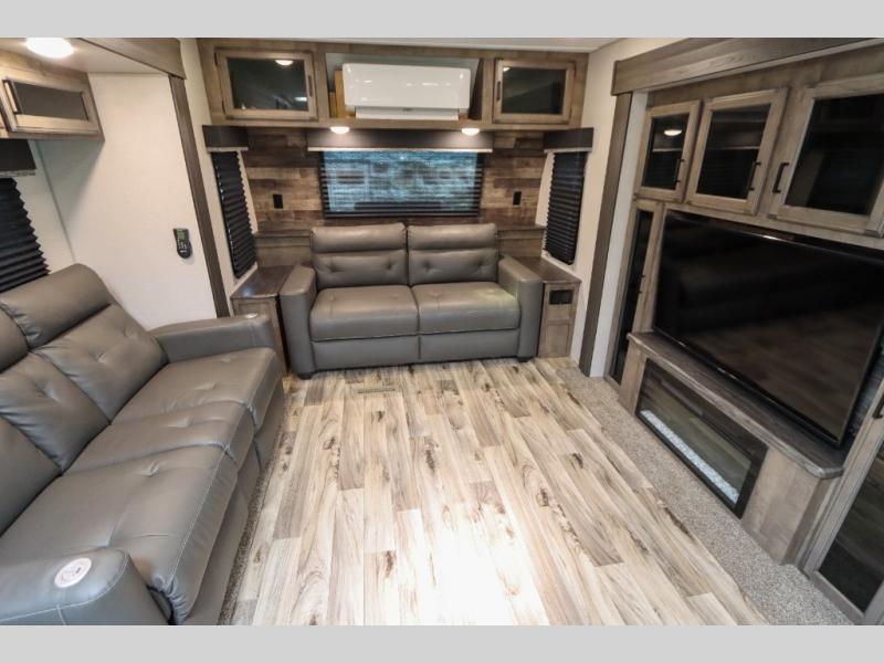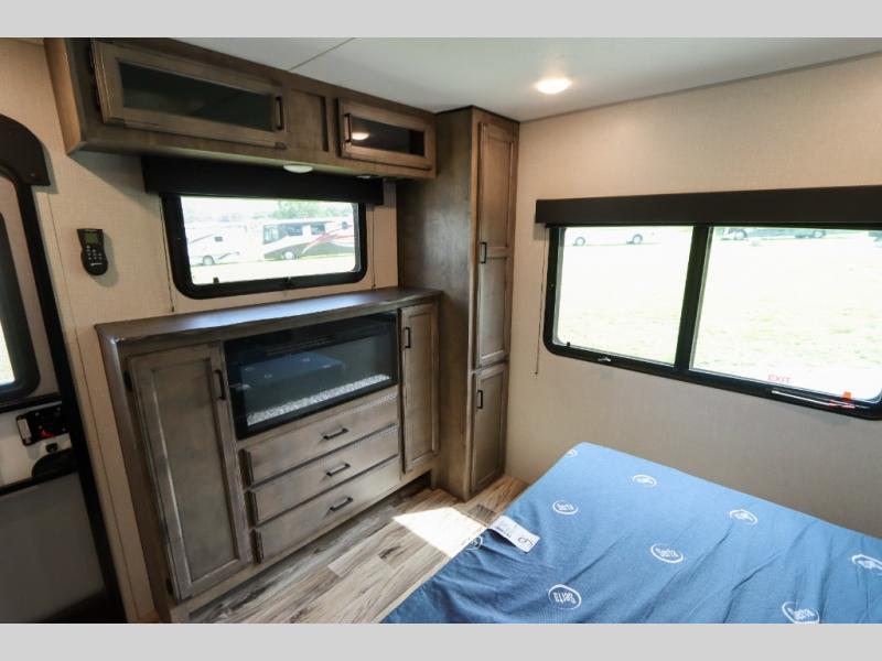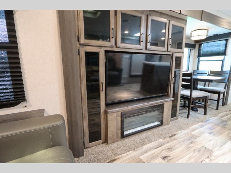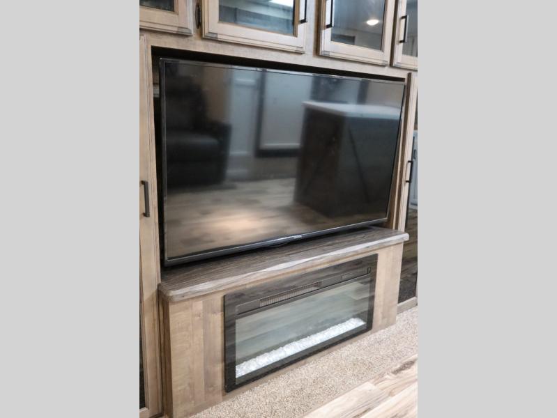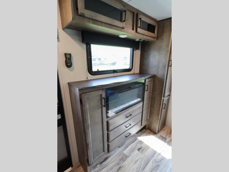 This travel trailer is a great way for you and your spouse to escape the hustle and bustle of everyday life! The rear private bedroom features a Sleep Tight king bed slide across from a dresser with a fireplace and has a closet that is prepped to add the optional washer and dryer, plus it has an entrance/exit door with triple pull-out aluminum steps for your convenience. You can prepare delicious home cooked meals with the three burner cooktop and the kitchen island then enjoy eating them at the table and chairs. Now that you've stuffed yourself full, relax on either the front 70" tri-fold sofa or the theater seating directly across from the entertainment center with a fireplace!