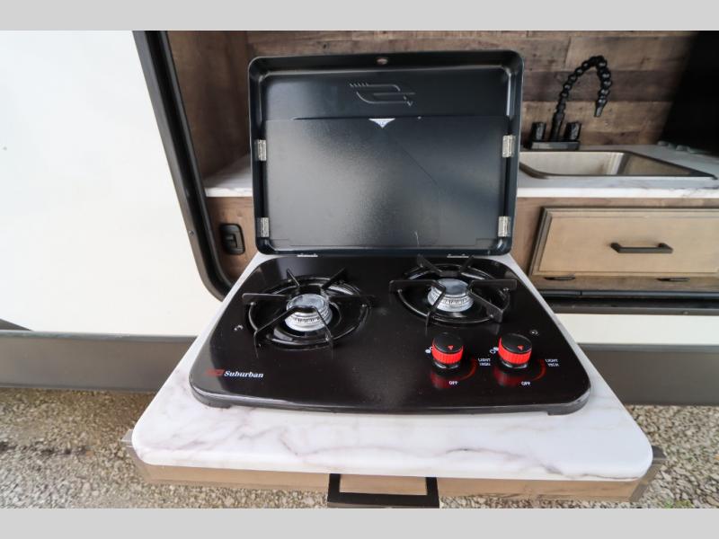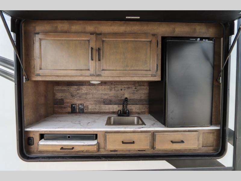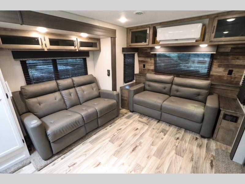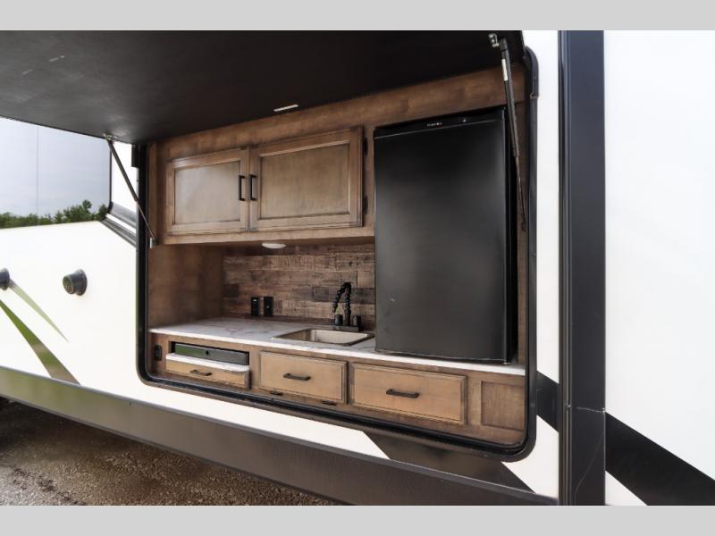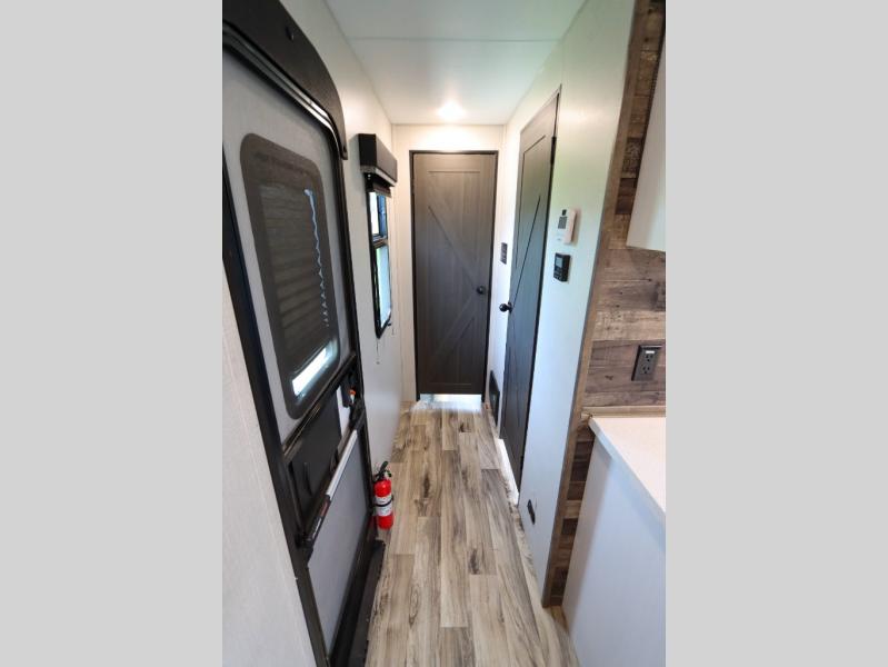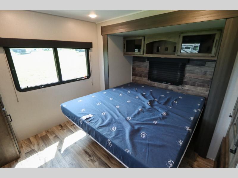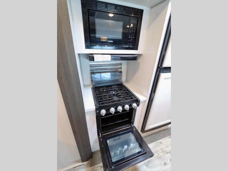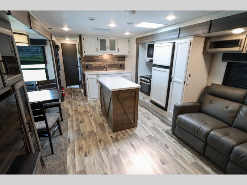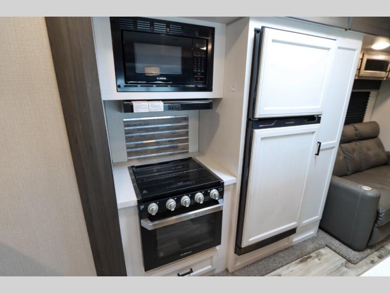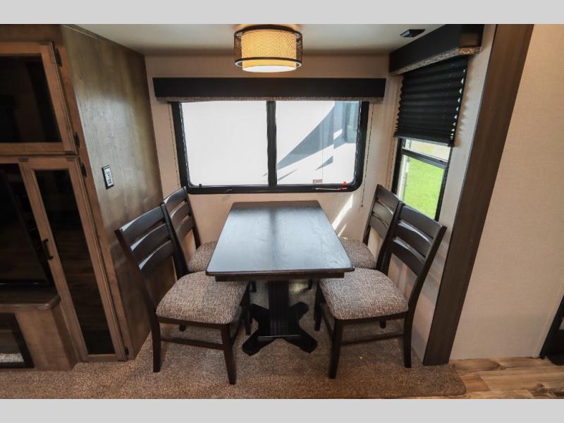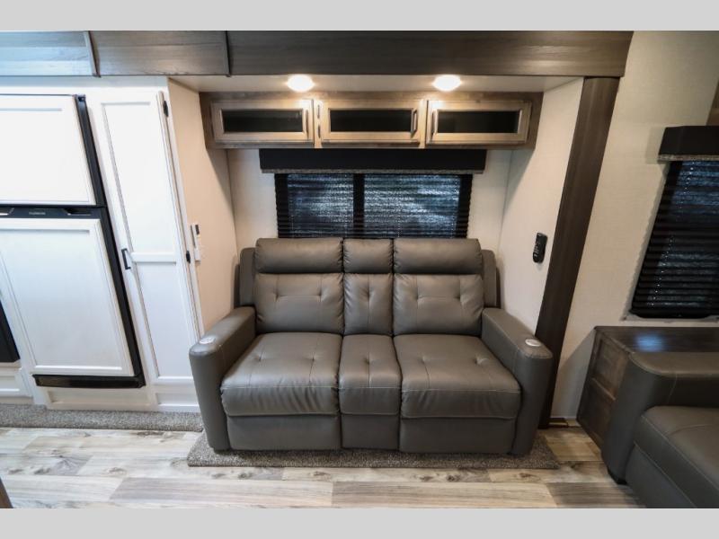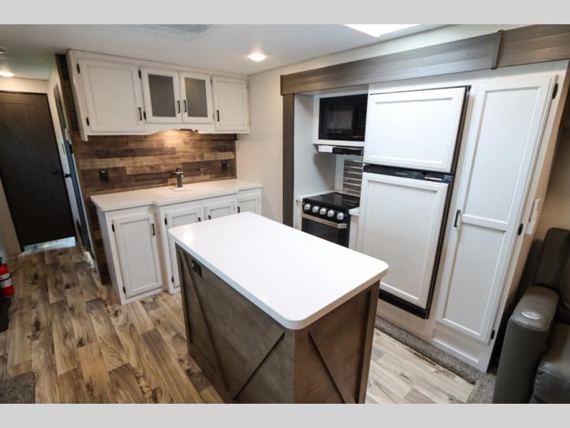 This travel trailer is a great way for you and your spouse to escape the hustle and bustle of everyday life! The rear private bedroom features a Sleep Tight king bed slide across from a dresser with a fireplace and has a closet that is prepped to add the optional washer and dryer, plus it has an entrance/exit door with triple pull-out aluminum steps for your convenience. You can prepare delicious home cooked meals with the three burner cooktop and the kitchen island then enjoy eating them at the table and chairs. Now that you've stuffed yourself full, relax on either the front 70" tri-fold sofa or the theater seating directly across from the entertainment center with a fireplace!