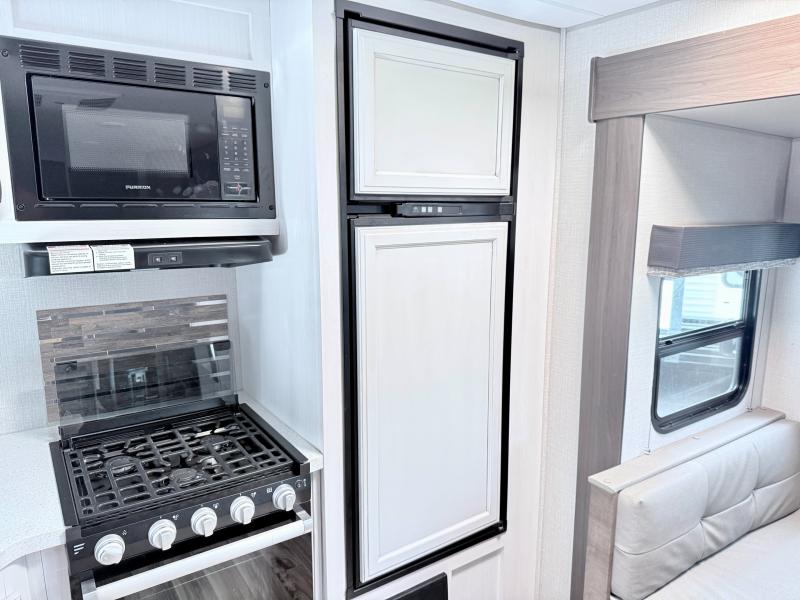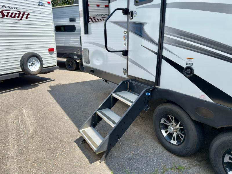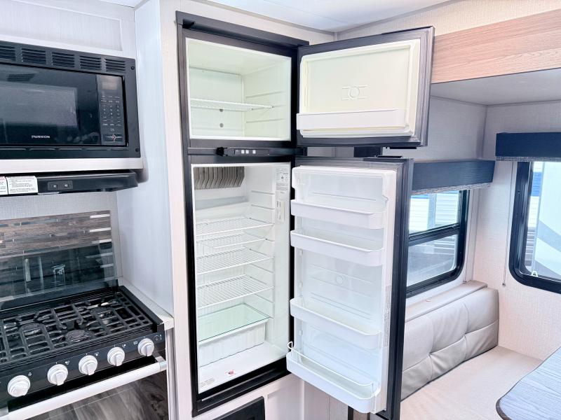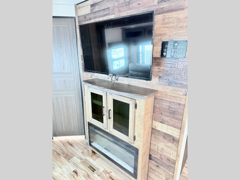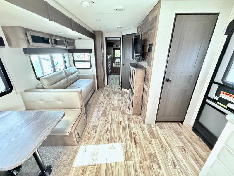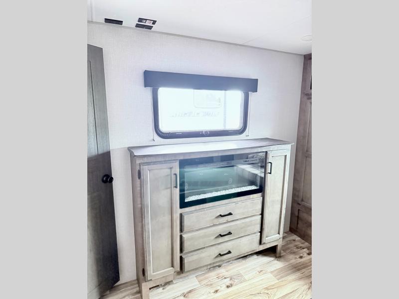 One step inside this travel trailer and you will want to go camping every weekend! You will love the front private bedroom with a front window seat, a slide out king bed, and your own fireplace for a cozy evening. The kids can convert the tri-fold sofa bed or the 42" grand dinette at night for a comfortable sleeping space. Prepare a big breakfast on the three burner cooktop, then take your plate to sit under the 16' power awning outside. After you've filled your day with hiking, you can freshen up in the full bath that includes a 30" x 36" shower. This model also includes plenty of storage, including a walk-in pantry just inside the entry door for convenience!