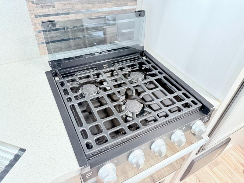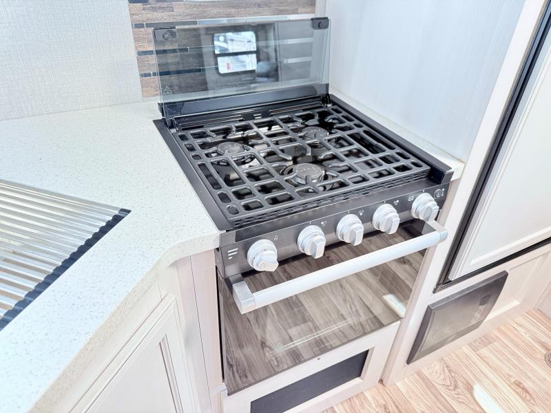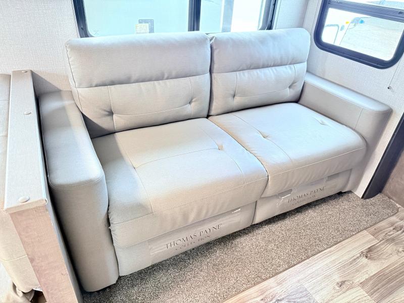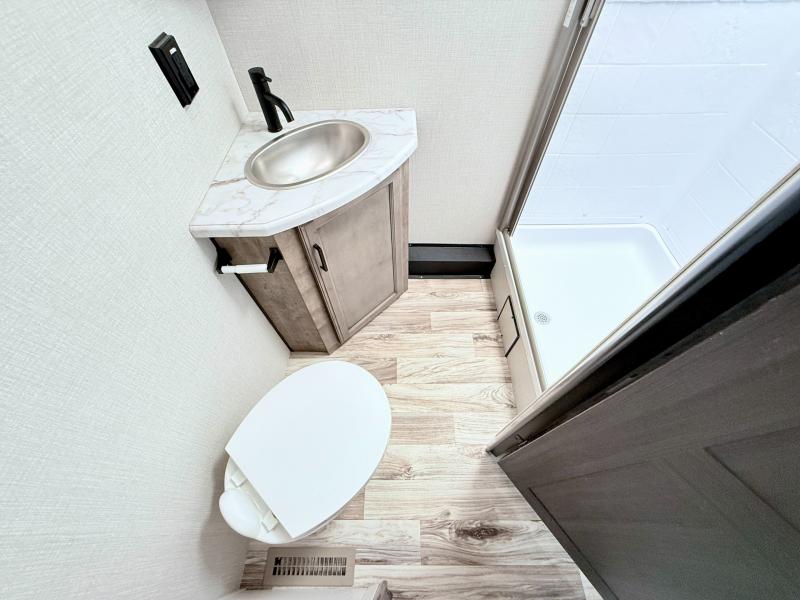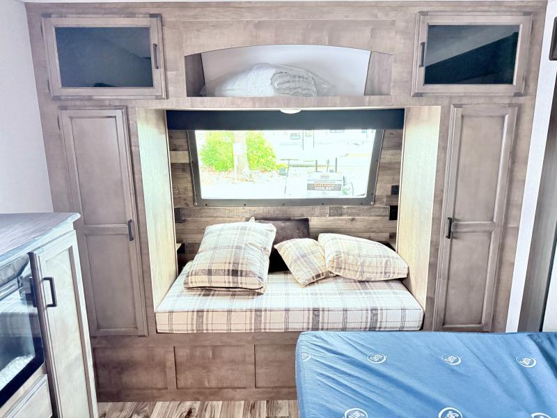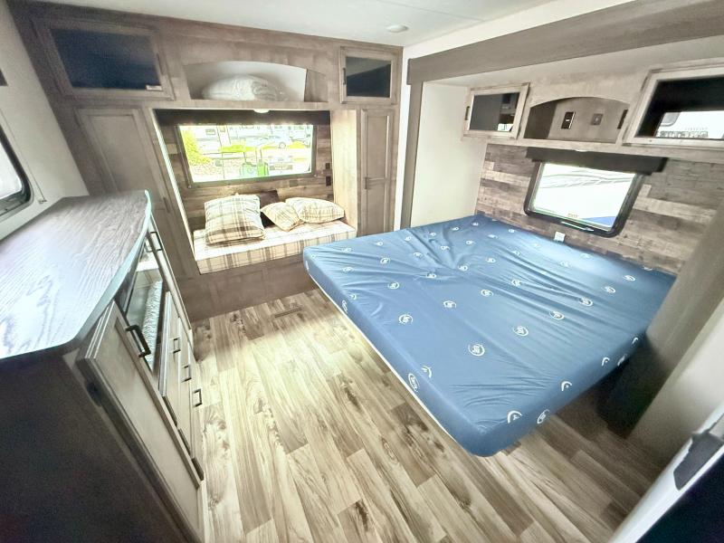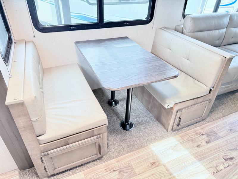 One step inside this travel trailer and you will want to go camping every weekend! You will love the front private bedroom with a front window seat, a slide out king bed, and your own fireplace for a cozy evening. The kids can convert the tri-fold sofa bed or the 42" grand dinette at night for a comfortable sleeping space. Prepare a big breakfast on the three burner cooktop, then take your plate to sit under the 16' power awning outside. After you've filled your day with hiking, you can freshen up in the full bath that includes a 30" x 36" shower. This model also includes plenty of storage, including a walk-in pantry just inside the entry door for convenience!