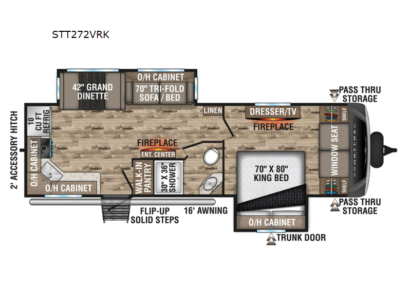 One step inside this travel trailer and you will want to go camping every weekend! You will love the front private bedroom with a front window seat, a slide out king bed, and your own fireplace for a cozy evening. The kids can convert the tri-fold sofa bed or the 42" grand dinette at night for a comfortable sleeping space. Prepare a big breakfast on the three burner cooktop, then take your plate to sit under the 16' power awning outside. After you've filled your day with hiking, you can freshen up in the full bath that includes a 30" x 36" shower. This model also includes plenty of storage, including a walk-in pantry just inside the entry door for convenience!