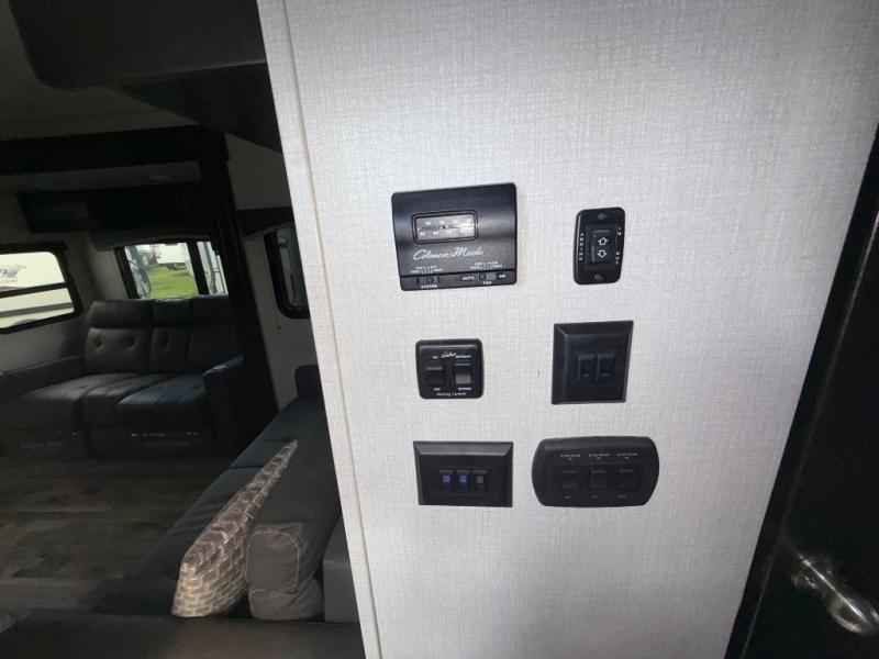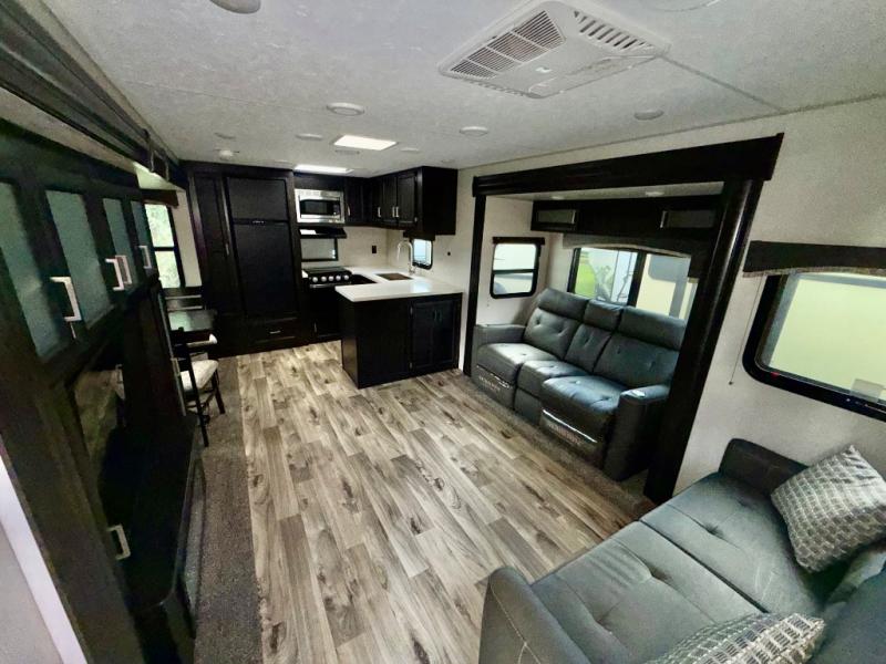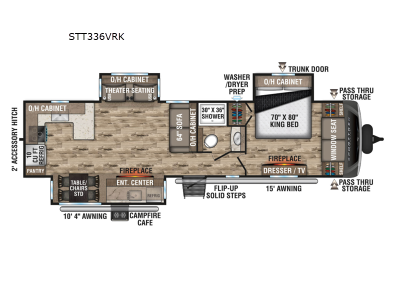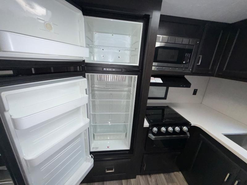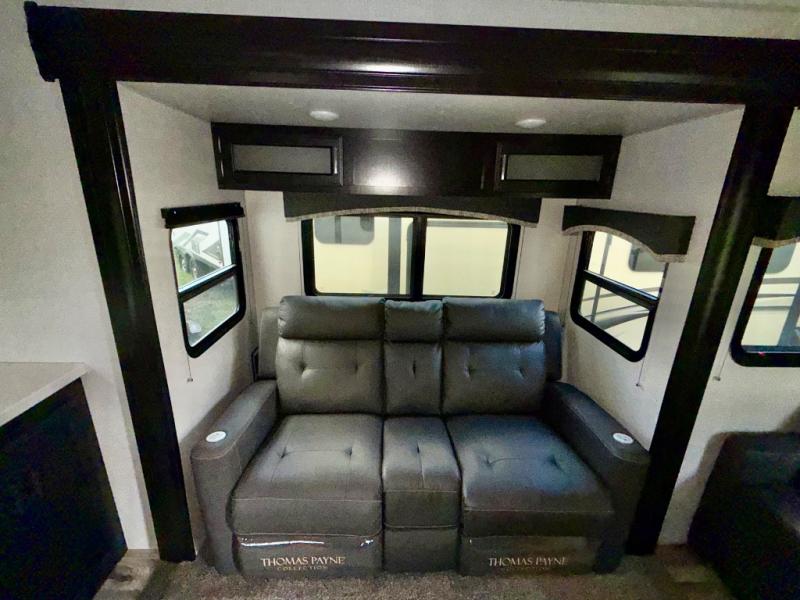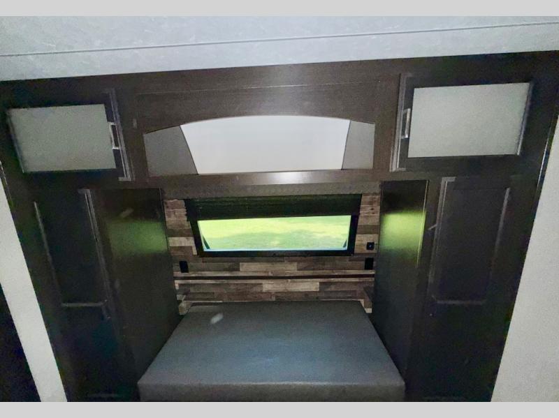 The chef of your group will love cooking in the rear kitchen of this travel trailer! They can even breathe in some fresh air while they cook dinner thanks to the outside campfire cafe which has a refrigerator to keep their beverage cold. They will also stay protected underneath the 10' 4" power awning. The living area is the perfect place to wind down your nights by relaxing on either the 64" sofa with overhead cabinets or the theater seating slide across from the entertainment center with a fireplace. If mother nature rains on your parade then you can head to the front private bedroom, grab your favorite book, and sit on the front window seat while you enjoy the fireplace in the bedroom too. There is also a closet that is prepped to add the optional washer and dryer so that you can extend your trip with clean clothes!
