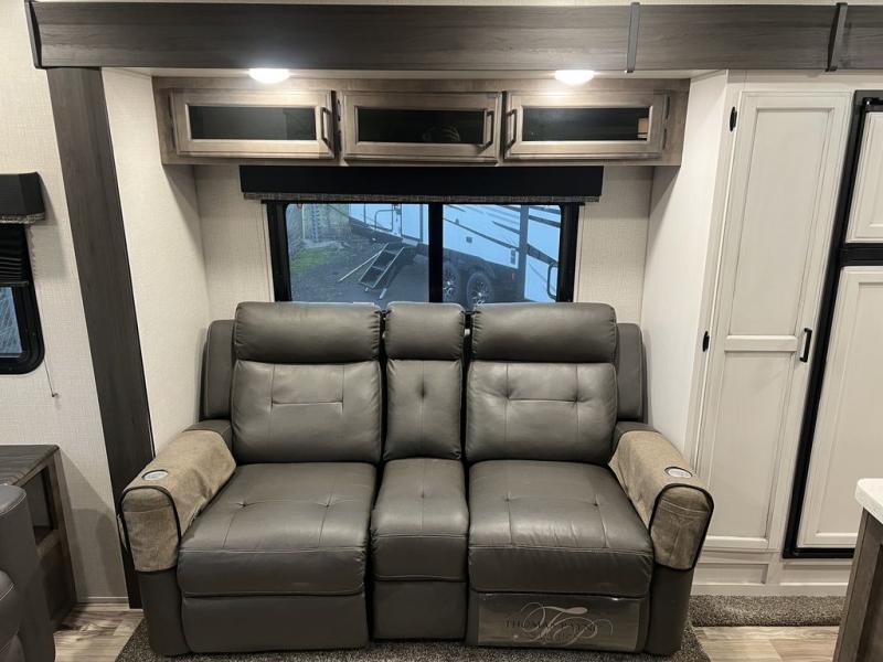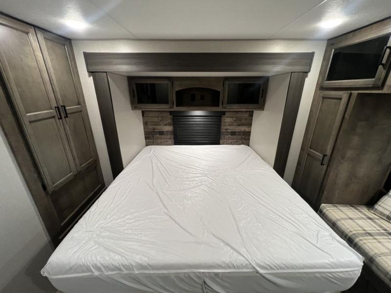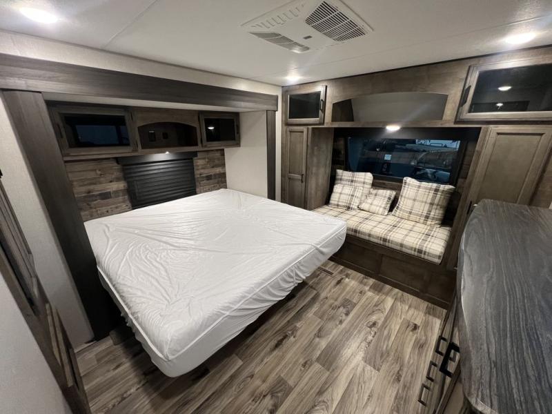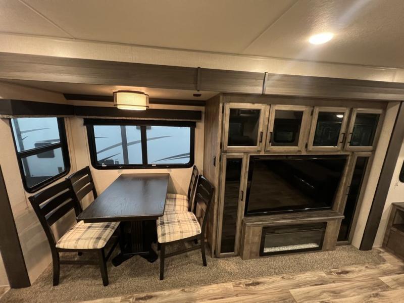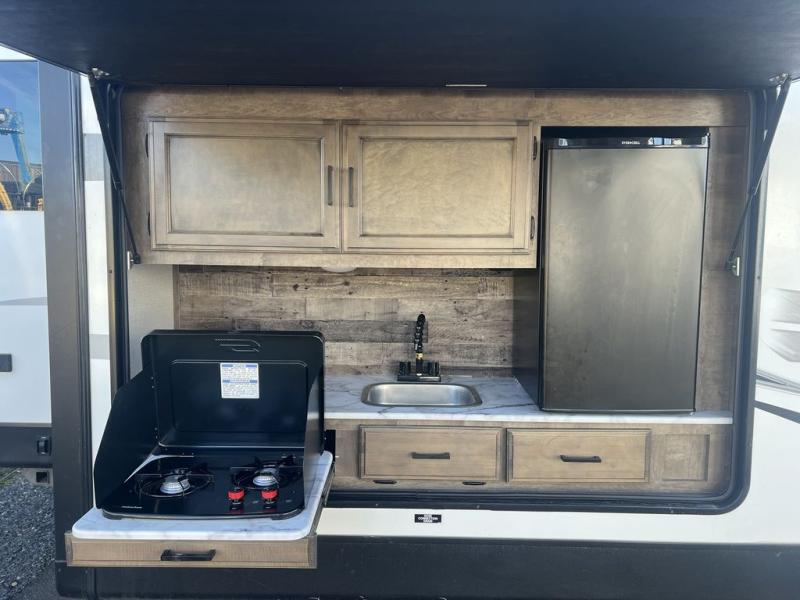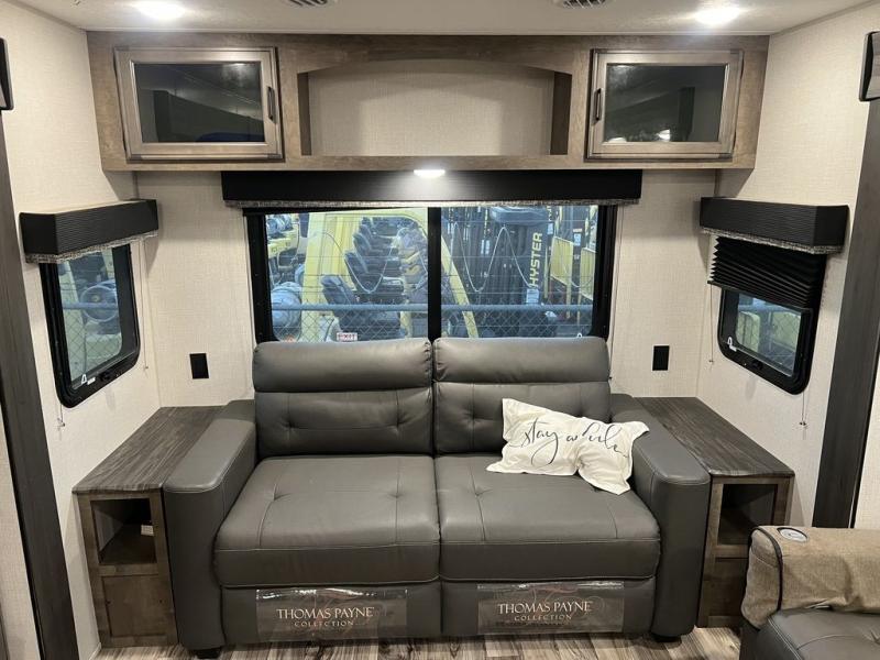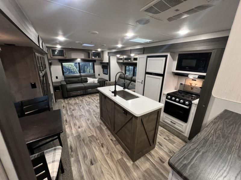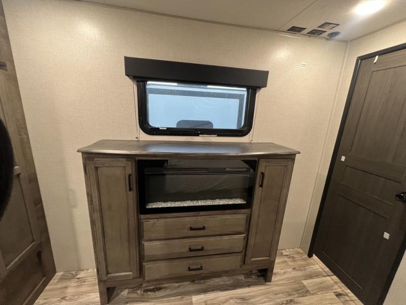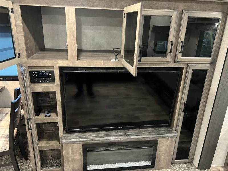 You will enjoy a relaxing evening each night in the rear living area of this travel trailer! It features a 70" sofa with end tables on either side to set your drink on and theater seating with USB charging outlets across from the entertainment center with a fireplace. The kitchen has a three burner cooktop for you to cook a delicious meal, a 10 cu. ft. refrigerator to store any leftovers in, and an island with a large sink to make clean up easier, plus there is a hutch to store your nice dishes. You can end each night feeling squeaky clean after showering in the 30" x 36" shower, and then head to the front private bedroom and read a book at the front window seat while the fireplace is going. There is also a king bed slide for you to sleep on and a closet that is prepped to add the optional washer and dryer!