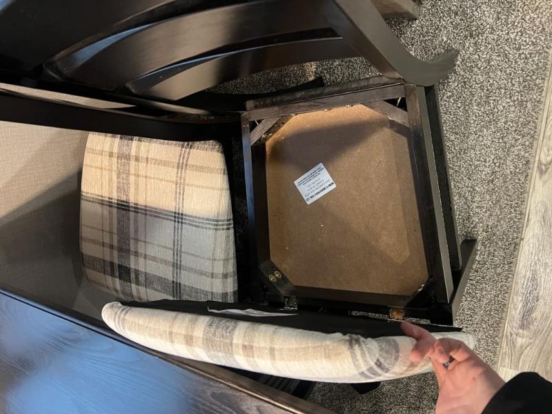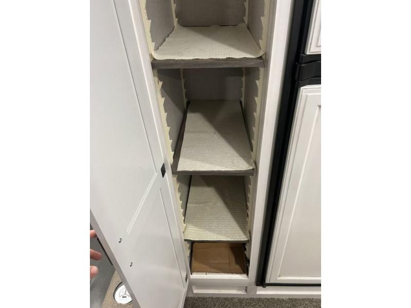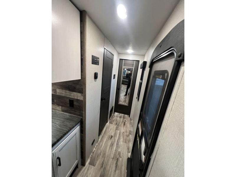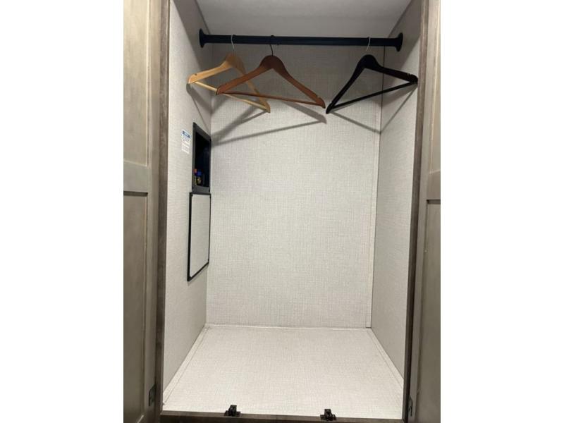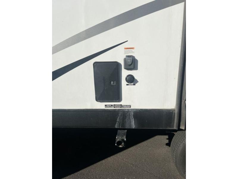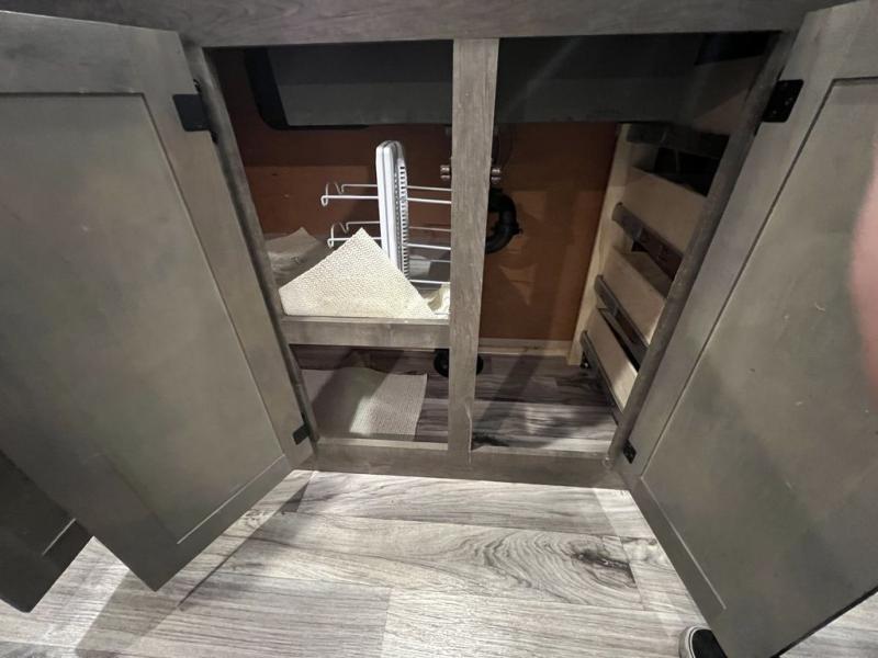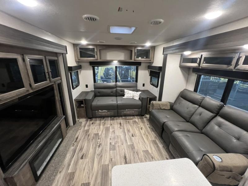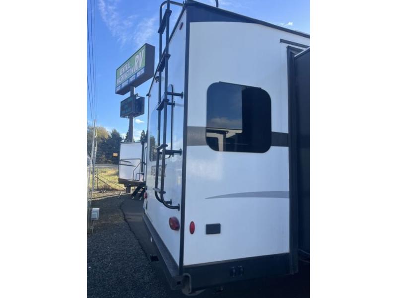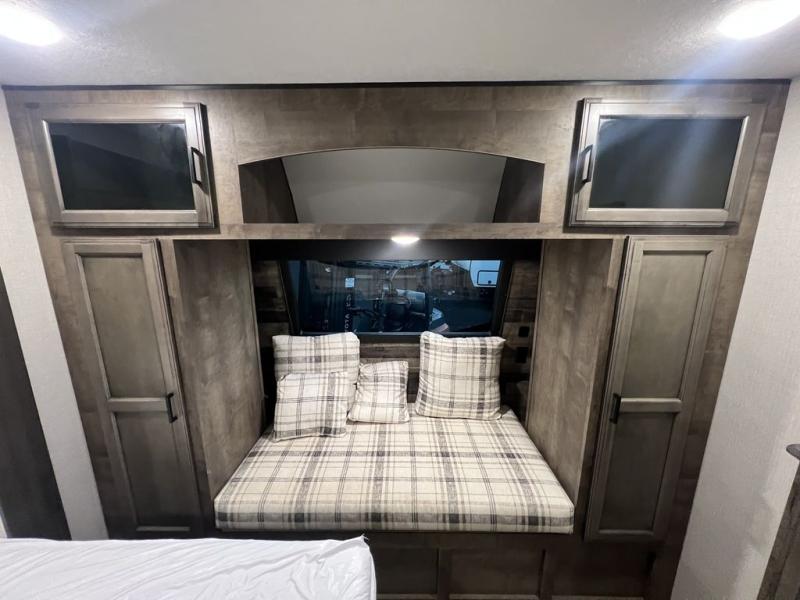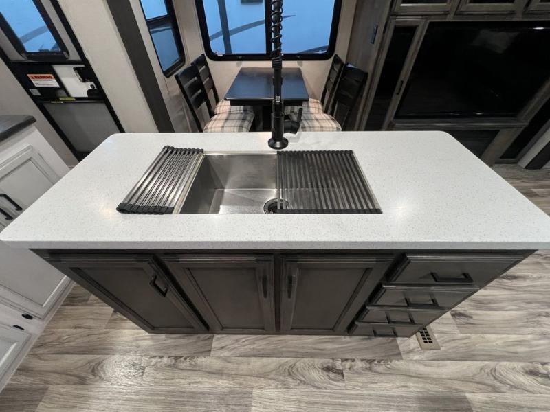 You will enjoy a relaxing evening each night in the rear living area of this travel trailer! It features a 70" sofa with end tables on either side to set your drink on and theater seating with USB charging outlets across from the entertainment center with a fireplace. The kitchen has a three burner cooktop for you to cook a delicious meal, a 10 cu. ft. refrigerator to store any leftovers in, and an island with a large sink to make clean up easier, plus there is a hutch to store your nice dishes. You can end each night feeling squeaky clean after showering in the 30" x 36" shower, and then head to the front private bedroom and read a book at the front window seat while the fireplace is going. There is also a king bed slide for you to sleep on and a closet that is prepped to add the optional washer and dryer!