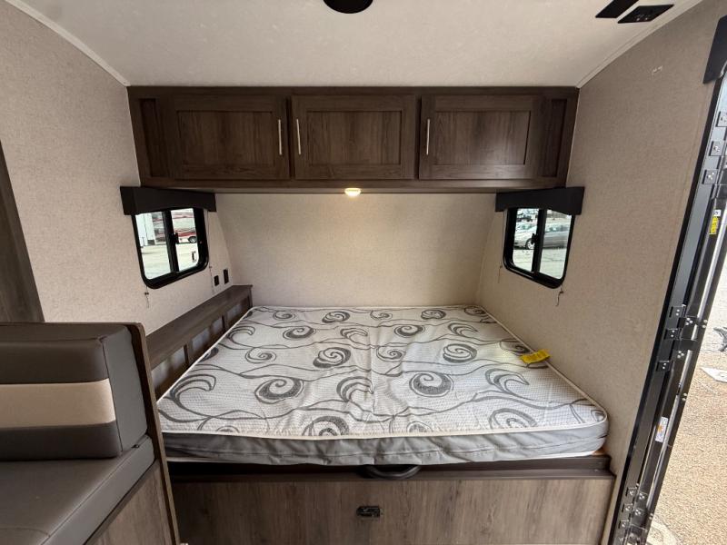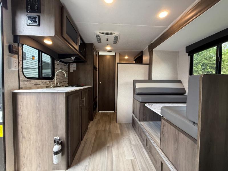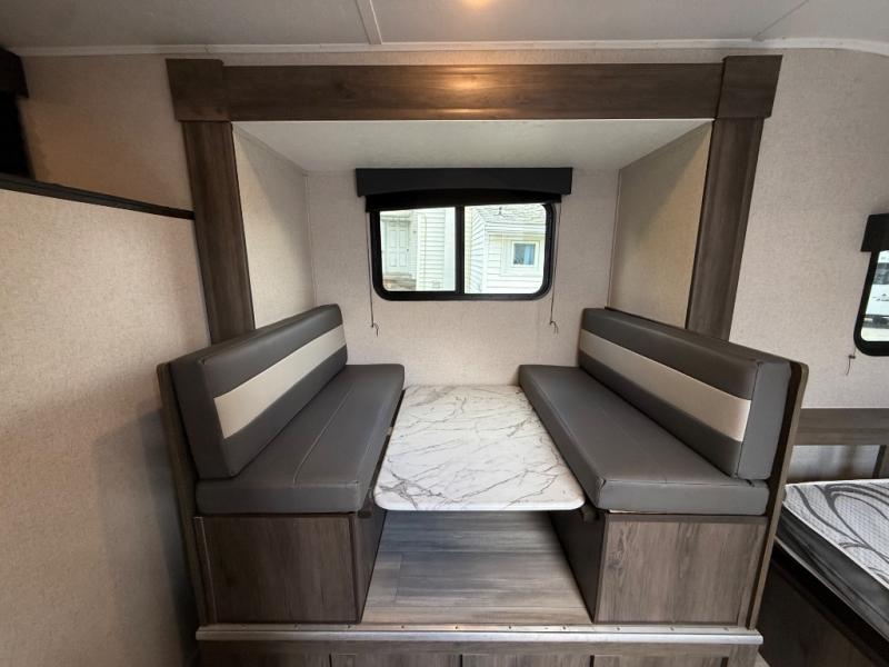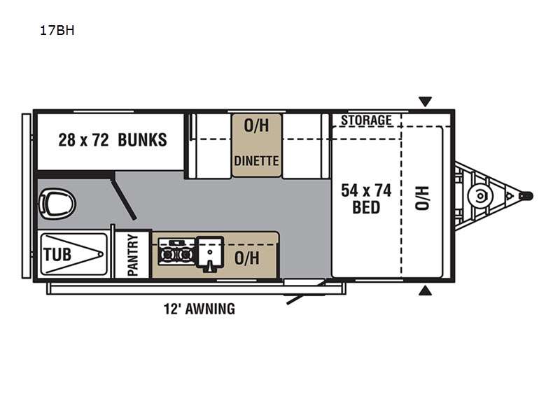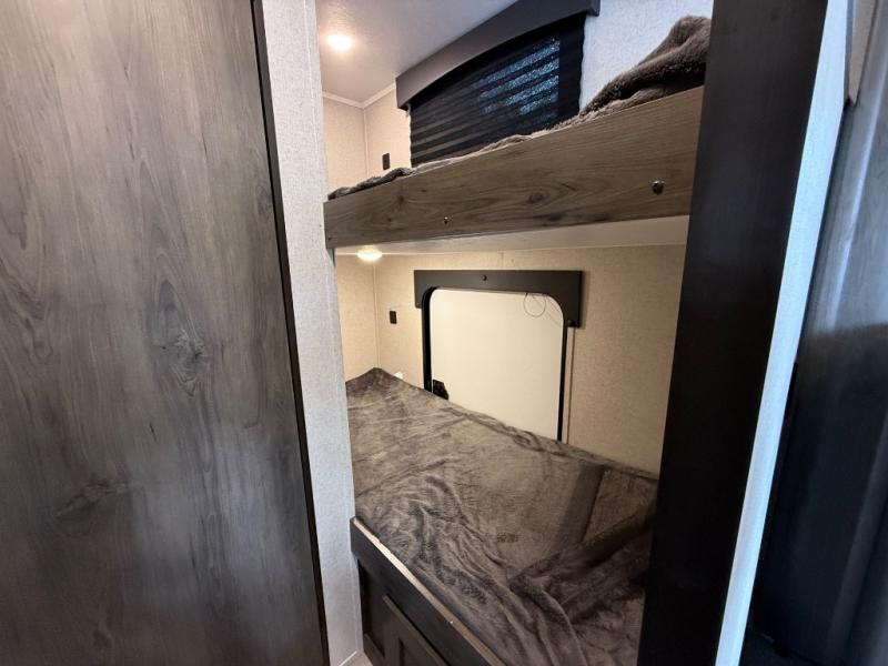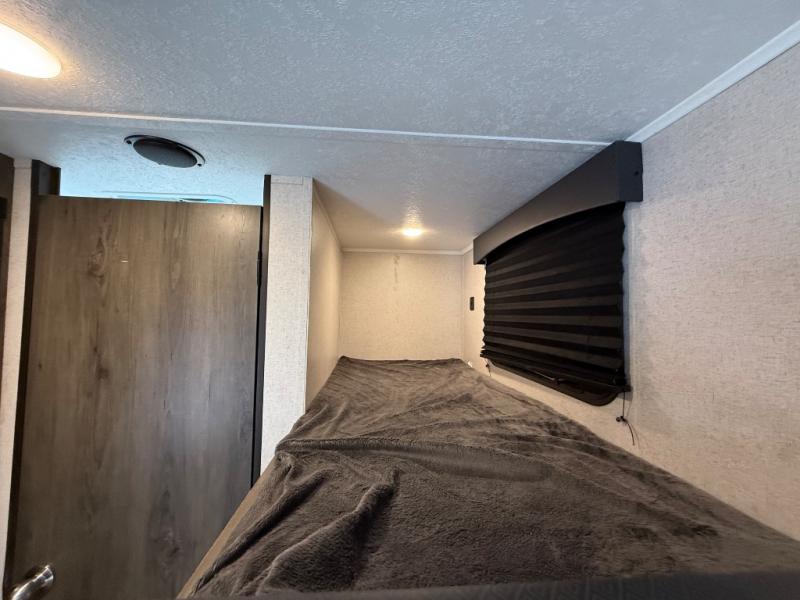 This family-friendly trailer allows you to get away quickly to have fun in the great outdoors! The kiddos or your friends can choose the top or bottom bunk or the booth dinette while you get to sleep on the double-size bed up front. The convenience of a private tub and toilet allow you to get ready for the next adventure without having to wait in line at the public restroom, and the 12' power awning will be the perfect place to sit under and watch the kids play!