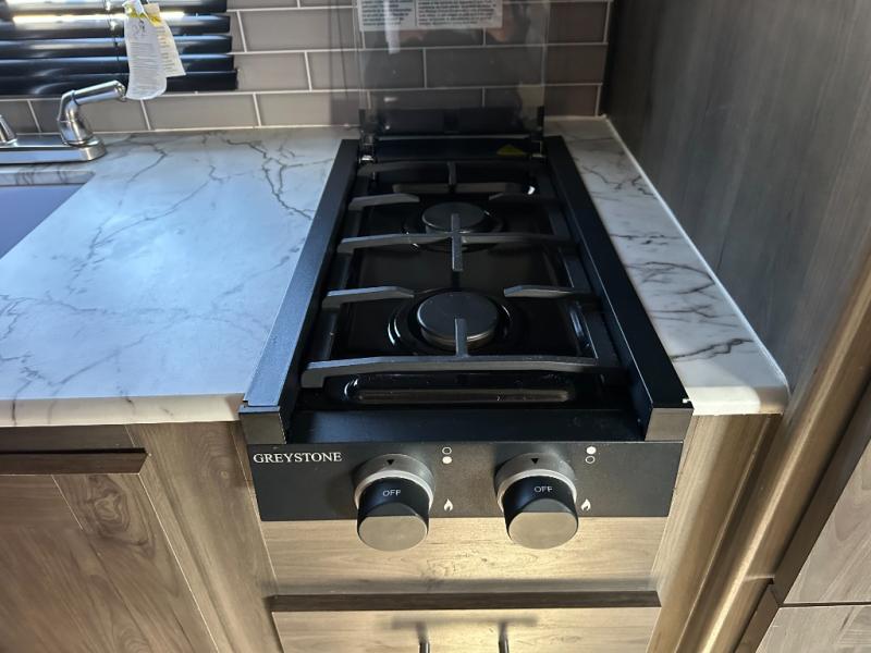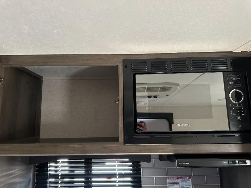 The convenient kitchen in the 182DBU is well-equipped for life on the road. Featuring a cooktop, microwave, and refrigerator, it gives you the tools you need to prepare anything from quick breakfasts before a sunrise hike to hearty dinners after a day of exploring. Ample countertop space and smartly placed storage cabinets help keep cookware, dishes, and pantry items organized and within easy reach.