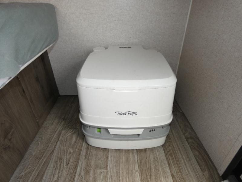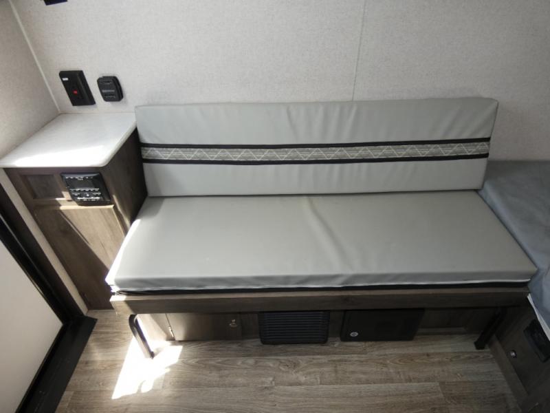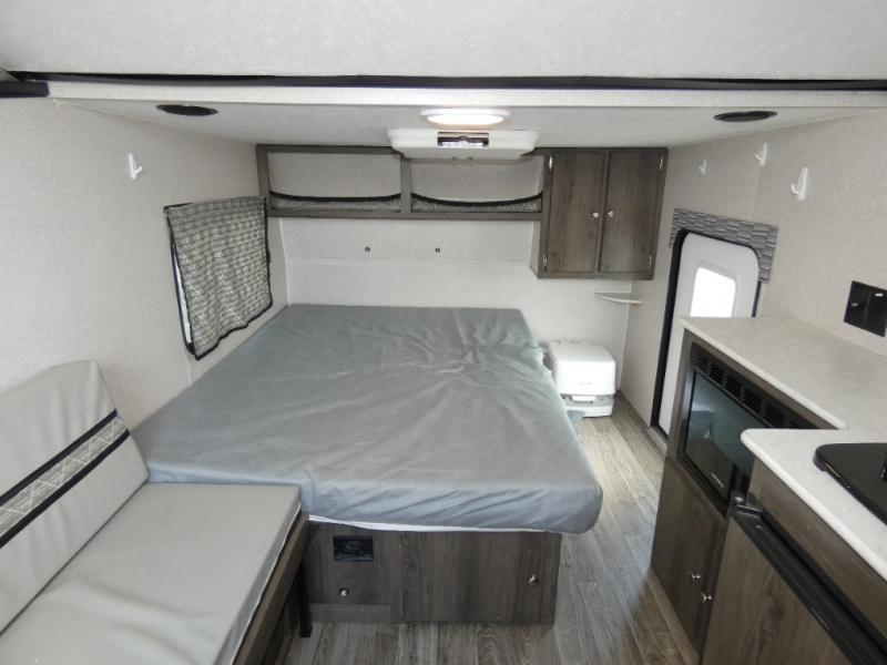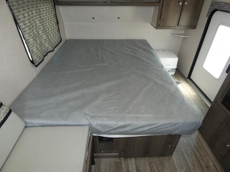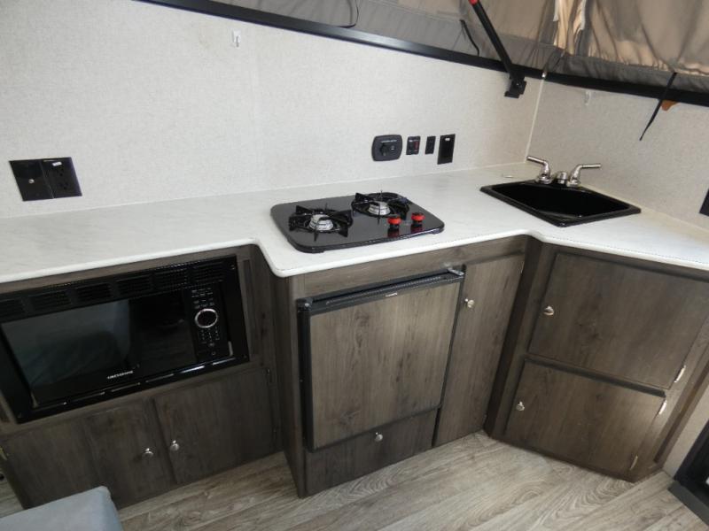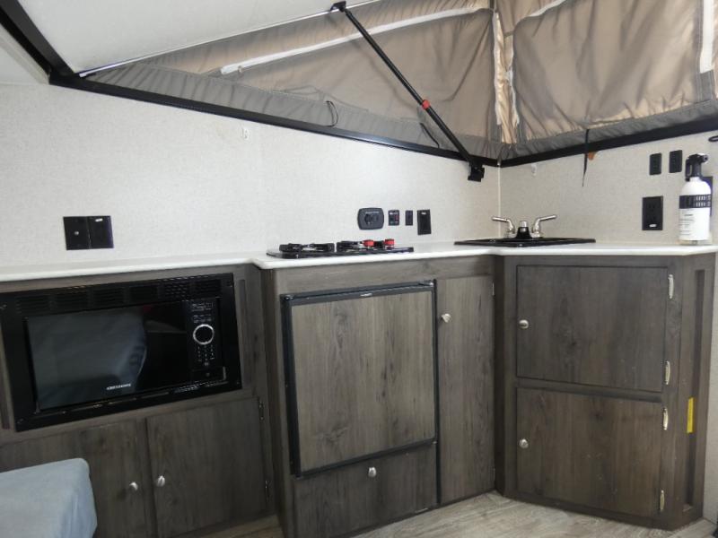 Last-minute plans to explore the outdoors can happen with this Viking Express Series folding pop-up camper! While you are headed to the campsite, you might need to get to something from inside the camper at a stop, so just use the side bike door without having to raise the roof. You and your spouse will have a full-size bed to sleep on, and the sofa might even accommodate one more person. You can make warm meals on the two-burner range, wash dishes and brush your teeth using the sink, and store leftovers in the 1.9-cubic foot refrigerator underneath.