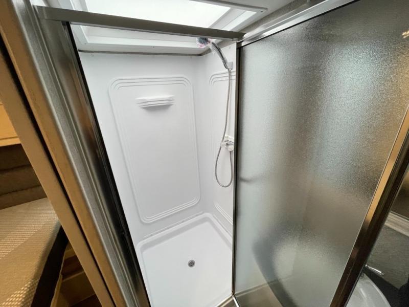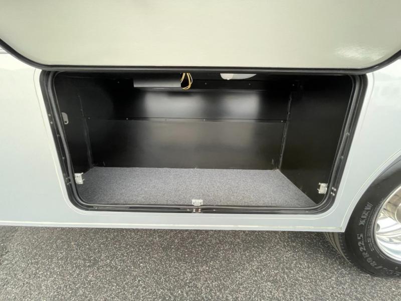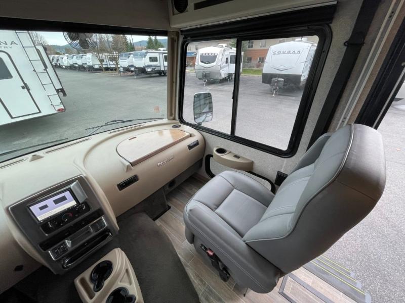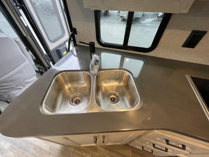 The family-friendly Adventurer Class A gas motorhome by Winnebago is the ultimate family getaway for your trips near and far. The swivel captain's seats include fixed lumbar support and multi-adjustable slide/recline for a truly comfortable ride. You will appreciate the 7" Bluetooth multimedia radio with a rearview/sideview monitor system and color touchscreen for easy navigation, and the powered MCD blackout roller visor/shade on the front windshield will provide privacy when you stop for lunch. Each model includes residential vinyl flooring throughout, a soft vinyl ceiling, a solid-surface kitchen countertop, and a double stainless steel sink with bamboo sink covers. The under-bed storage will provide a place for your luggage, and you'll find lighted storage compartments outside for all your larger gear. These models are constructed with a premium high-gloss fiberglass skin for a sleek look, and the electronic stability control will provide a smooth ride wherever the road takes you!