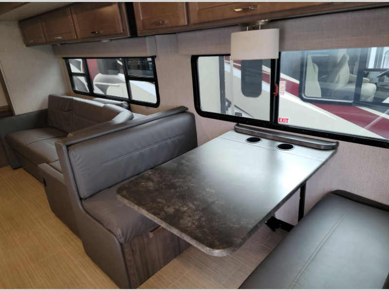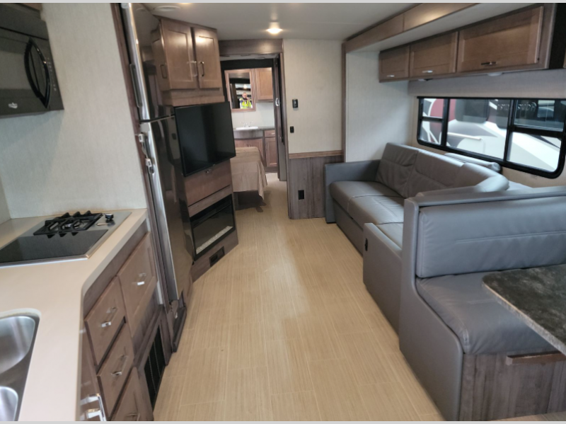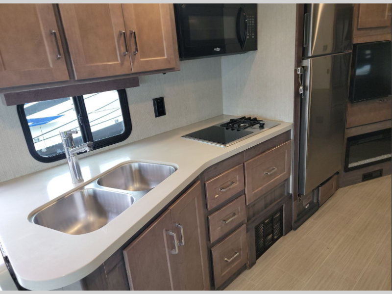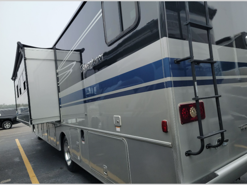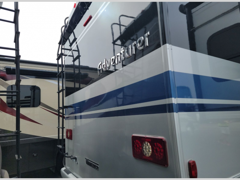 The family-friendly Adventurer Class A gas motorhome by Winnebago is the ultimate family getaway for your trips near and far. The swivel captain's seats include fixed lumbar support and multi-adjustable slide/recline for a truly comfortable ride. You will appreciate the 7" Bluetooth multimedia radio with a rearview/sideview monitor system and color touchscreen for easy navigation, and the powered MCD blackout roller visor/shade on the front windshield will provide privacy when you stop for lunch. Each model includes residential vinyl flooring throughout, a soft vinyl ceiling, a solid-surface kitchen countertop, and a double stainless steel sink with bamboo sink covers. The under-bed storage will provide a place for your luggage, and you'll find lighted storage compartments outside for all your larger gear. These models are constructed with a premium high-gloss fiberglass skin for a sleek look, and the electronic stability control will provide a smooth ride wherever the road takes you!