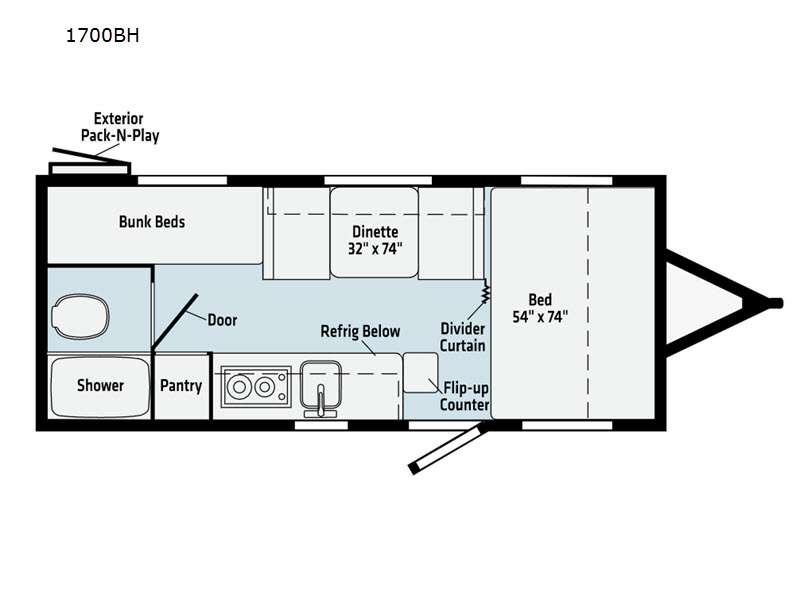 This travel trailer is ideal for a family! With a set of bunk beds in the rear corner and a front 54" x 74" bed up front, everyone will enjoy a good night's rest. There is even an exterior pack-n-play door allowing you to easily store items under the bunks so they are safe inside. The rear corner bathroom has a shower with a skylight above for natural lighting. Once you are squeaky clean, you can grab a beverage from the refrigerator and play a card game at the 32" x 74" booth dinette. And the power awning will provide an outdoor living area protected from the elements so you can relax and unwind while enjoying the outdoors.