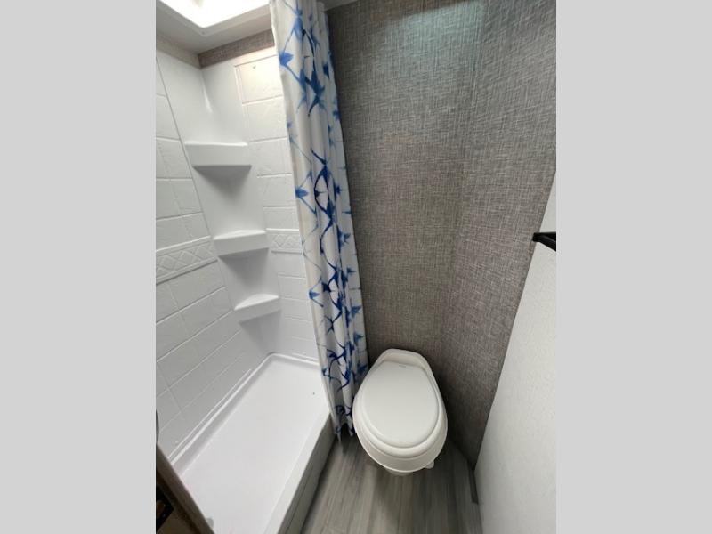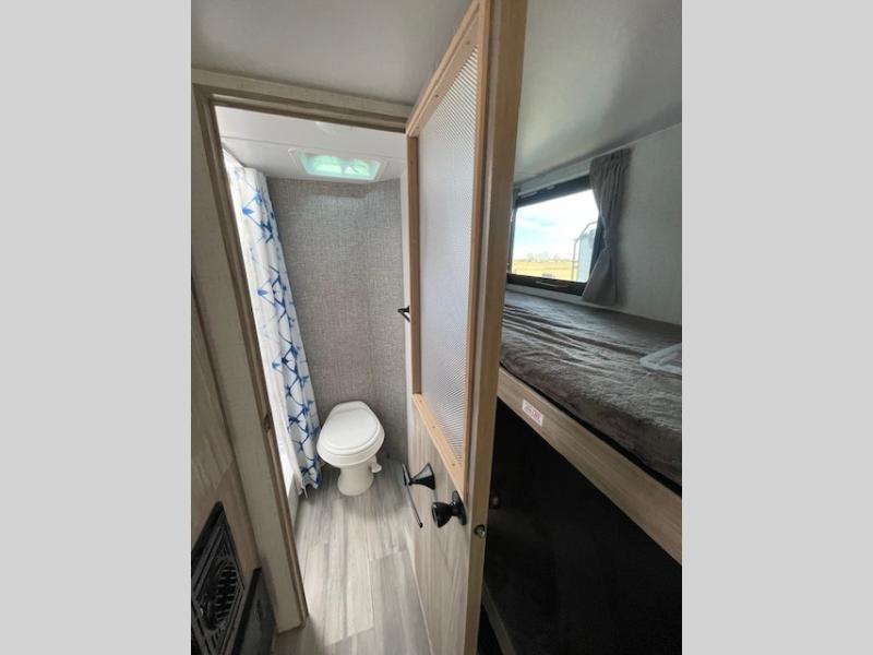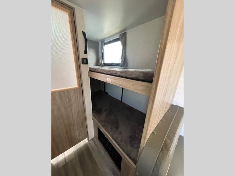 This travel trailer is ideal for a family! With a set of bunk beds in the rear corner and a front 54" x 74" bed up front, everyone will enjoy a good night's rest. There is even an exterior pack-n-play door allowing you to easily store items under the bunks so they are safe inside. The rear corner bathroom has a shower with a skylight above for natural lighting. Once you are squeaky clean, you can grab a beverage from the refrigerator and play a card game at the 32" x 74" booth dinette. And the power awning will provide an outdoor living area protected from the elements so you can relax and unwind while enjoying the outdoors.
