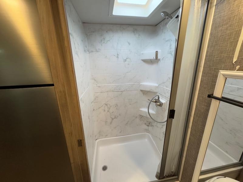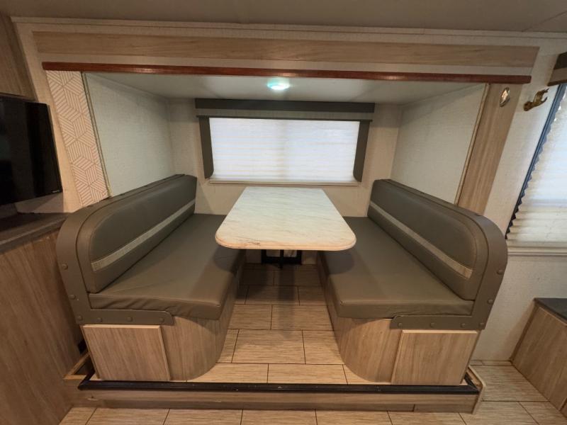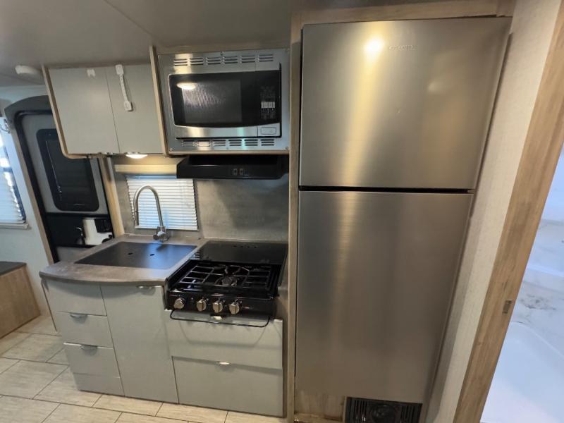 If you're looking for versatility then you need this travel trailer! Depending on the time of day you enter will determine whether you see the Murphy bed or the sofa up front. The 44" x 72" booth dinette slide can be used for eating your meals, playing games, and sleeping space at night. The full rear bathroom is equipped with everything you will need to freshen up each morning and provides a skylight above the shower and a wardrobe for your clothes and linens, plus a pocket door to save space. The LED TV is conveniently located so you can watch your favorite shows, plus the pantry offers a place to store your snacks and such for easy access. And the cook will love all the amenities to make meals including the handy flip-up counter.
