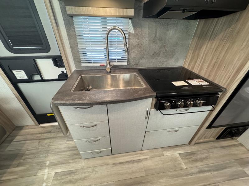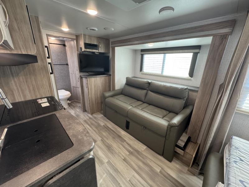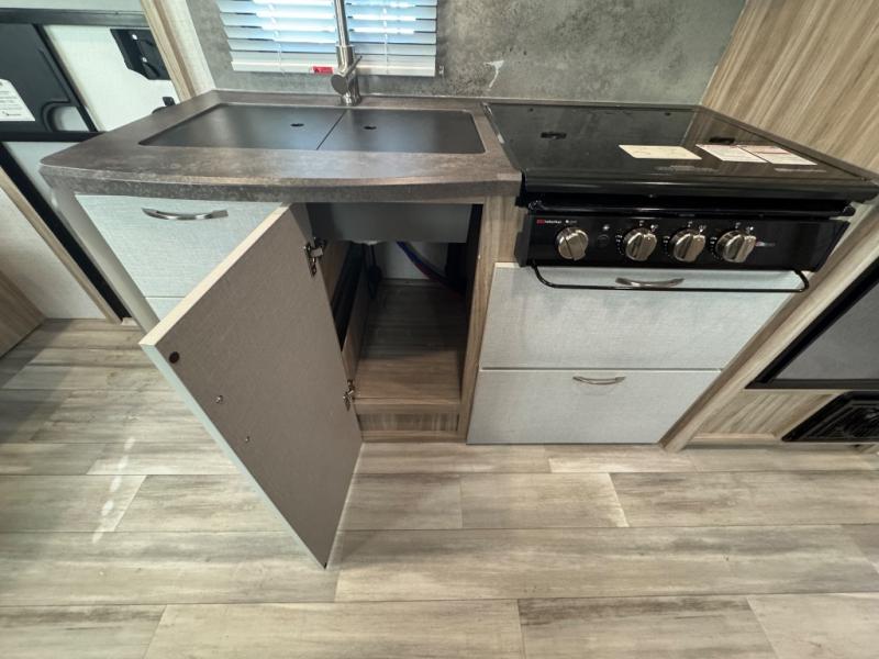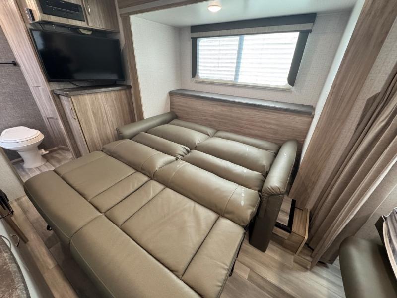 If you're looking for versatility then you need this travel trailer! Depending on the time of day you enter will determine whether you see the Murphy bed or the sofa up front. The 44" x 72" booth dinette slide can be used for eating your meals, playing games, and sleeping space at night. The full rear bathroom is equipped with everything you will need to freshen up each morning and provides a skylight above the shower and a wardrobe for your clothes and linens, plus a pocket door to save space. The LED TV is conveniently located so you can watch your favorite shows, plus the pantry offers a place to store your snacks and such for easy access. And the cook will love all the amenities to make meals including the handy flip-up counter.