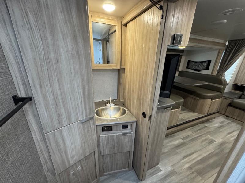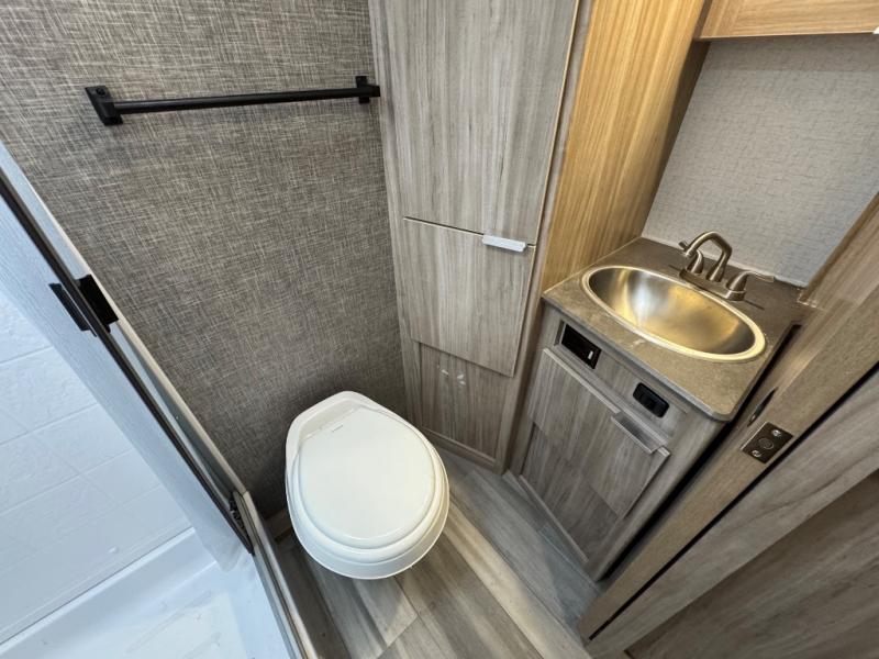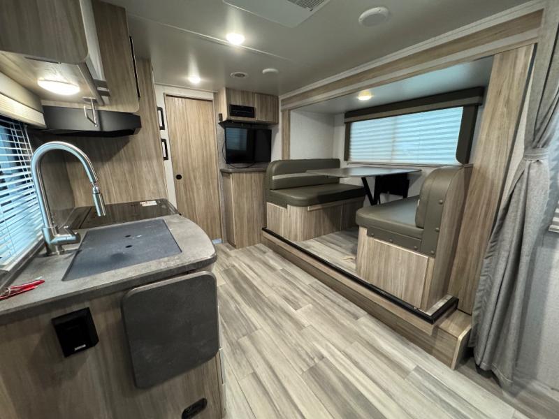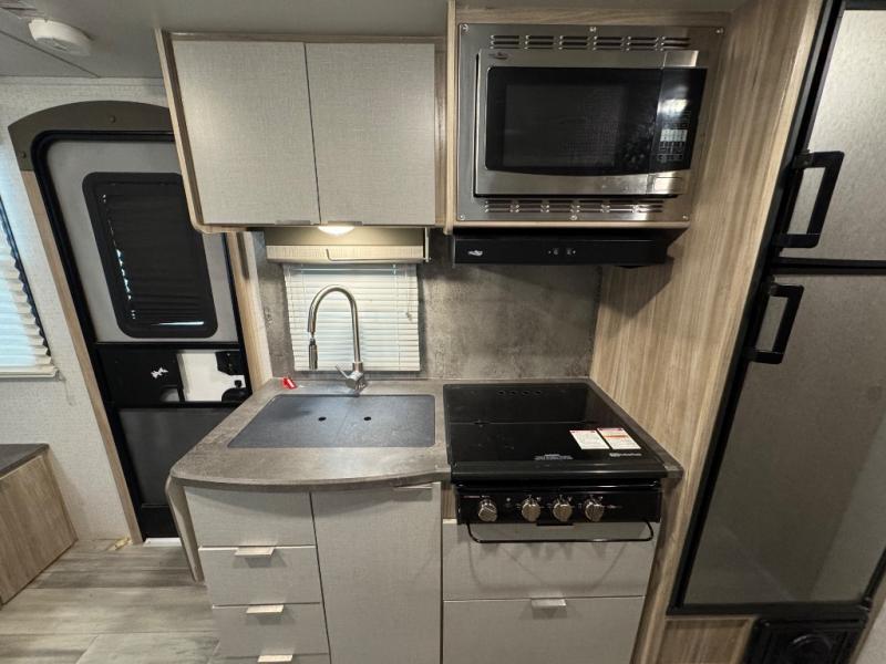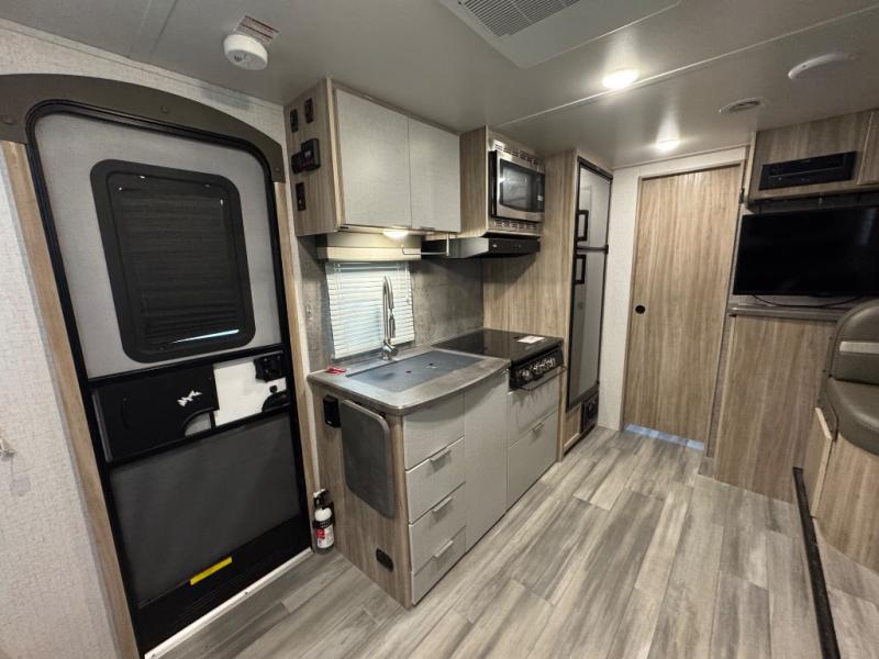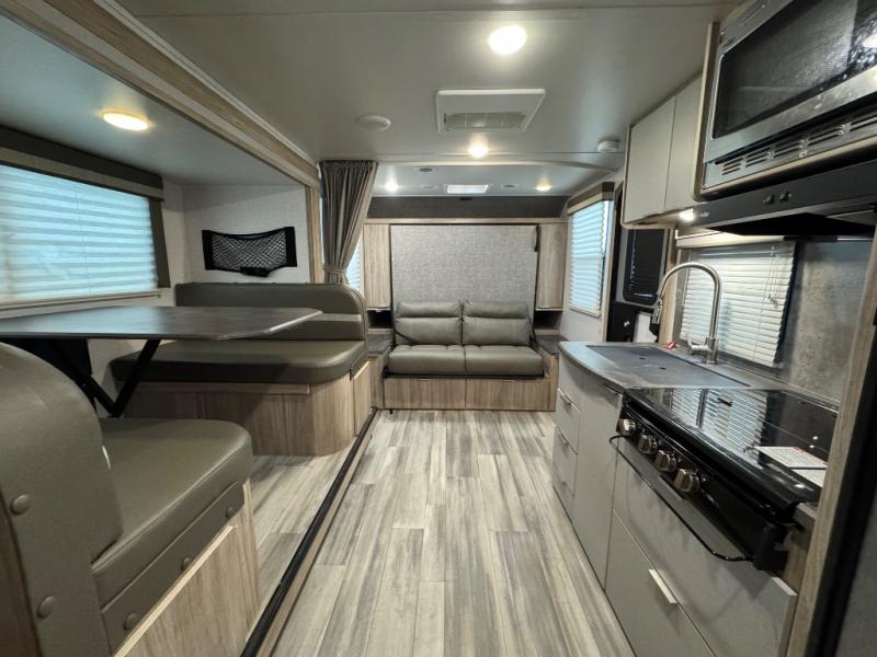If you're looking for versatility then you need this travel trailer! Depending on the time of day you enter will determine whether you see the Murphy bed or the sofa up front. The 44" x 72" booth dinette slide can be used for eating your meals, playing games, and sleeping space at night. The full rear bathroom is equipped with everything you will need to freshen up each morning and provides a skylight above the shower and a wardrobe for your clothes and linens, plus a pocket door to save space. The LED TV is conveniently located so you can watch your favorite shows, plus the pantry offers a place to store your snacks and such for easy access. And the cook will love all the amenities to make meals including the handy flip-up counter.