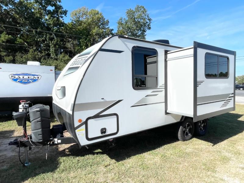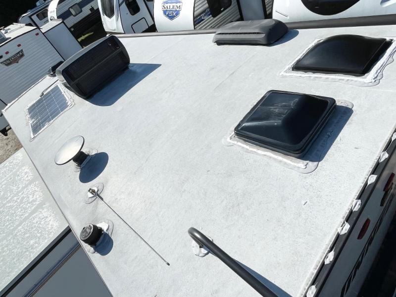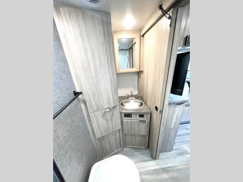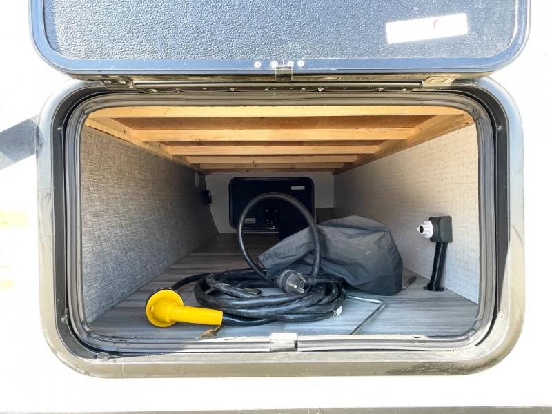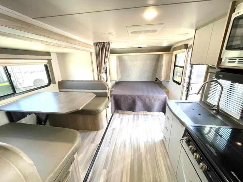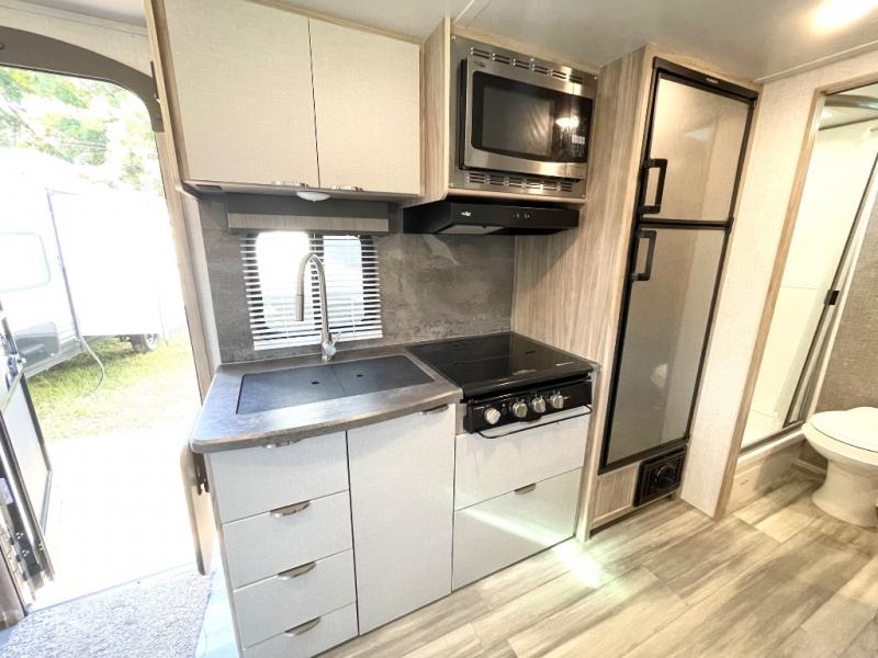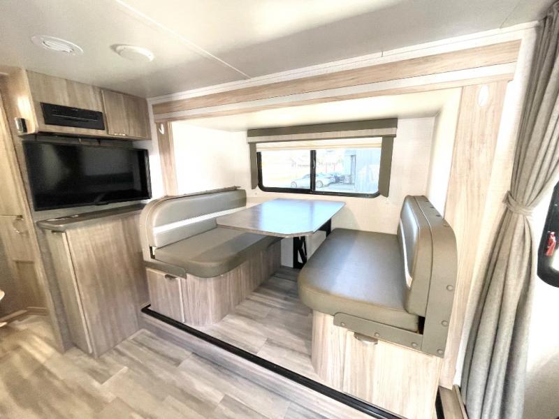 Pack your bags and head to the campground with this travel trailer! You will love all that it has to offer from the full rear bathroom with a skylight above the shower and a wardrobe for your clothes and linens to the front 60" x 74" RV queen bed with a wardrobe on one side, a nightstand on the other, and a privacy curtain to draw at night. The 44" x 72" booth dinette slide is not only a great place to enjoy your meals at or play card games, but also to transform into an extra sleeping space if you want to bring along a guest. When you don't feel like making dinner, you can easily pop in some leftovers or a bag of popcorn into the microwave and relax while you watch a movie on the LED TV!