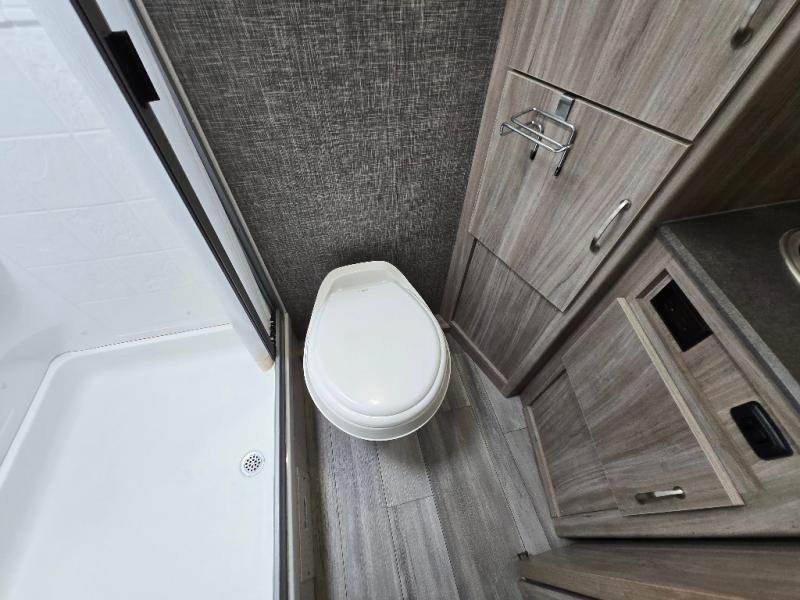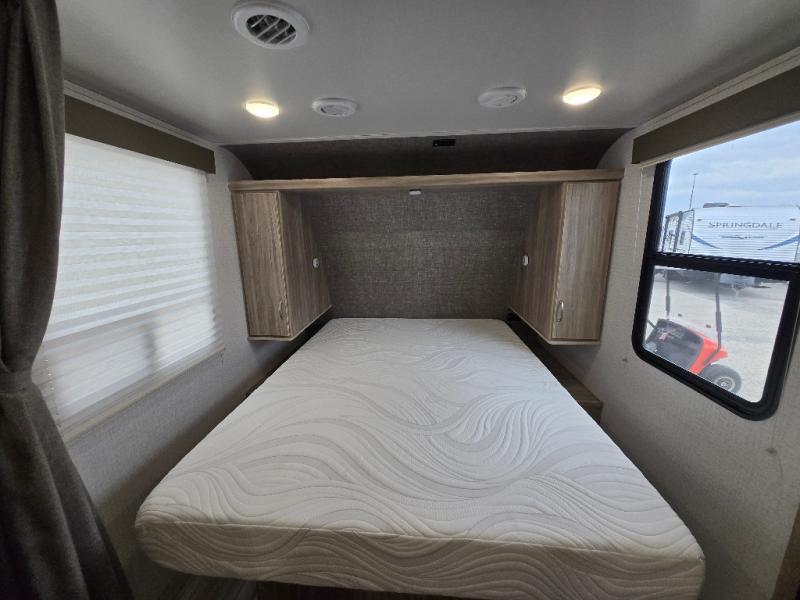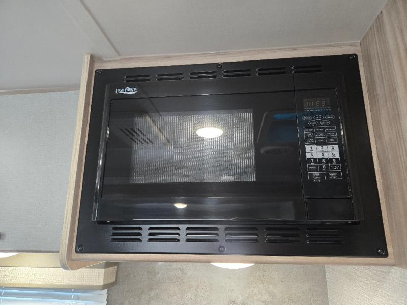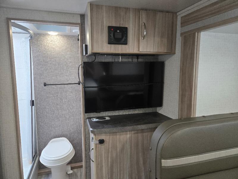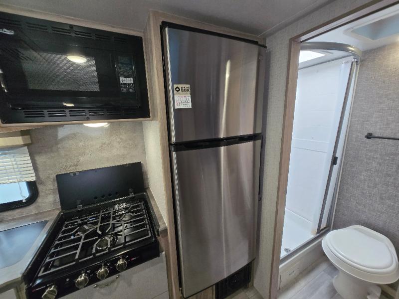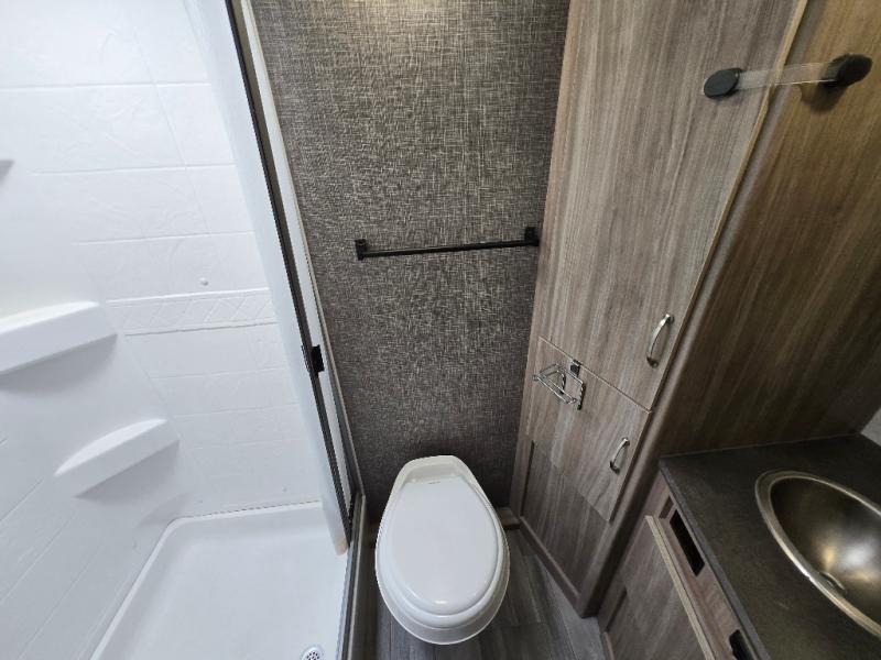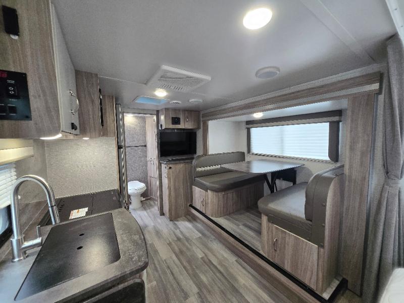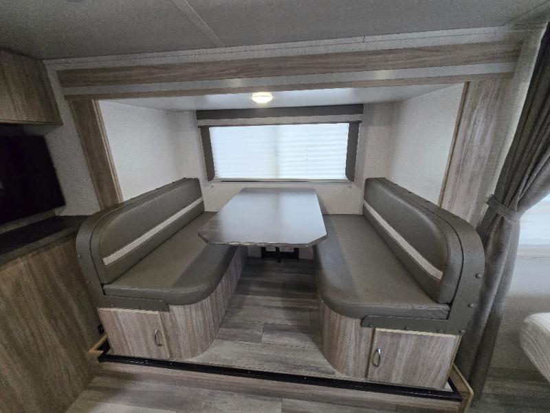Pack your bags and head to the campground with this travel trailer! You will love all that it has to offer from the full rear bathroom with a skylight above the shower and a wardrobe for your clothes and linens to the front 60" x 74" RV queen bed with a wardrobe on one side, a nightstand on the other, and a privacy curtain to draw at night. The 44" x 72" booth dinette slide is not only a great place to enjoy your meals at or play card games, but also to transform into an extra sleeping space if you want to bring along a guest. When you don't feel like making dinner, you can easily pop in some leftovers or a bag of popcorn into the microwave and relax while you watch a movie on the LED TV!