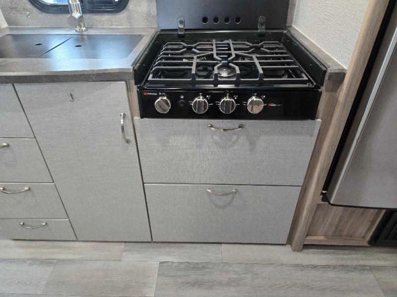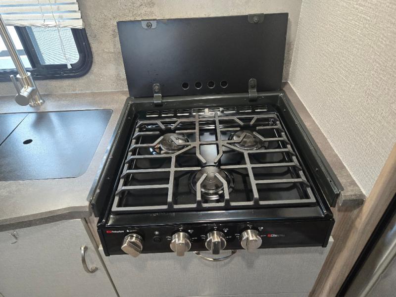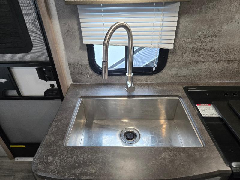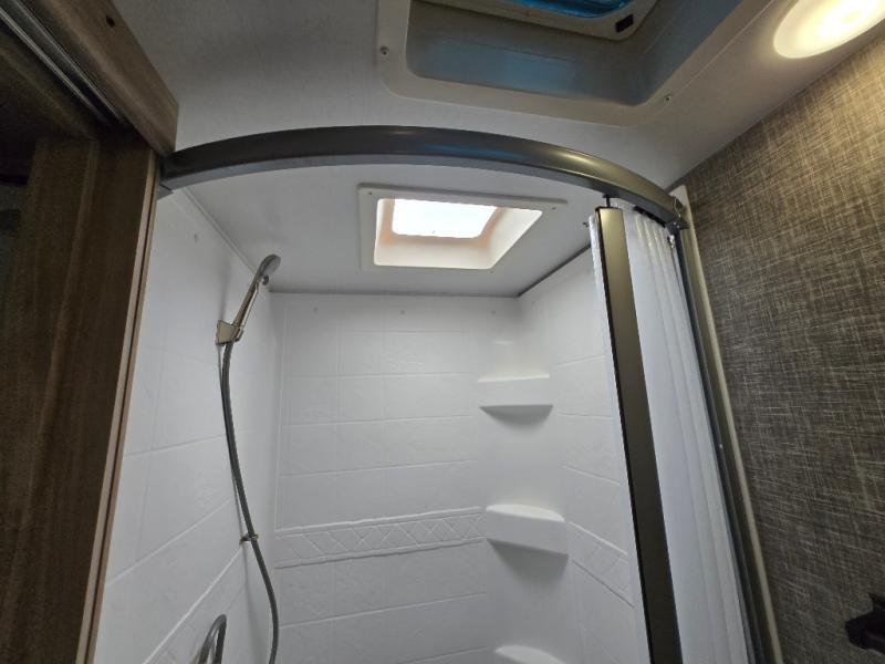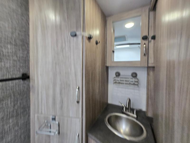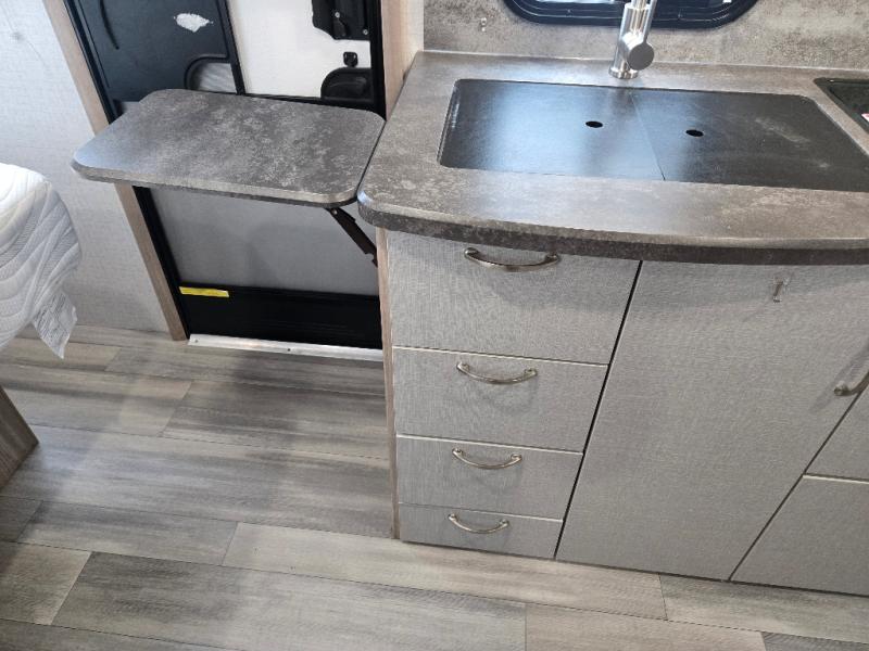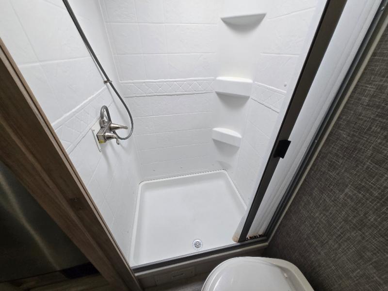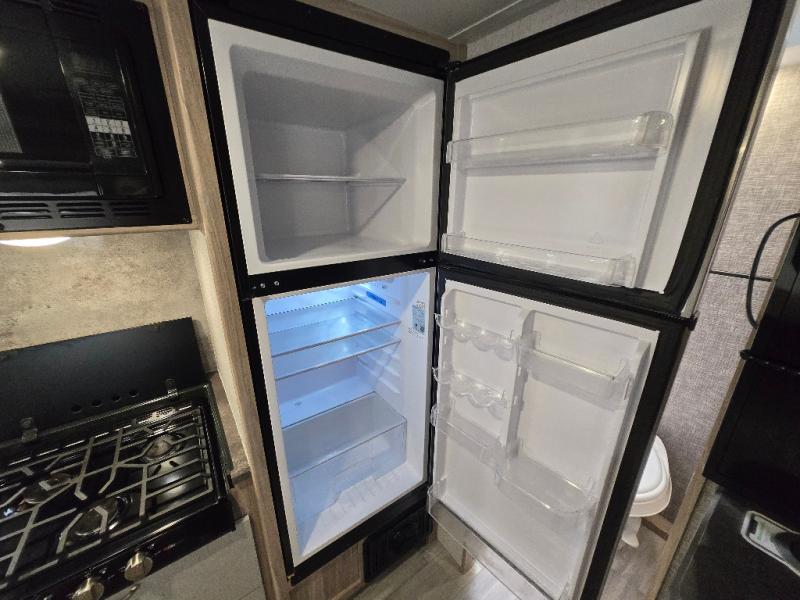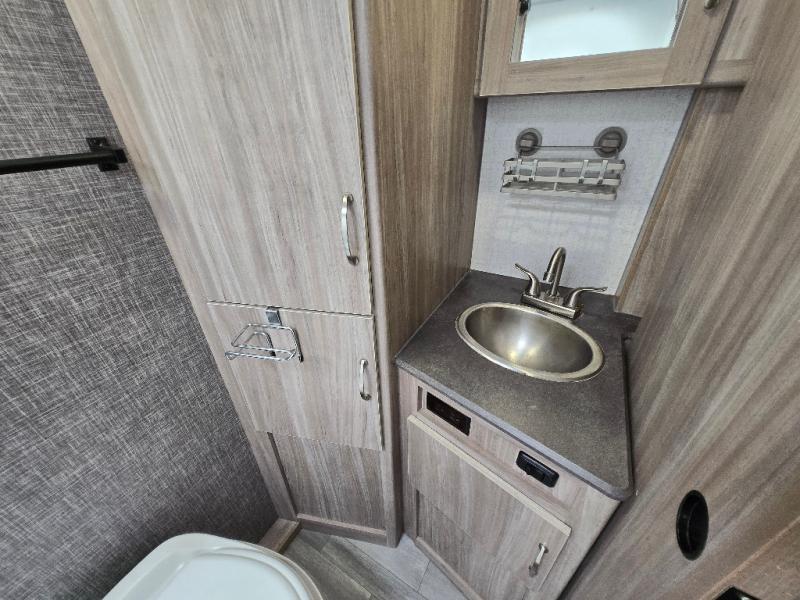 Pack your bags and head to the campground with this travel trailer! You will love all that it has to offer from the full rear bathroom with a skylight above the shower and a wardrobe for your clothes and linens to the front 60" x 74" RV queen bed with a wardrobe on one side, a nightstand on the other, and a privacy curtain to draw at night. The 44" x 72" booth dinette slide is not only a great place to enjoy your meals at or play card games, but also to transform into an extra sleeping space if you want to bring along a guest. When you don't feel like making dinner, you can easily pop in some leftovers or a bag of popcorn into the microwave and relax while you watch a movie on the LED TV!